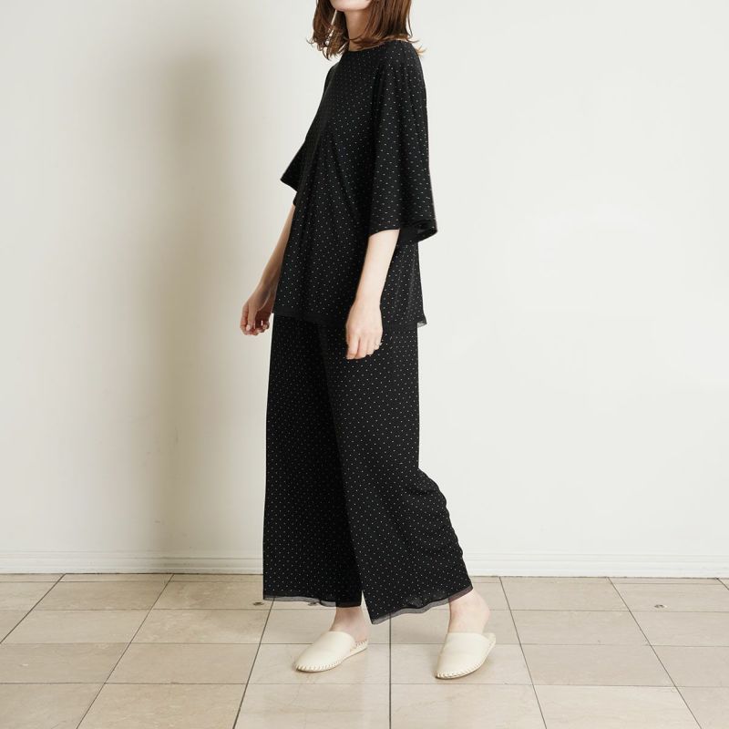 接触冷感のある、夏におすすめのベンベルグ素材。吸放湿性がありべたつきにくく蒸れにくい、サラッとした着用感が魅力です。細やかなドット柄と自然な落ち感が美しいラインを作り、上品な印象に。快適さと高級感を兼ね備えたこだわりのルームウェアシリーズ。