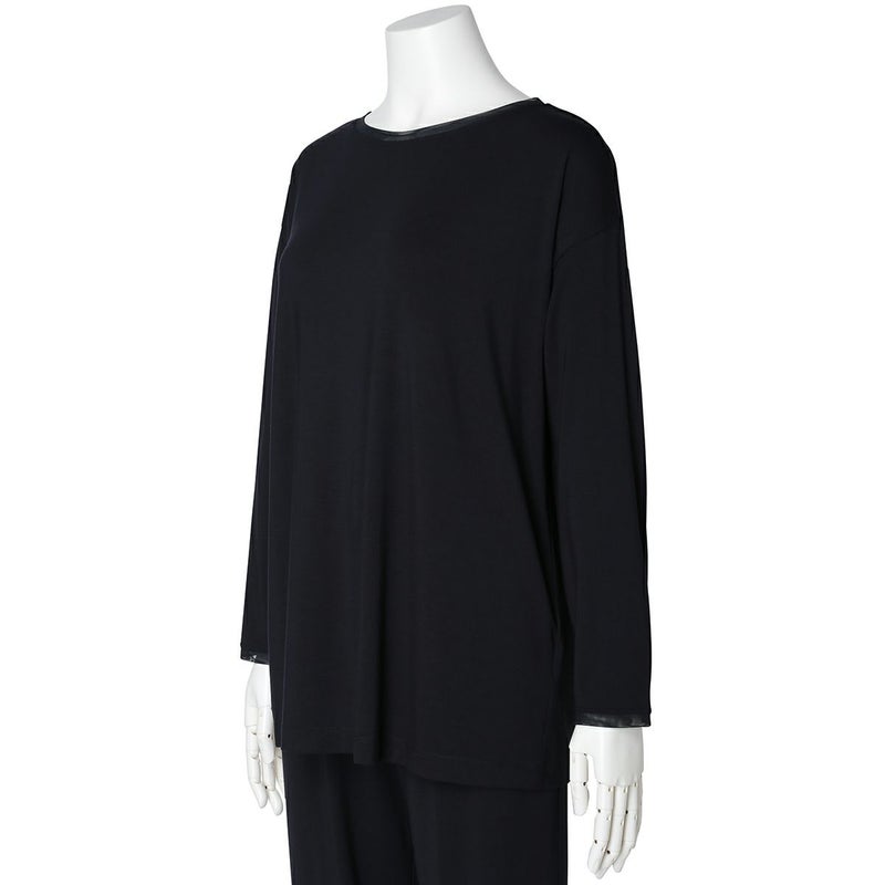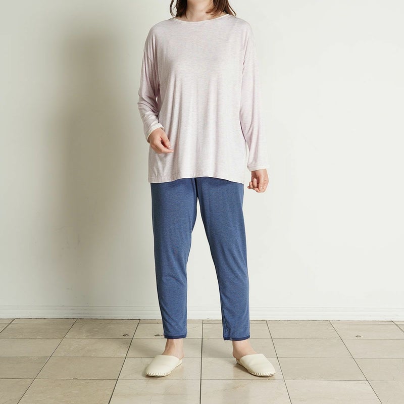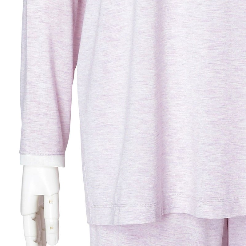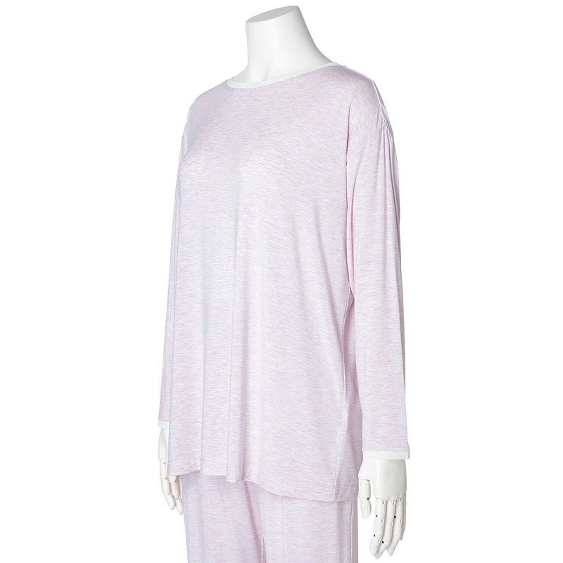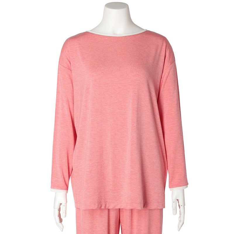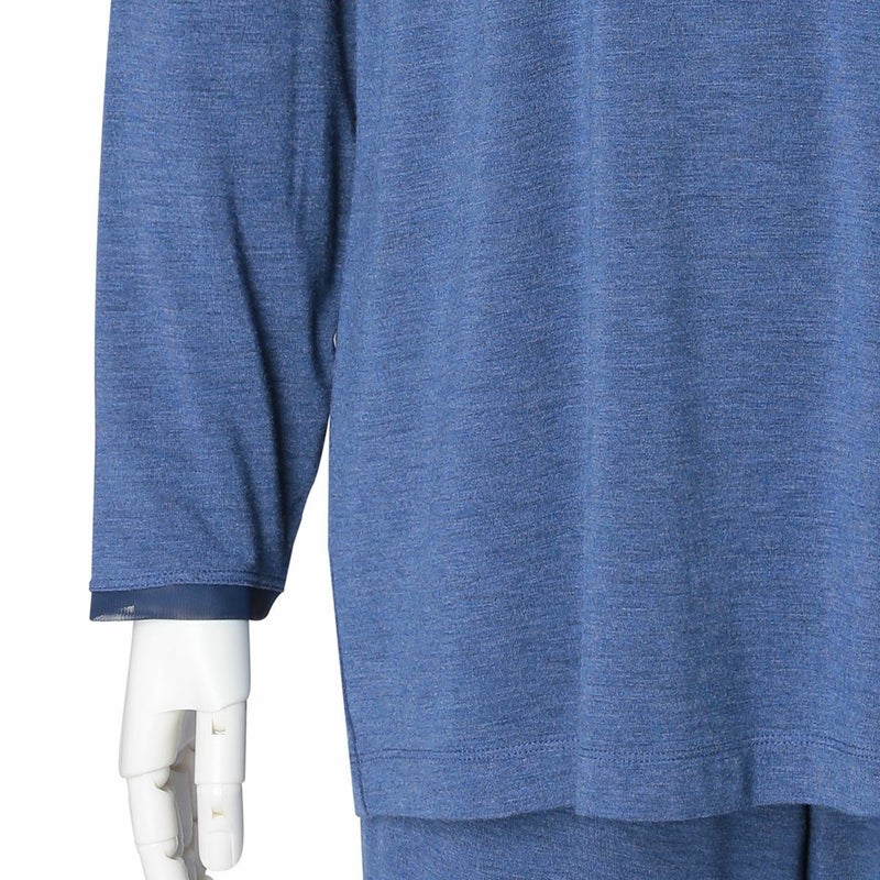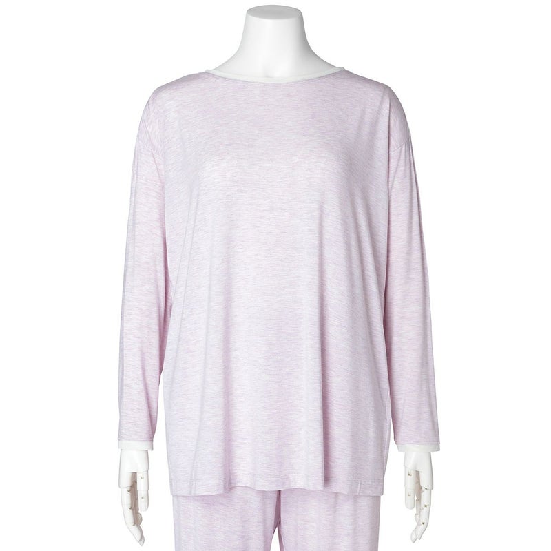 自然な落ち感が美しいシルエットの長袖トップスは、ゆったりとした身幅で着脱もしやすくストレスフリーな着心地が魅力です。トレンド感のあるドロップショルダーでこなれた印象に。襟ぐりと袖口に施した透け感のあるパワーネットがデザインのアクセント。同素材のボトムス(KRCP513/KRCP613)とのコーディネートがおすすめです。