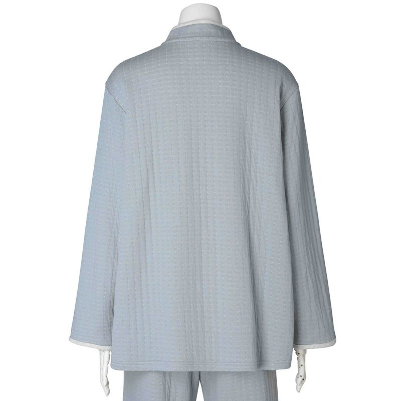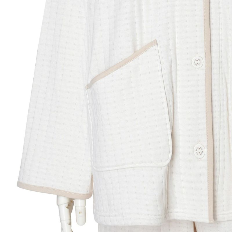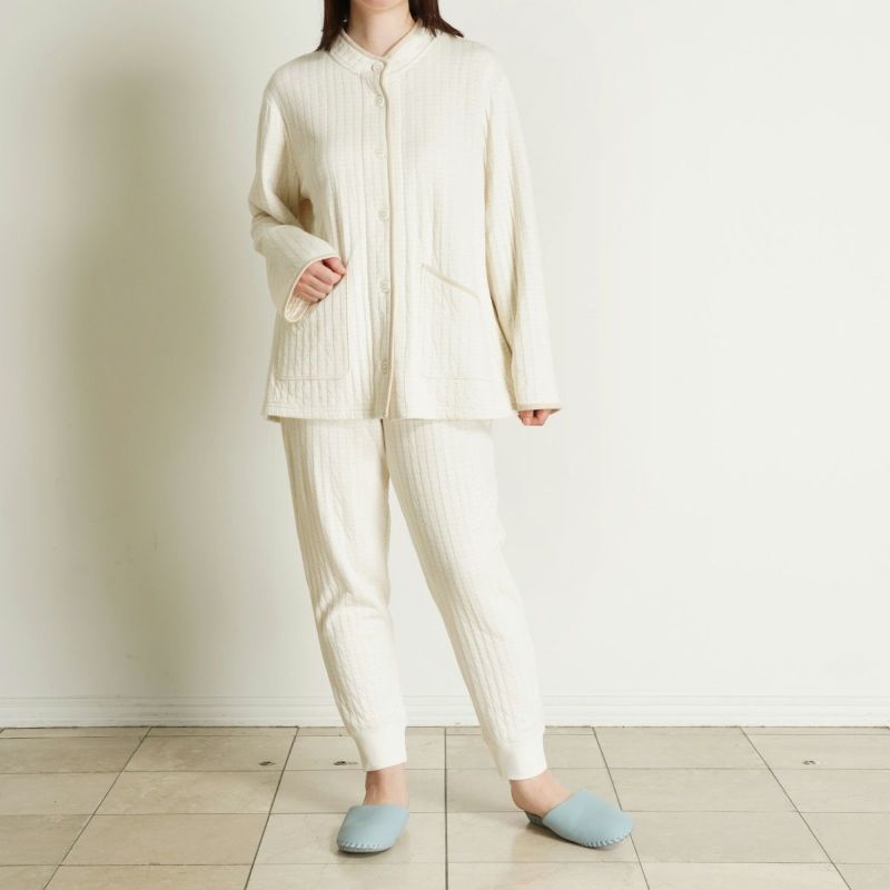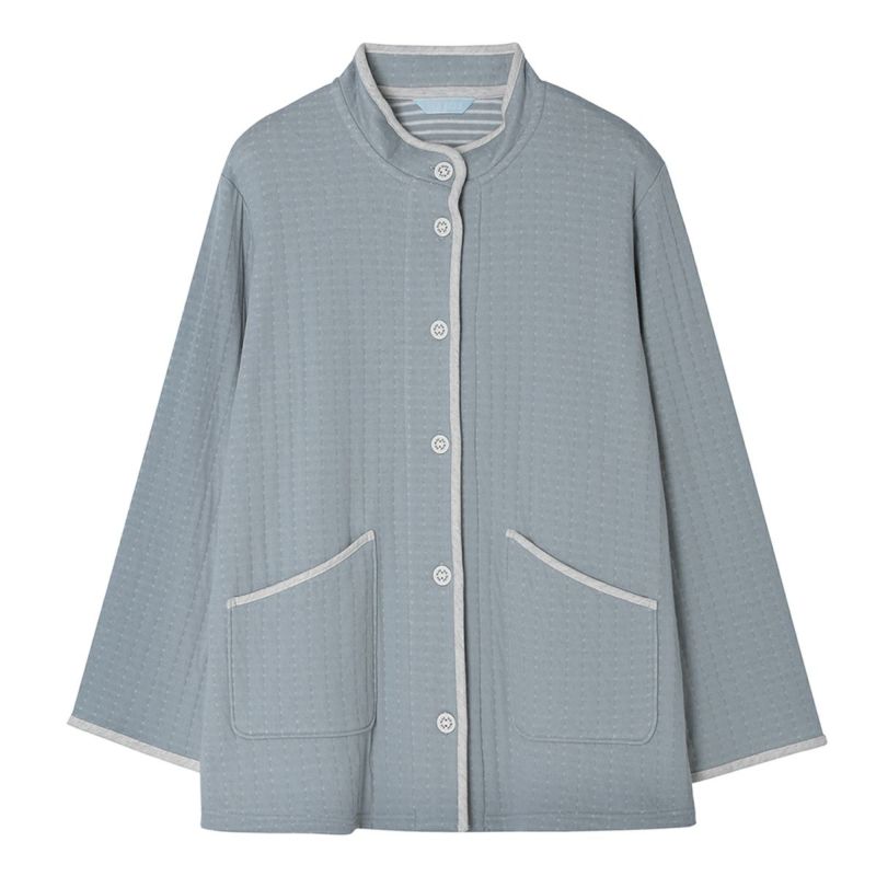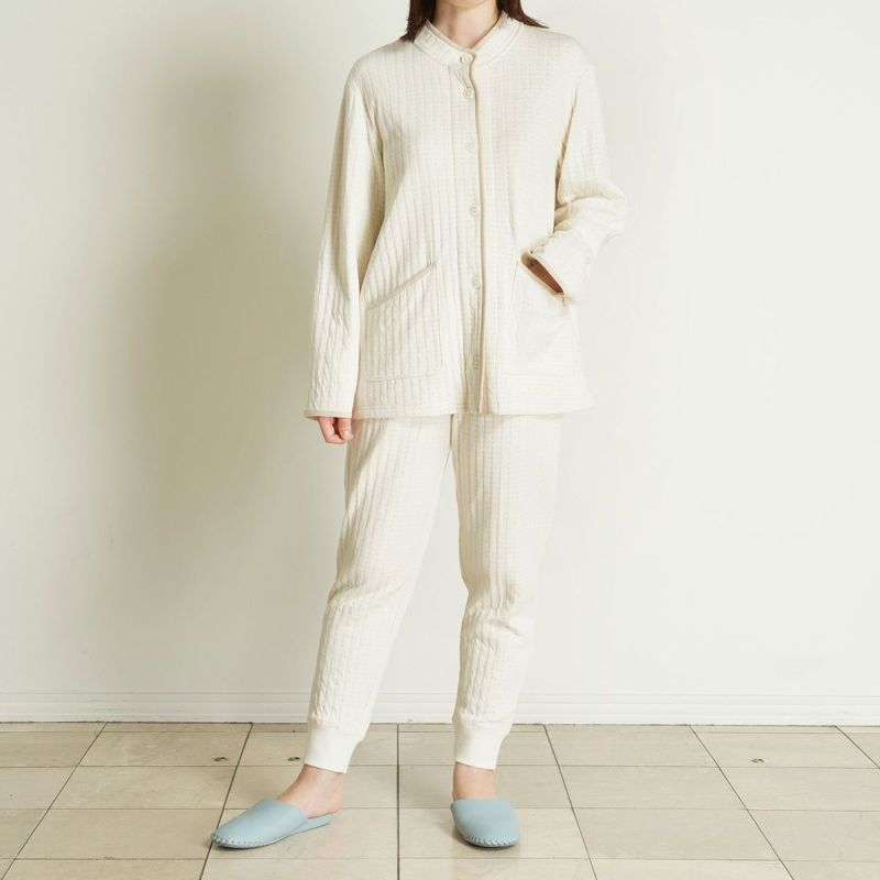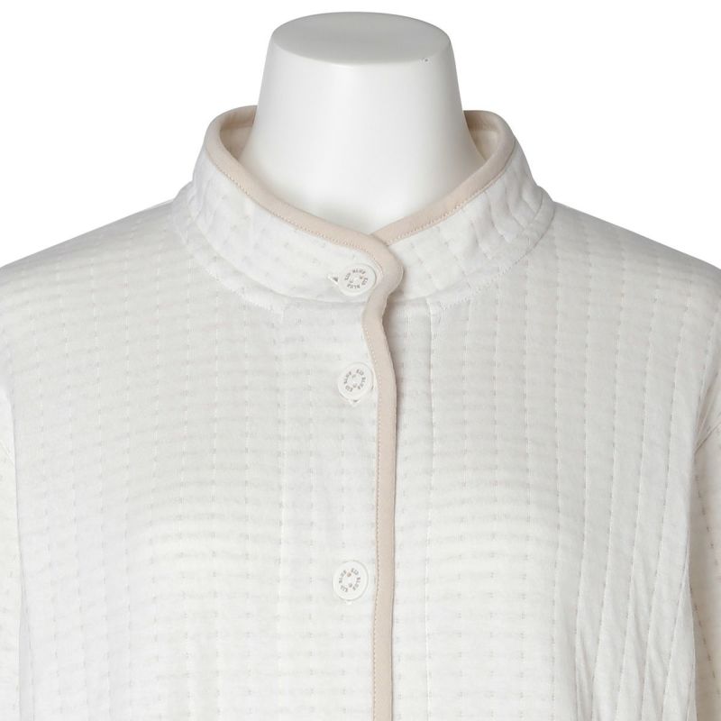 ほどよい厚みのキルト仕立ては、軽やかでありながらもあたたかく、季節の変わり目や薄手防寒にぴったり。生地の表側と肌側、中糸にも綿糸を使用したオールコットン。ナチュラルな優しい色味に裏側のボーダー柄がアクセント。接結部分からさりげなくのぞき、おしゃれな雰囲気を添えます。