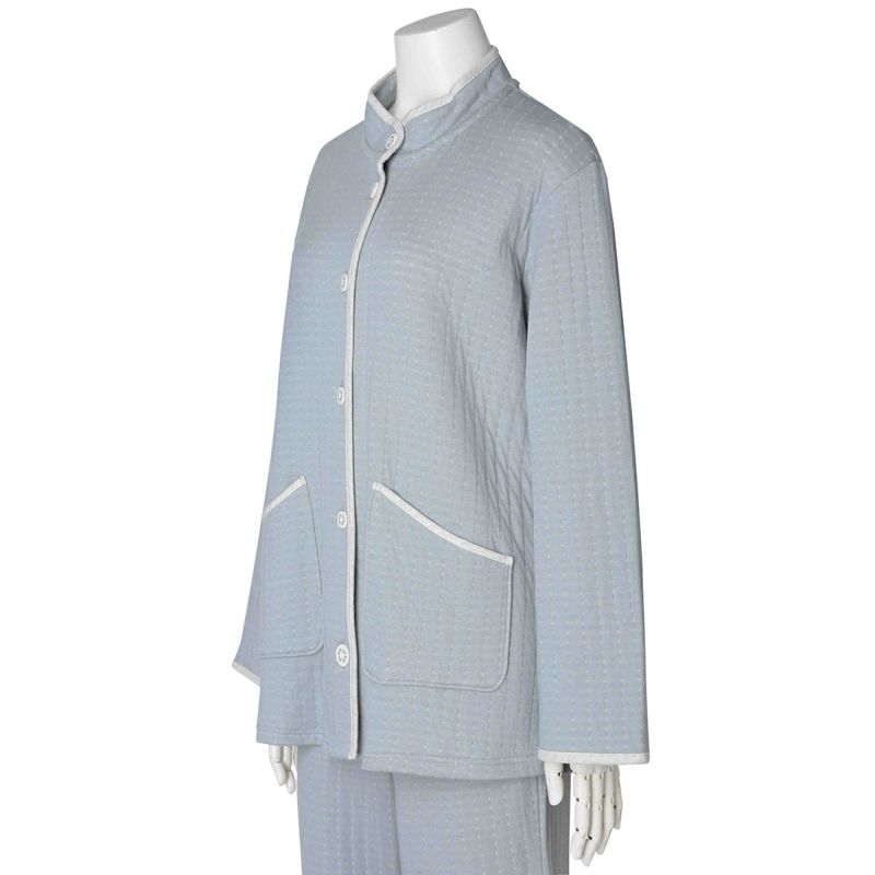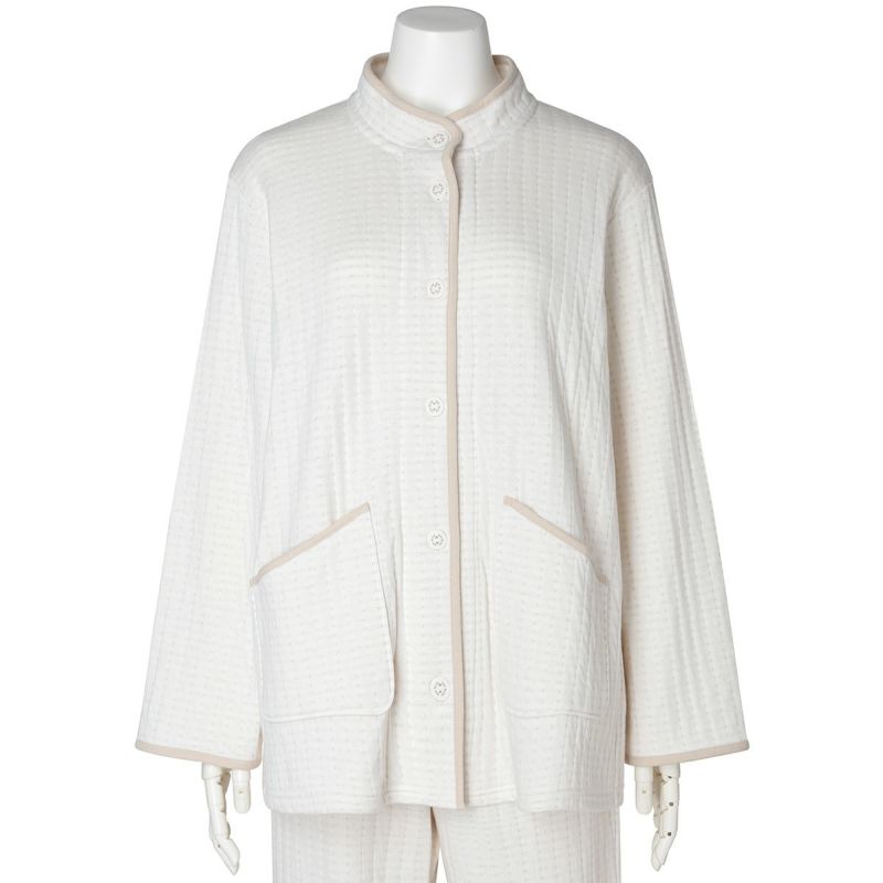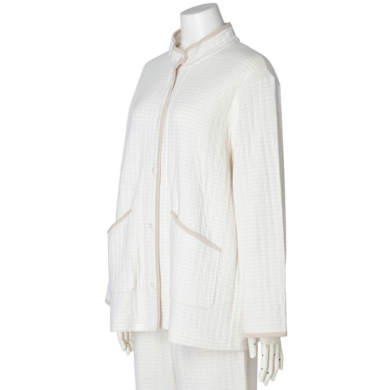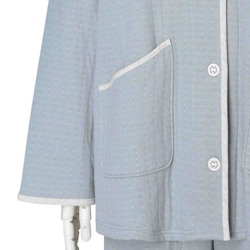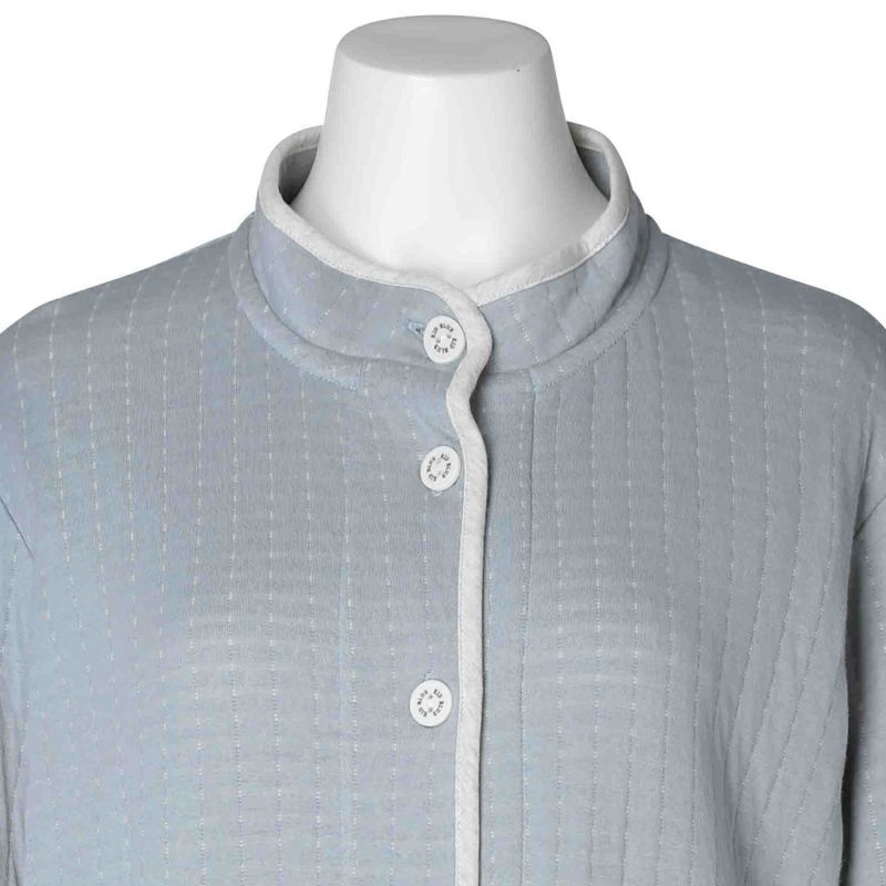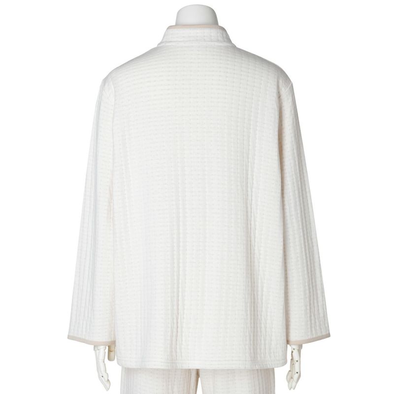 ほどよい厚みのキルト仕立ては、軽やかでありながらもあたたかく、季節の変わり目や薄手防寒にぴったり。生地の表側と肌側、中糸にも綿糸を使用したオールコットン。ナチュラルな優しい色味に裏側のボーダー柄がアクセント。接結部分からさりげなくのぞき、おしゃれな雰囲気を添えます。