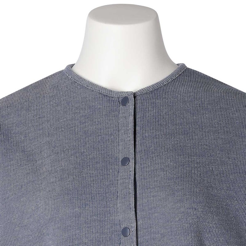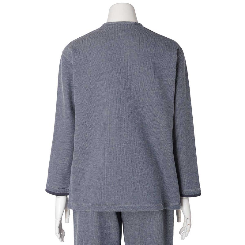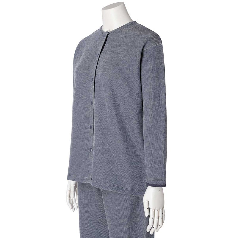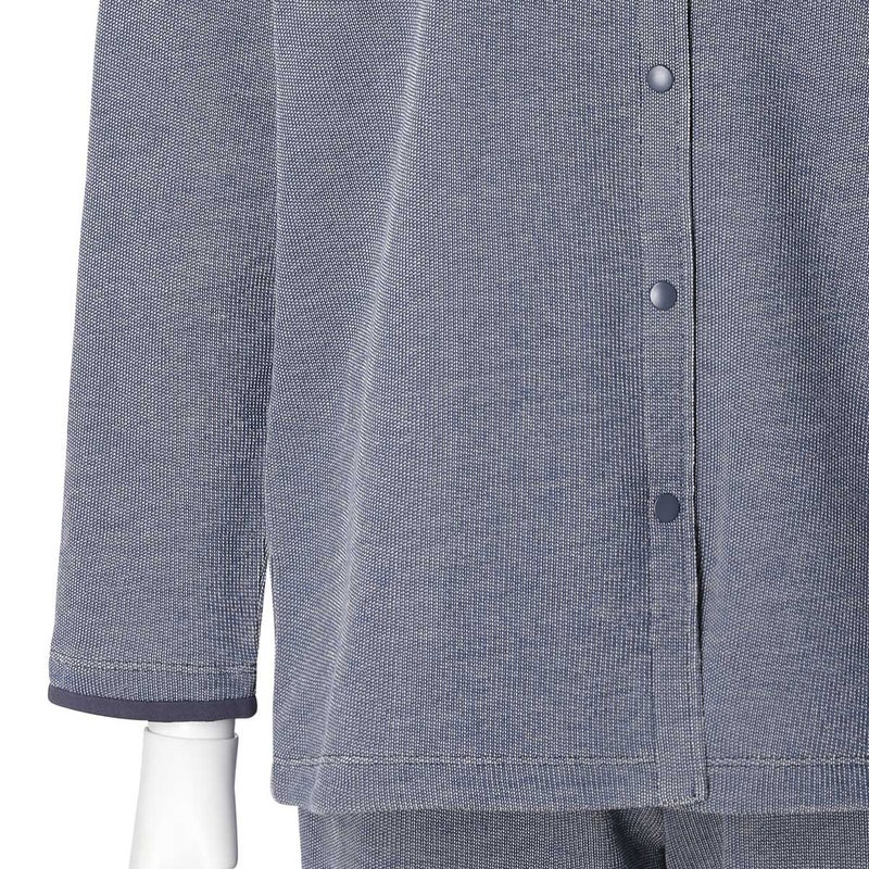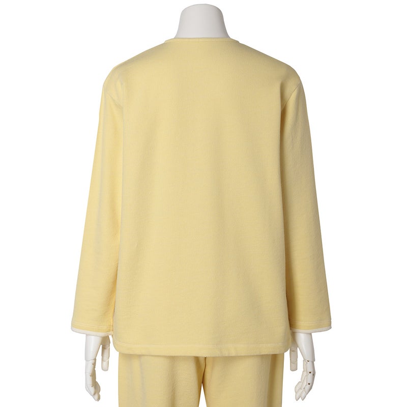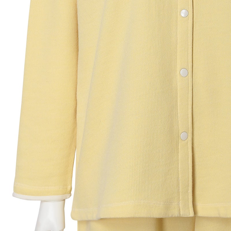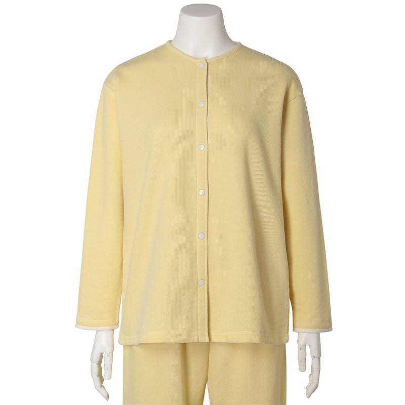 ワンマイルにも着用できる長袖カーディガン。スナップボタンが特徴です。袖口と折り返し面の別布仕様がアクセント。同素材のボトム(KUDP522)や26ワッフルミモザ(KRDP515)とのコーディネイトがおすすめです。