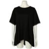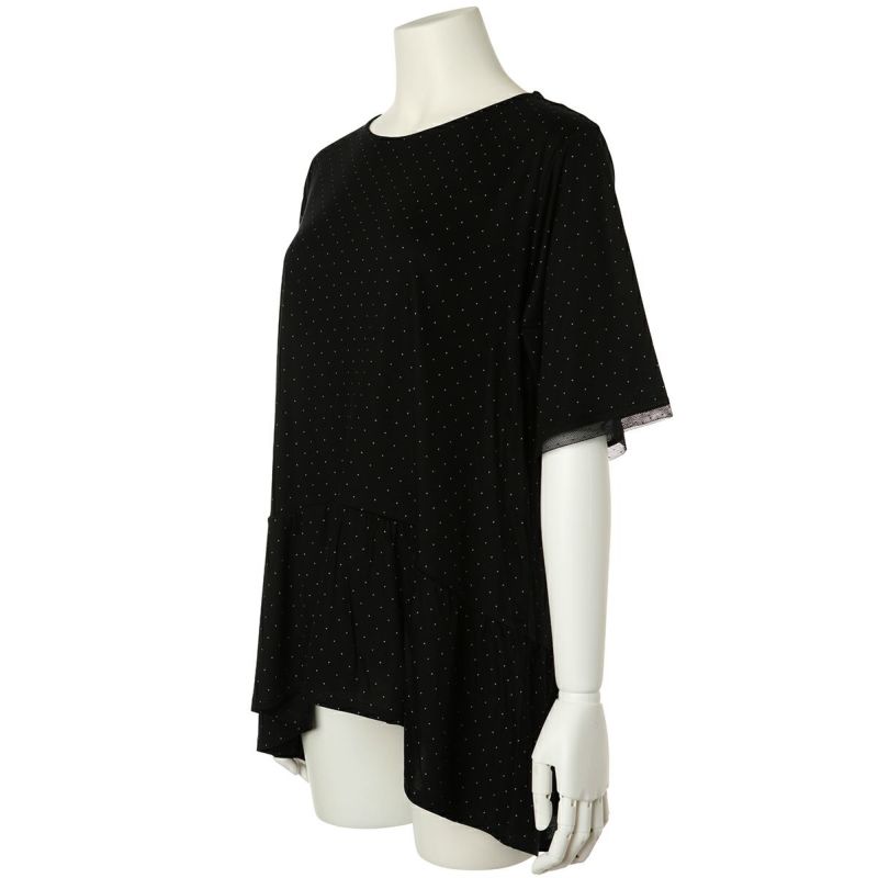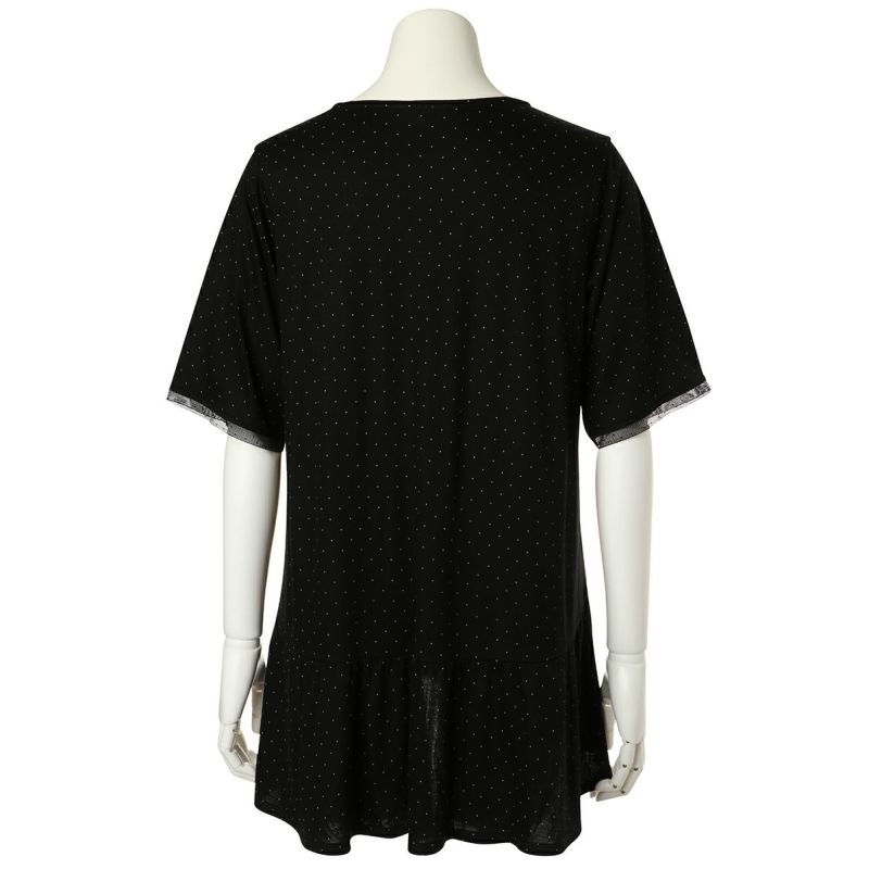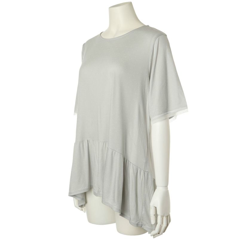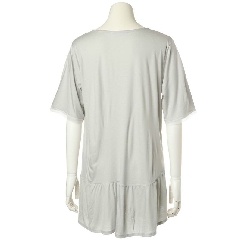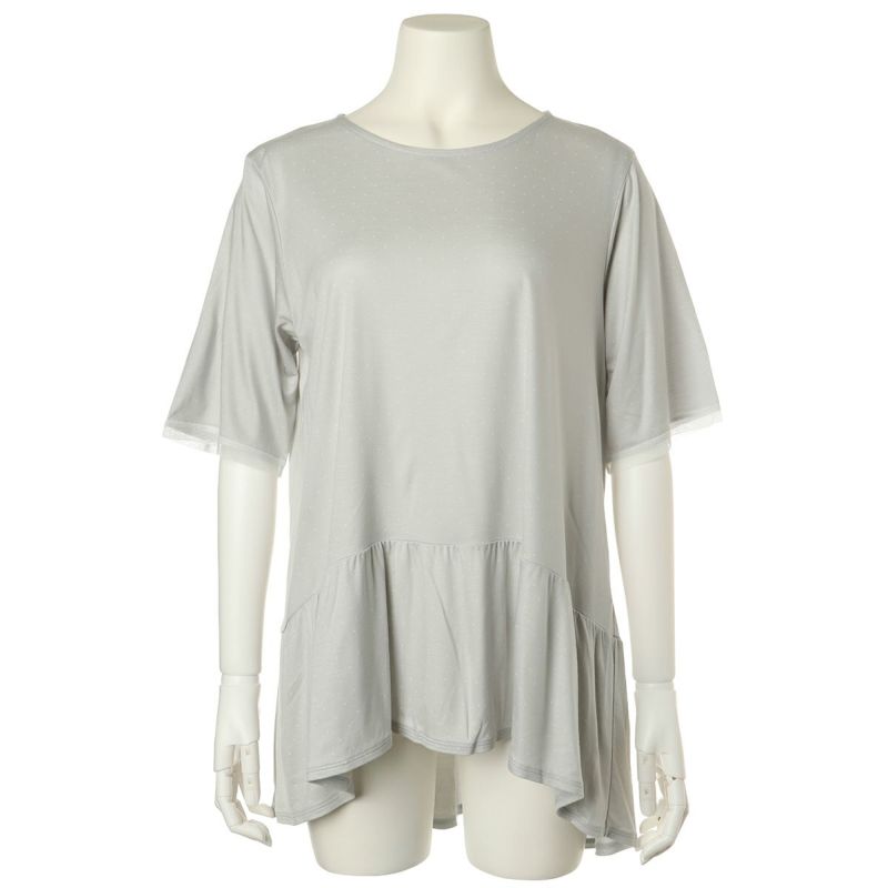 五分袖トップスは、裾に前後差をつけたティアードデザイン。お尻が隠れるチュニック丈でスタイルカバー効果も◎