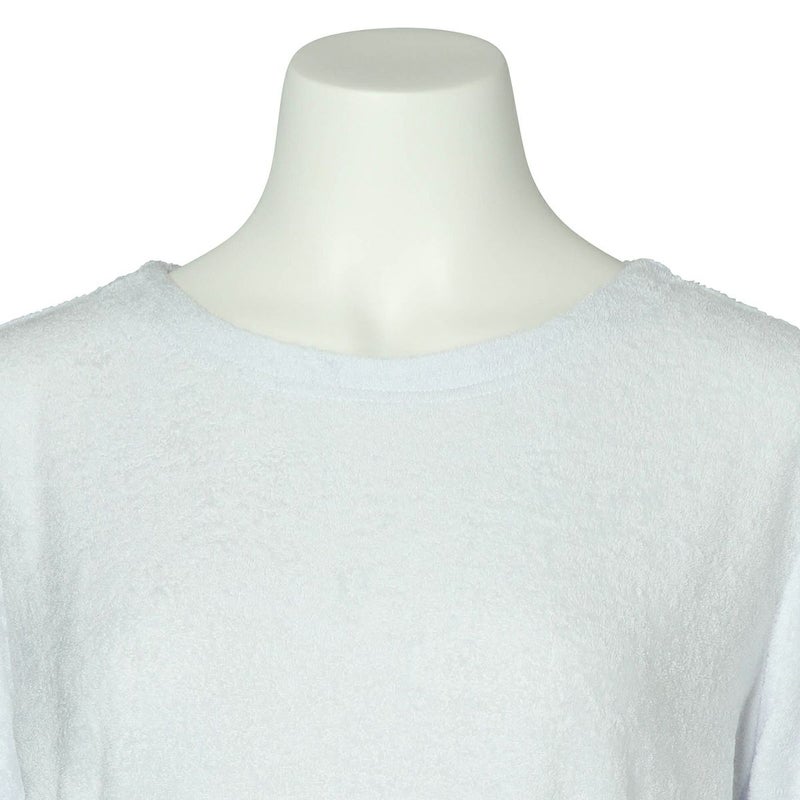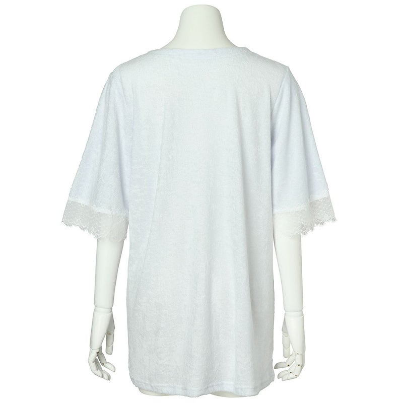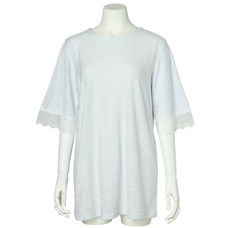 六分袖トップスは、ゆったりめのサイジング。レースをあしらった袖口は、夏らしい透け感で肘が隠れる6分袖でも重たくならないデザイン。「パイルアベリアブーケPt」とのクロスコーデがおすすめ。