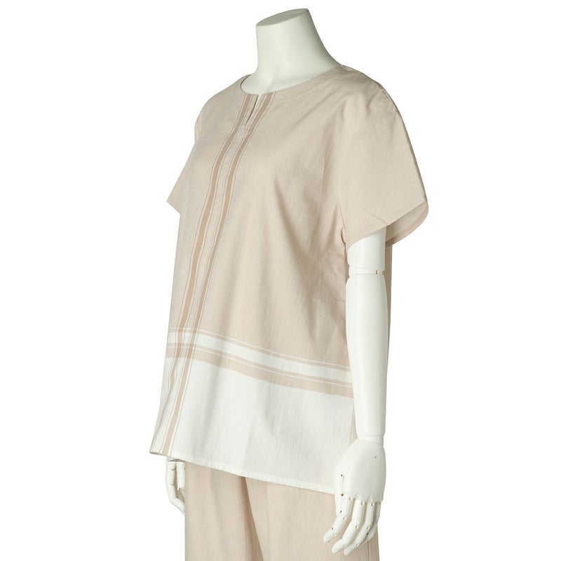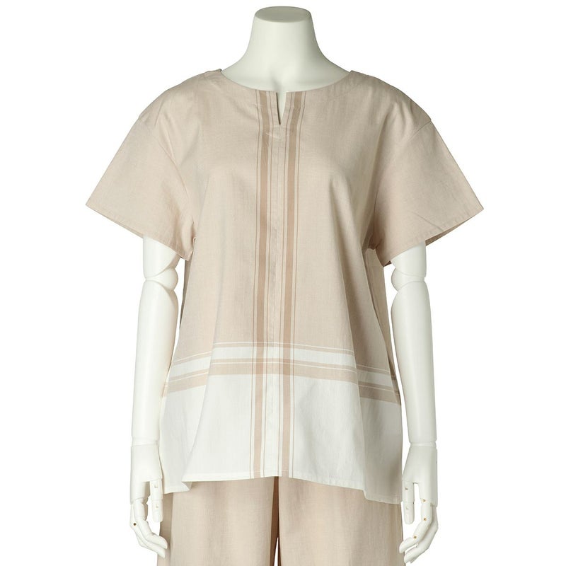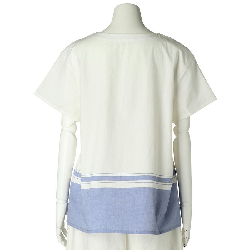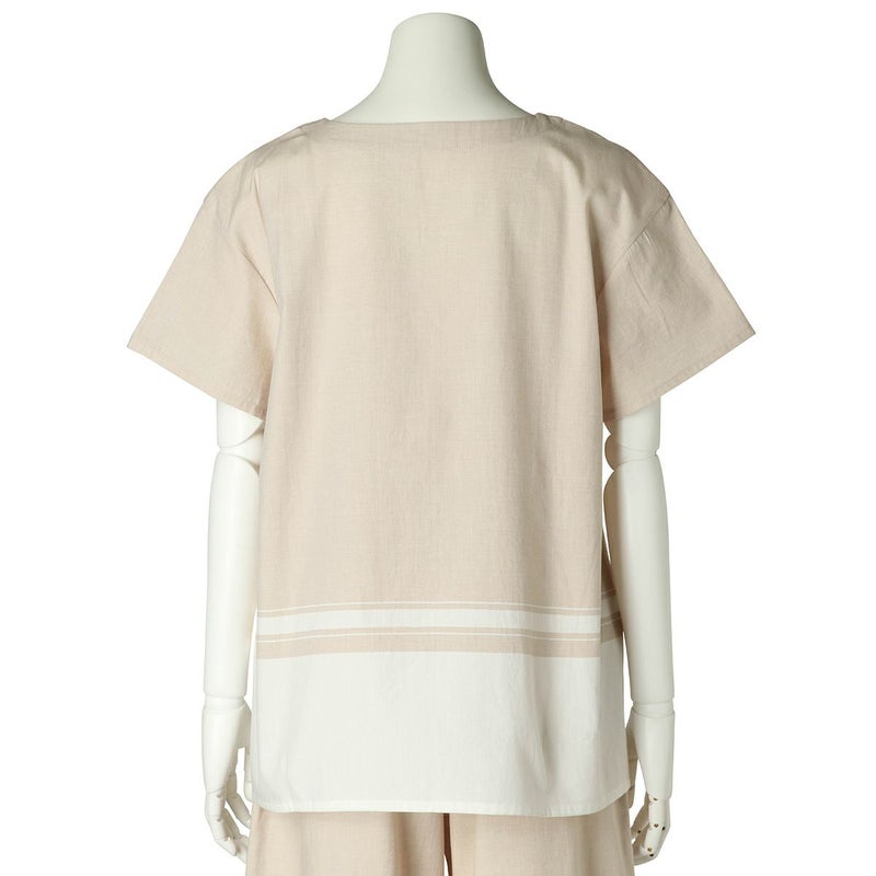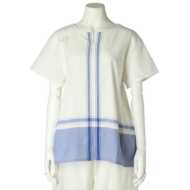 半袖トップスは、スリットネックのブラウス風デザイン。裾の配色パネルボーダーがデザインポイント。