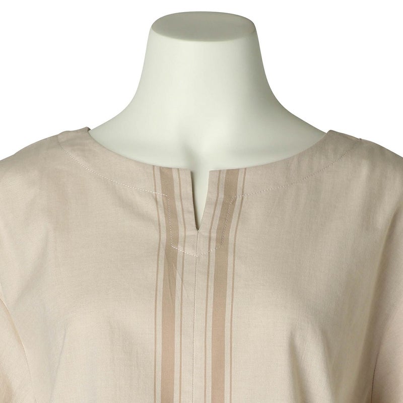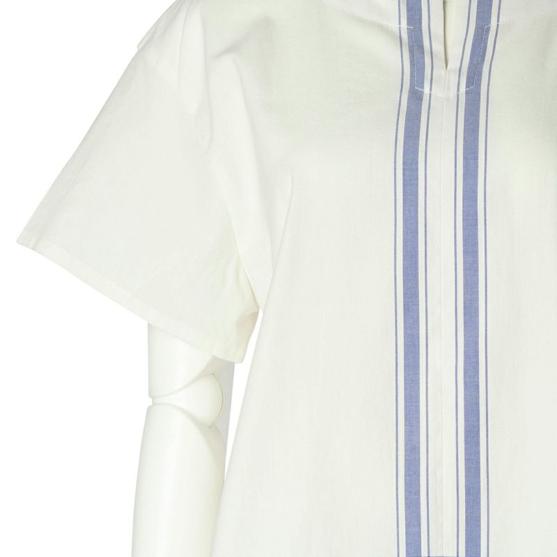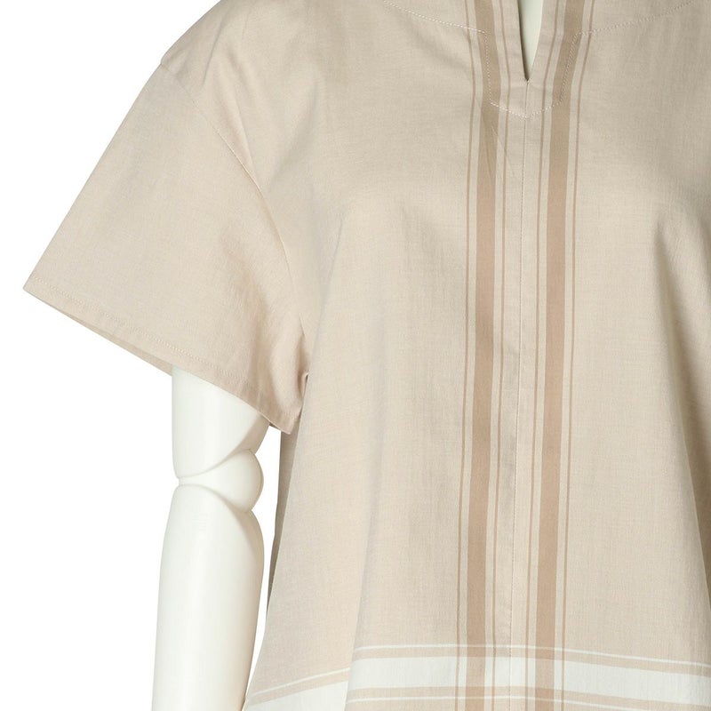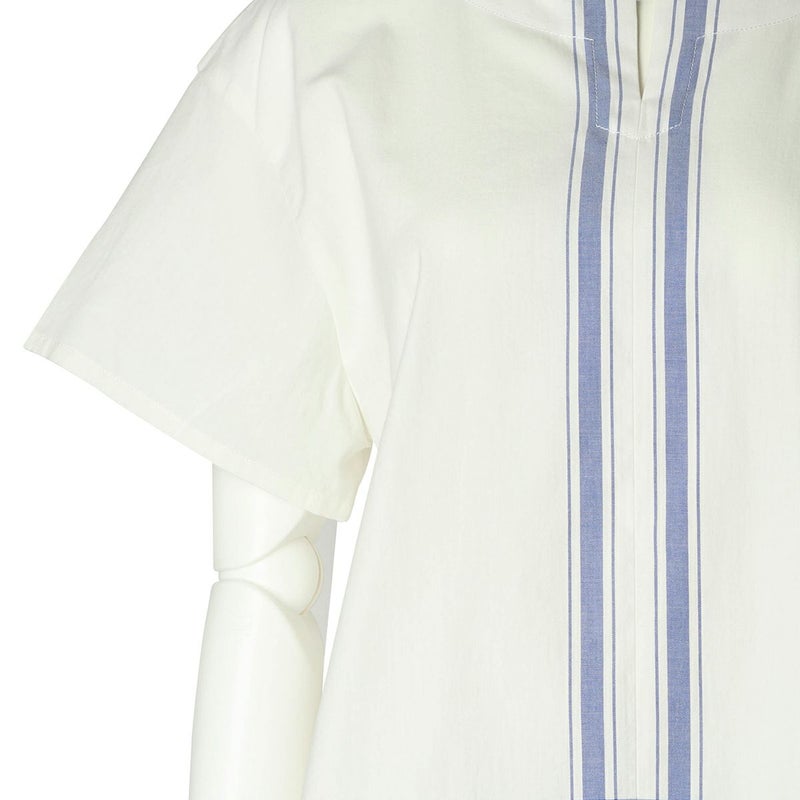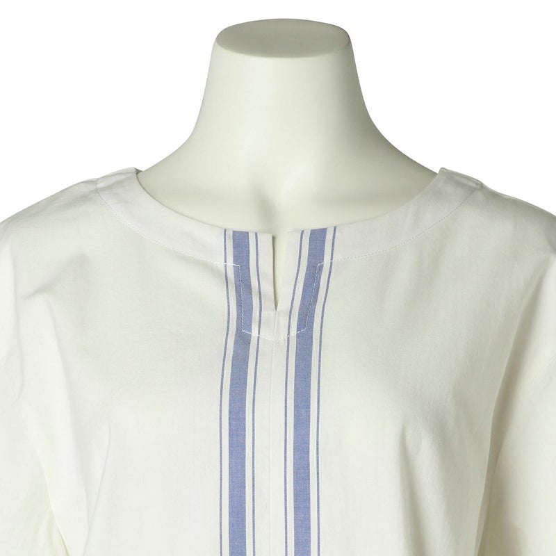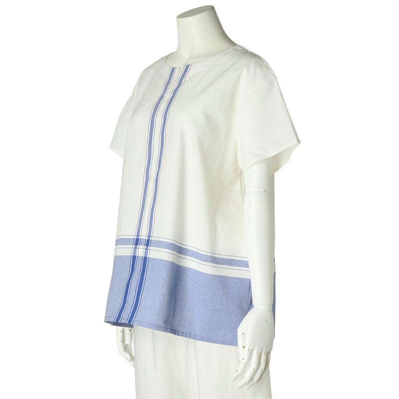 半袖トップスは、スリットネックのブラウス風デザイン。裾の配色パネルボーダーがデザインポイント。