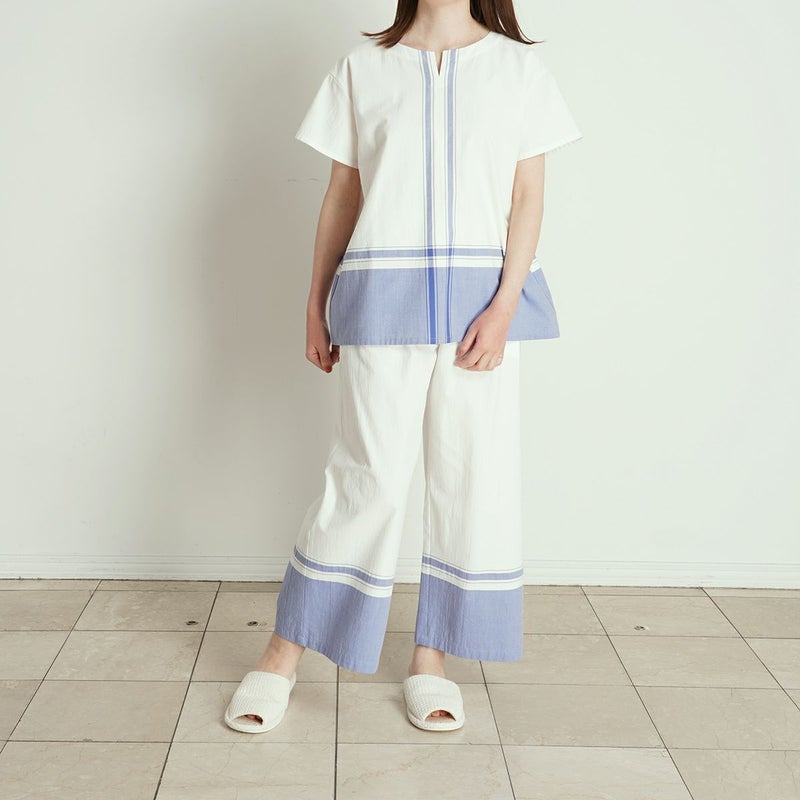 先染めのパネル柄を施したリラクシングウェアシリーズ。程よい厚みで透けにくい綾織り生地にワッシャー加工をし、しなやかさとナチュラル感のある素材。