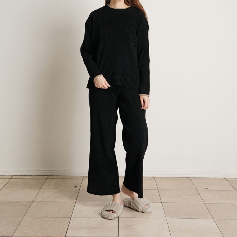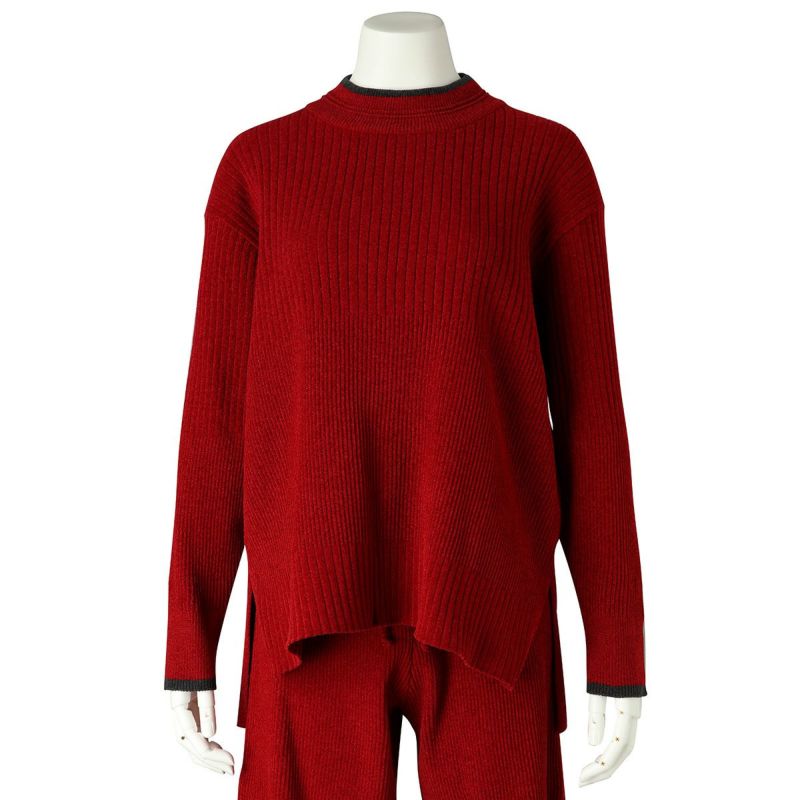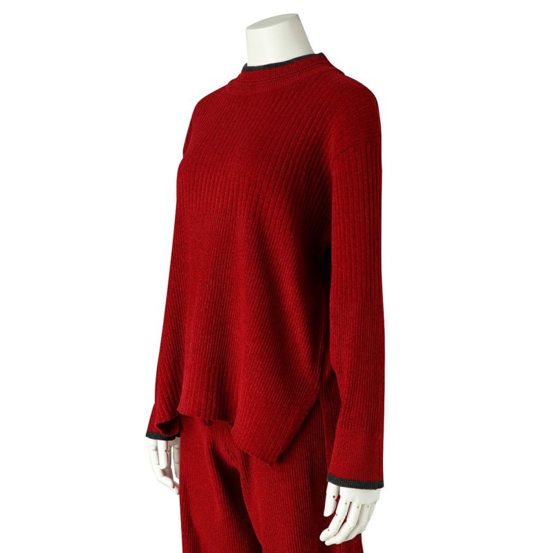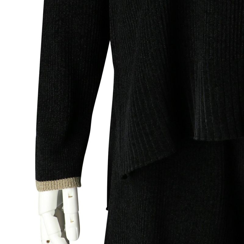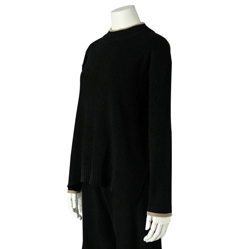 ベロアのような肌触りの、毛足の短いモールヤーン。幅の違うリブの編み地をランダムに組み合わせた、デザイン性のあるニットで軽い着心地が◎