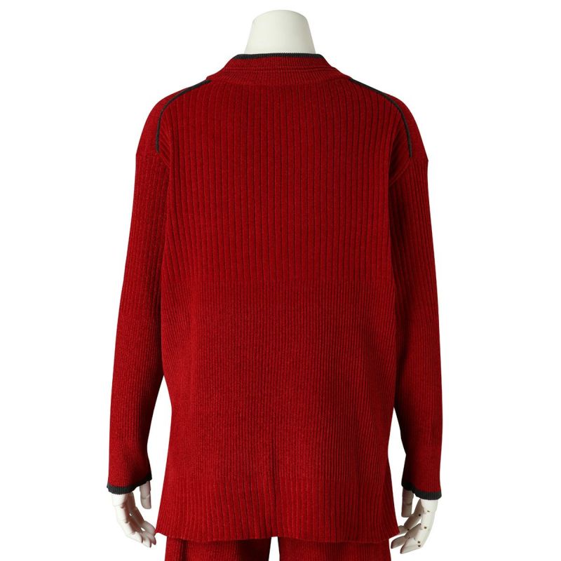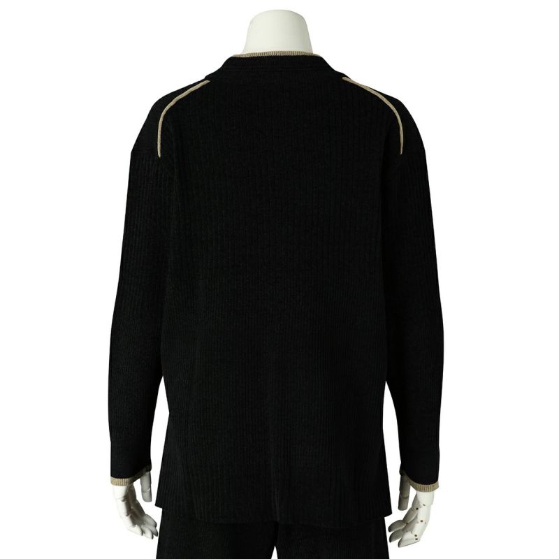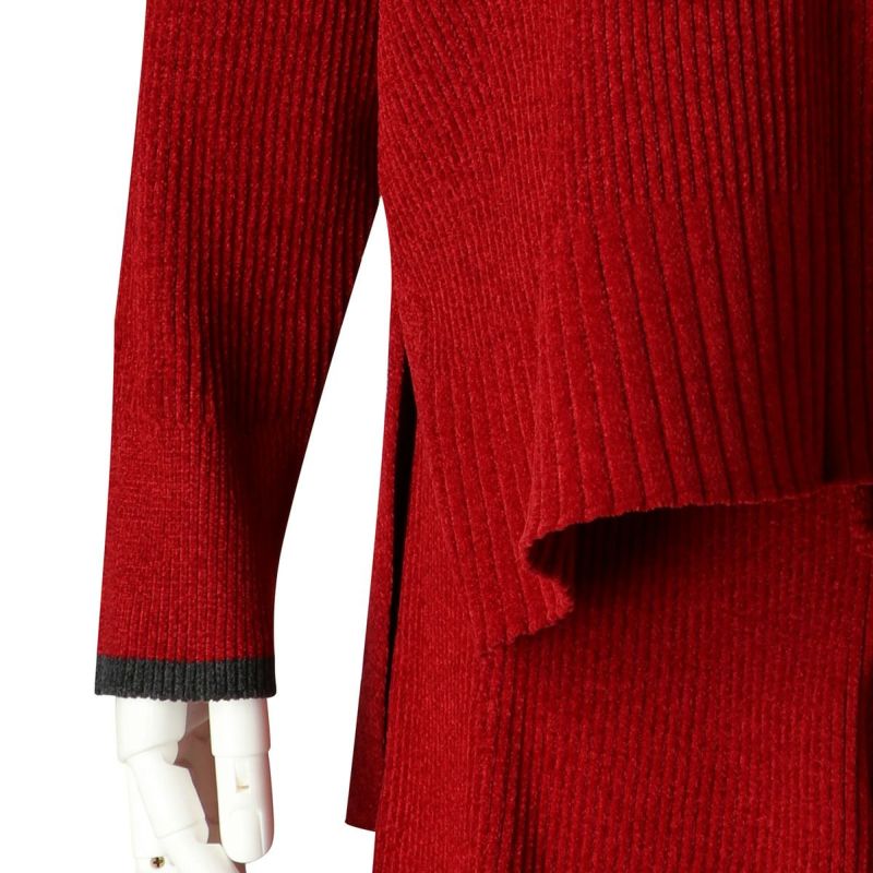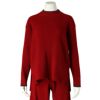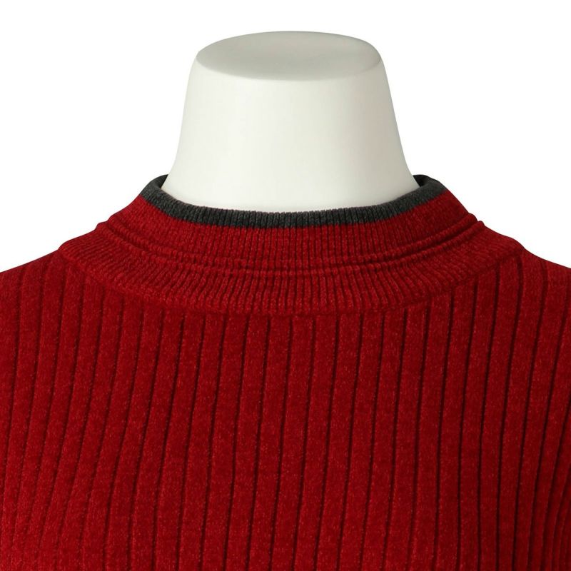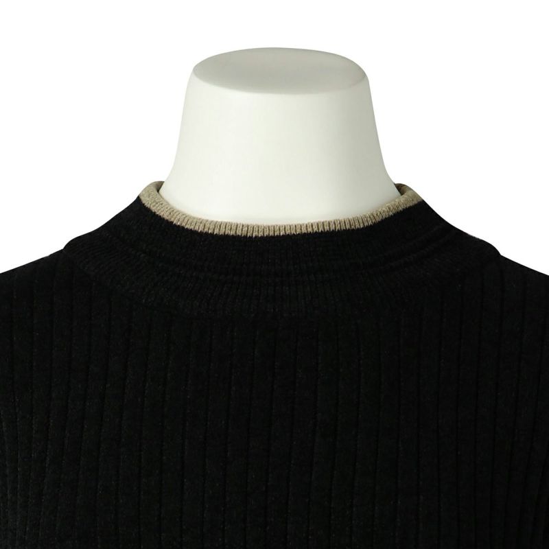 ベロアのような肌触りの、毛足の短いモールヤーン。幅の違うリブの編み地をランダムに組み合わせた、デザイン性のあるニットで軽い着心地が◎