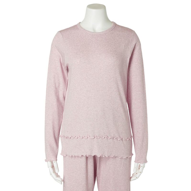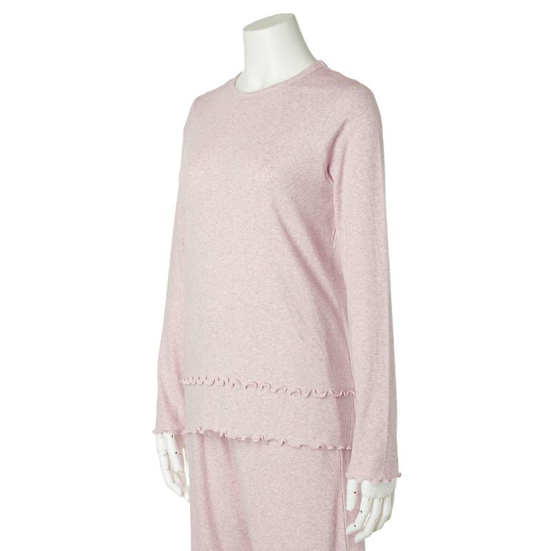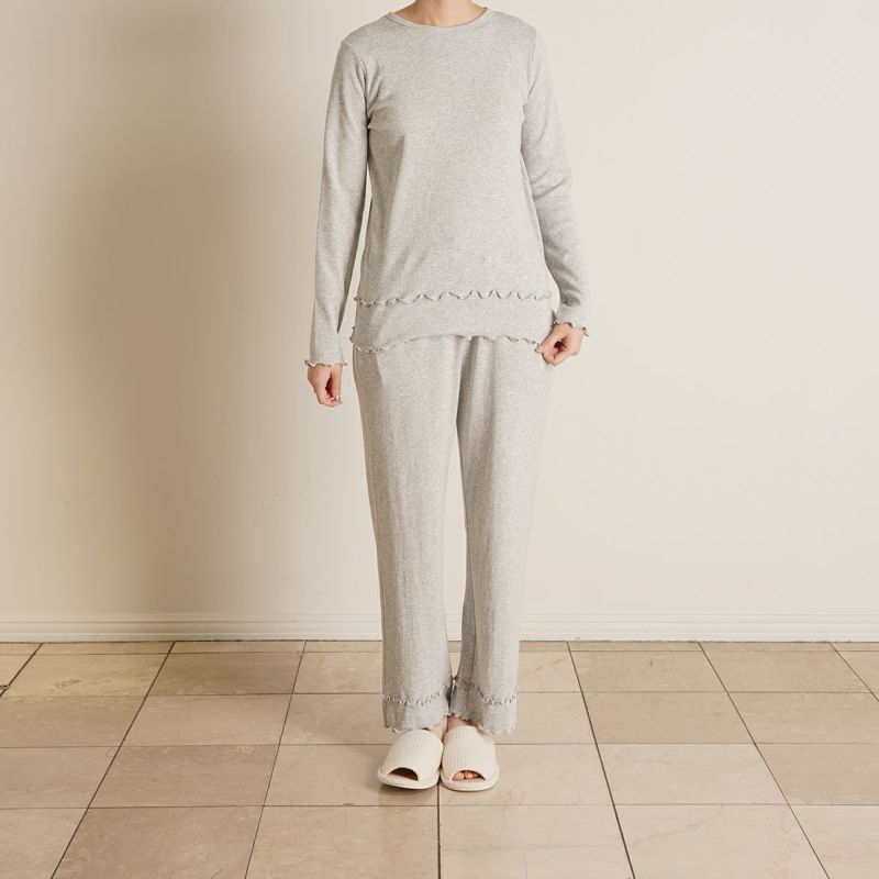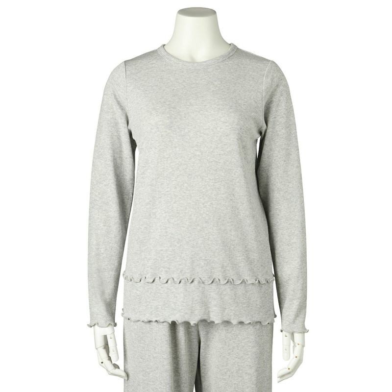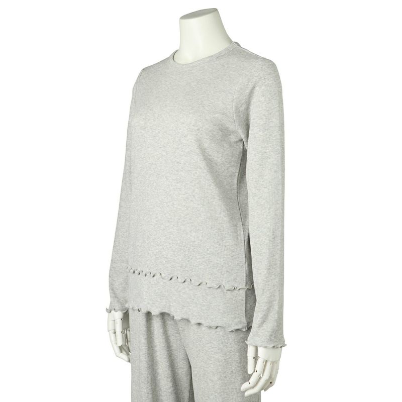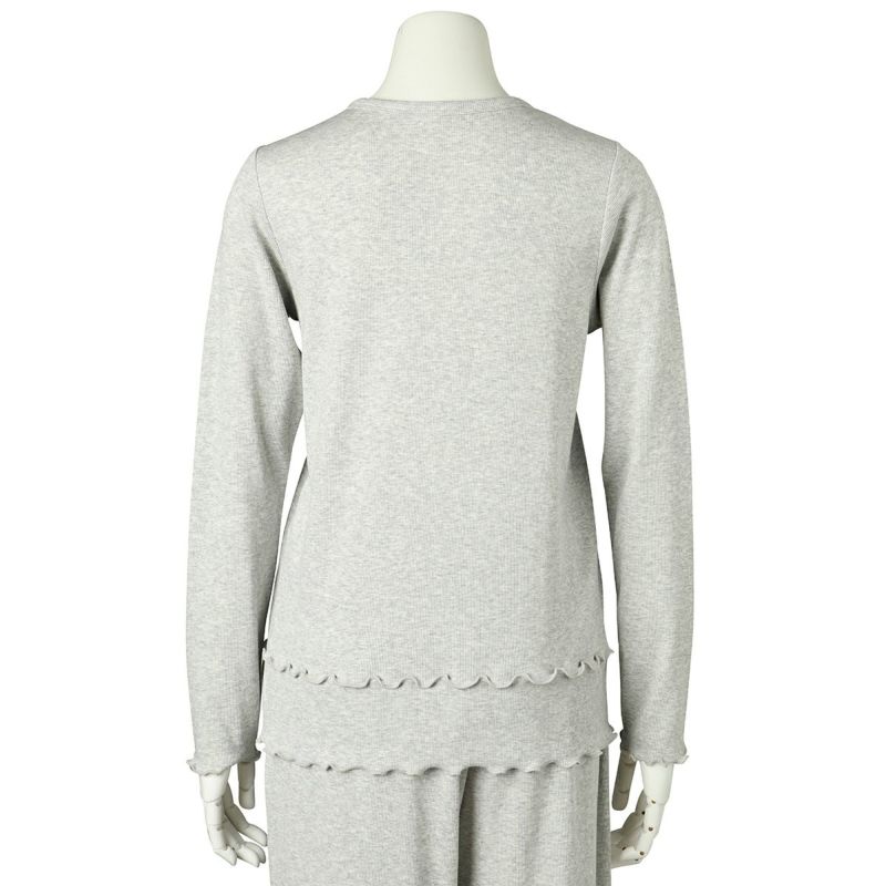 長袖トップスは、裾や袖口にあしらったメロウを効かせたデザイン。シンプルで使いやすいシルエット。