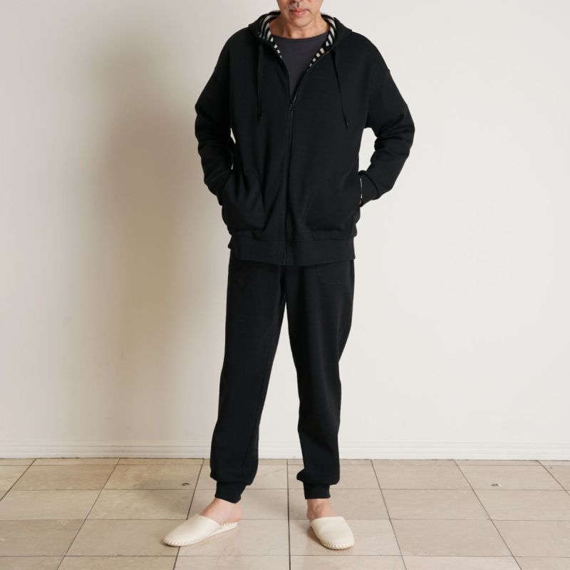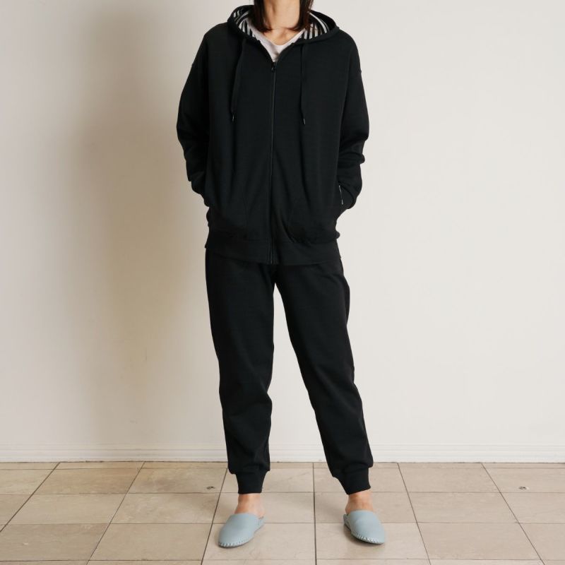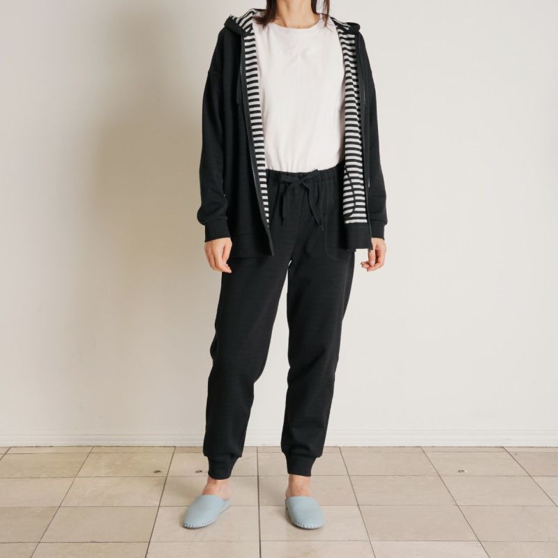 肌にあたる部分はコットンの新素材のダンボールニットシリーズ。二枚の生地を中糸で繋いだ二層構造にし中空構造のため見た目よりも軽く、適度なハリ感と着心地の良さが特徴です。ベーシックで着まわしやすいデザインとブラックとグレーのどんなアイテムともあわせやすい色展開。
