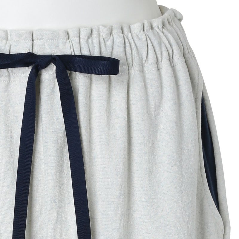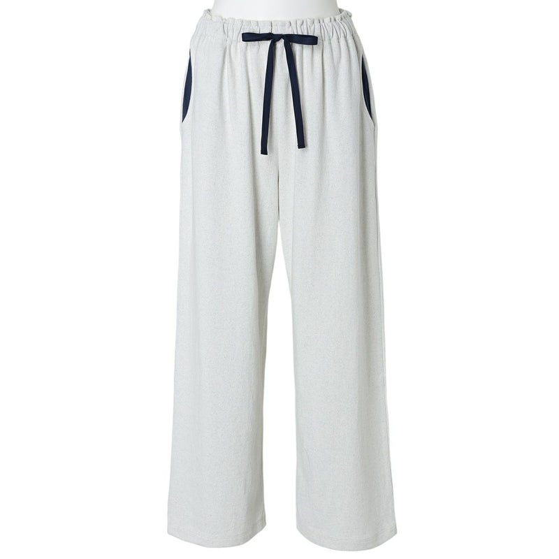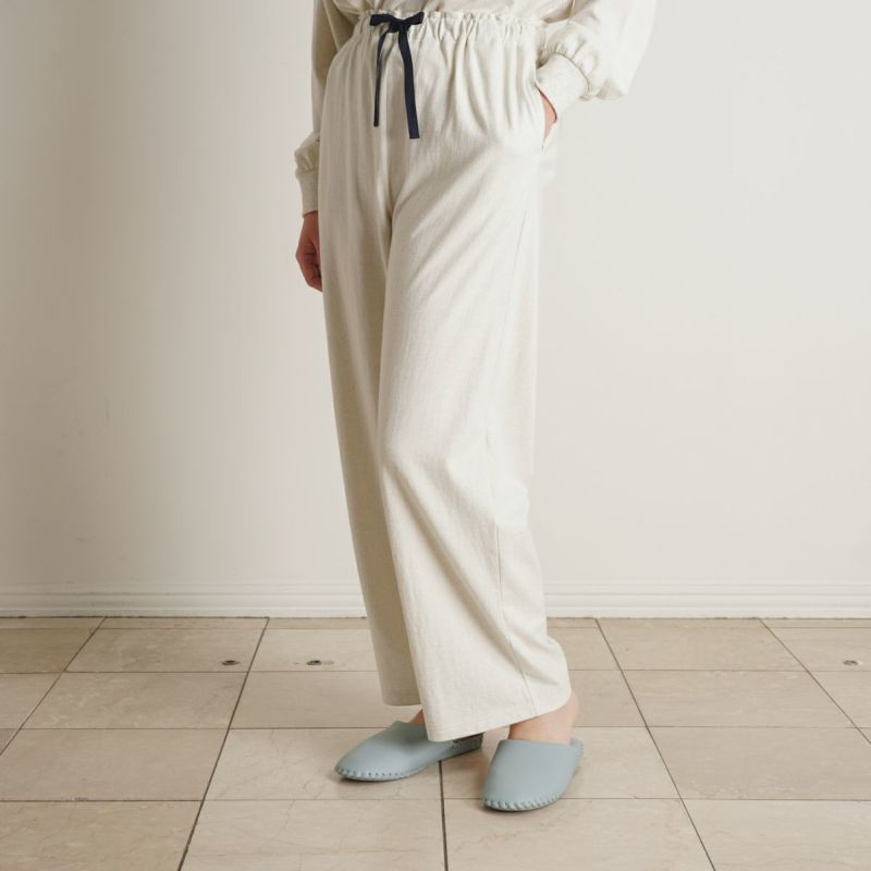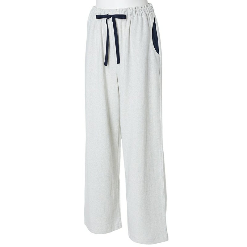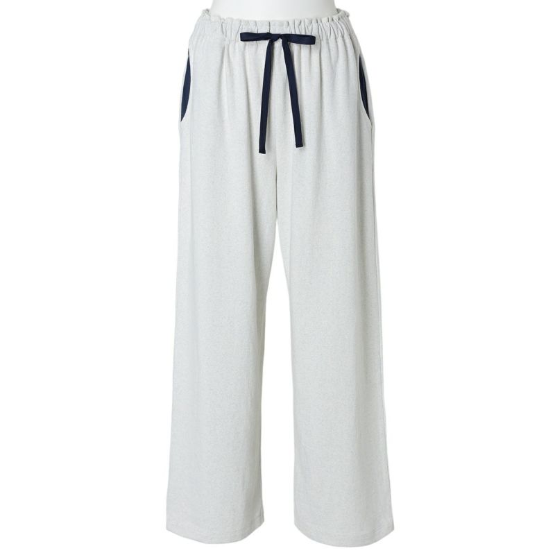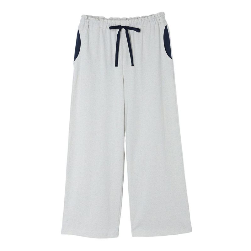 すとんとしたストレートシルエットのフルレングスボトムス。ポケットはカッティングをカーブにすることで、配色布がさりげなく見え隠れする細部にまでこだわったデザイン。