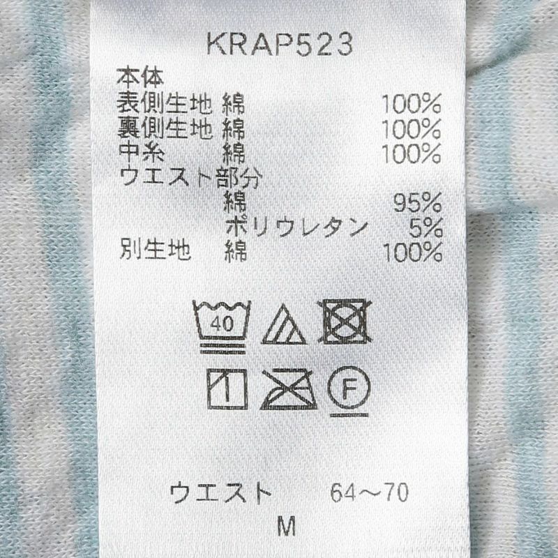 - 本体:表側生地 綿100% 裏側生地 綿100% 中糸 綿100% ウエスト部分 綿95% ポリウレタン5% 別生地 綿100%
