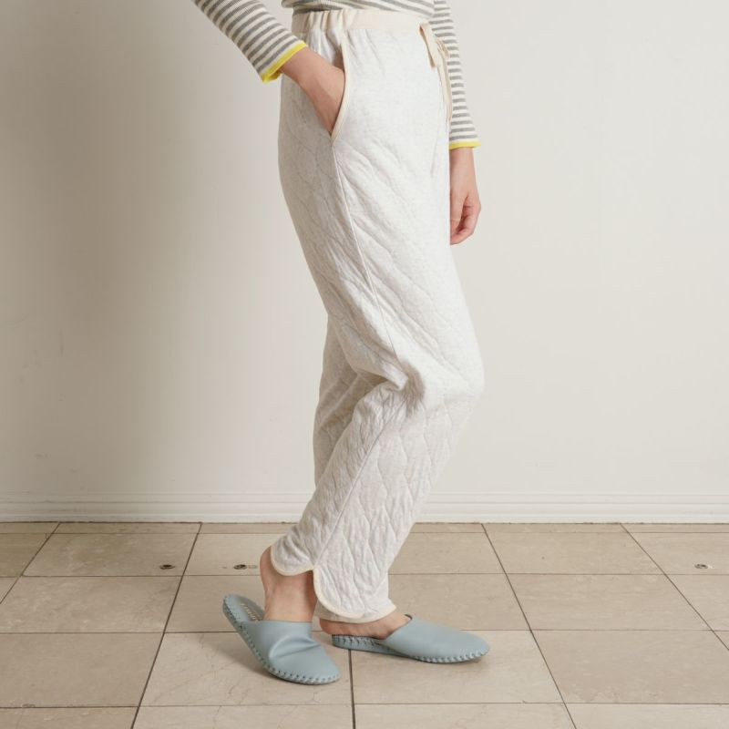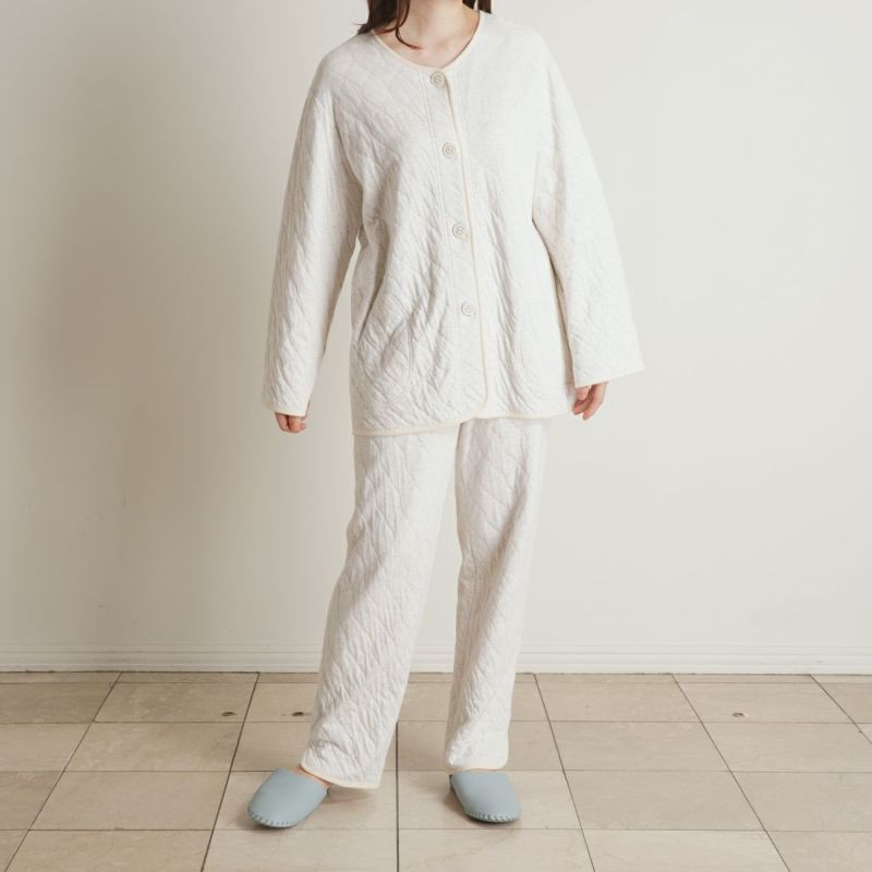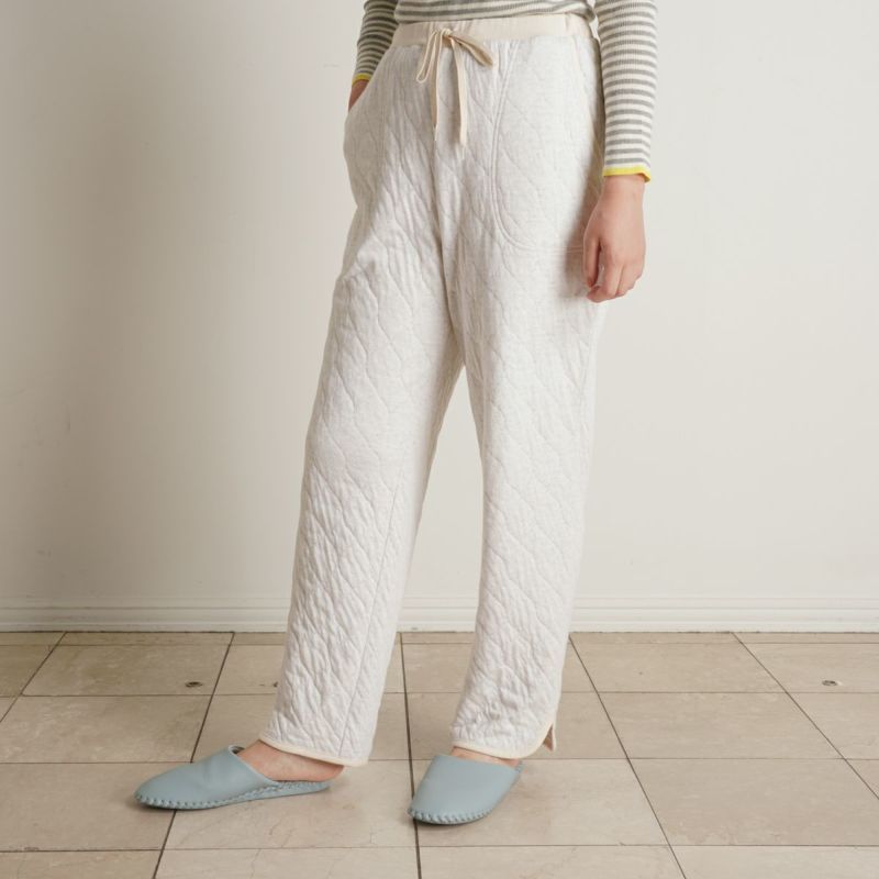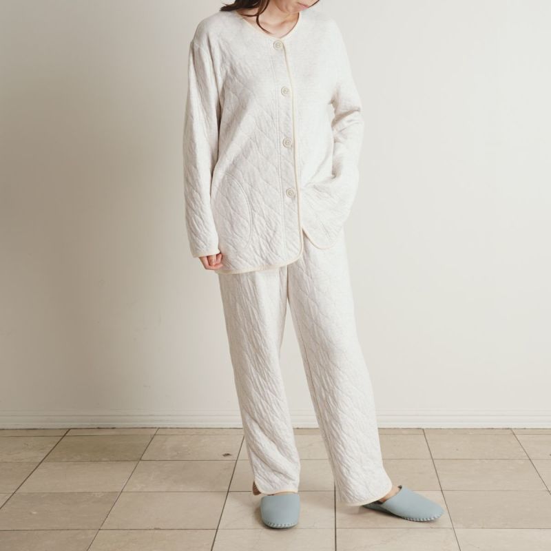 コットン100%の人気薄手キルトが登場。生地の表側と肌側、中糸にも綿糸を使用したオールコットンで安心のリラクシングウェアシリーズ。杢カラーでナチュラルな優しい色味に裏側のボーダー柄がアクセント。