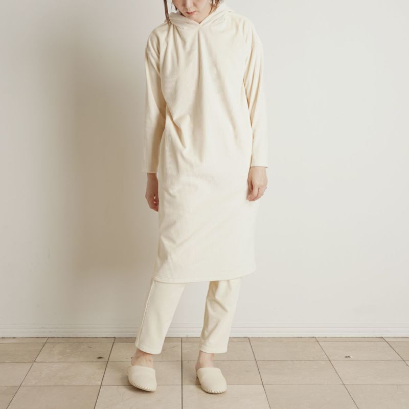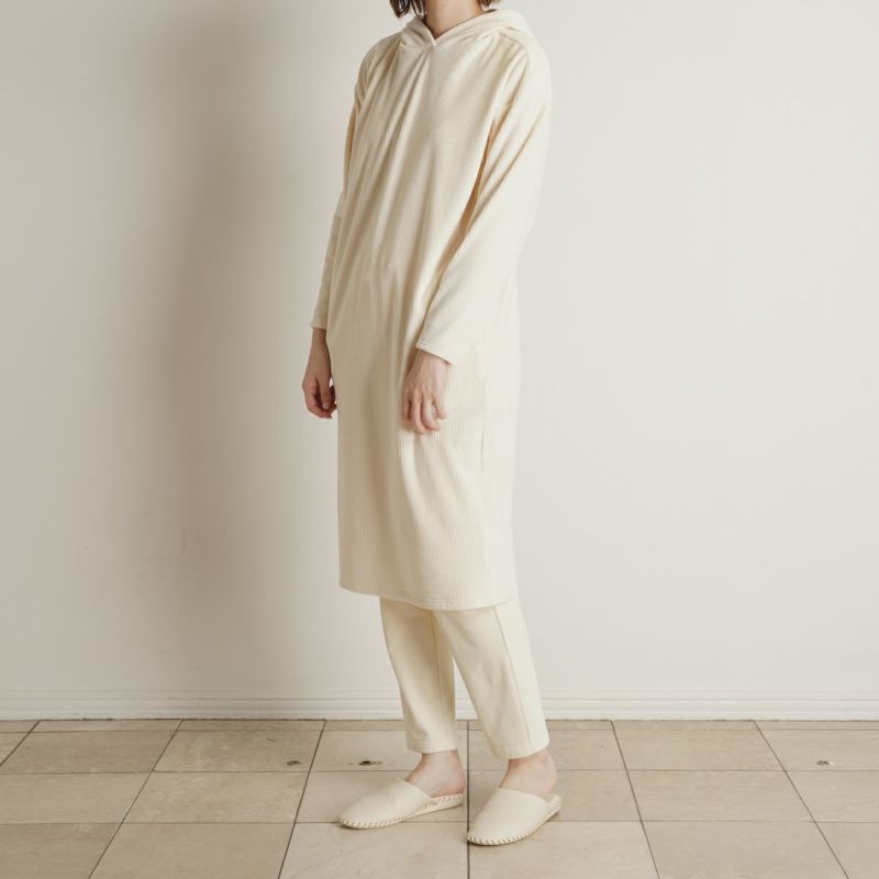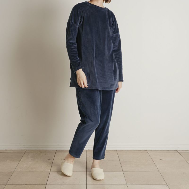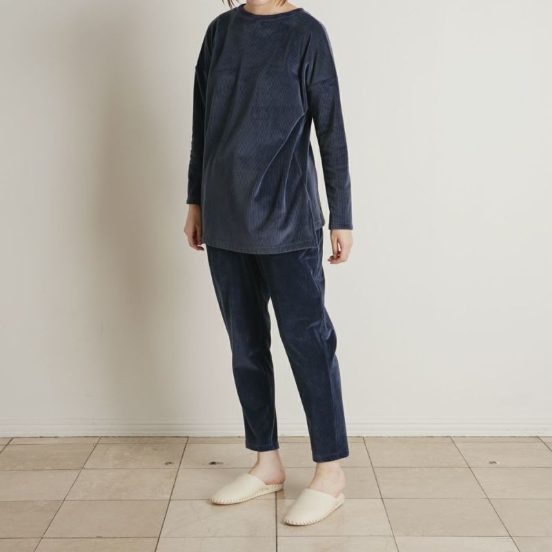 裾に向かって細くなるテーパードシルエットのフルレングスボトムス。シンプルなデザインなので同シリーズKRAN534とのセットアップはもちろんのこと、手持ちのアイテムとのコーディネイトもしやすい。同素材のドッグウエアもお作りしているので愛犬とのペアコーデもおすすめ。