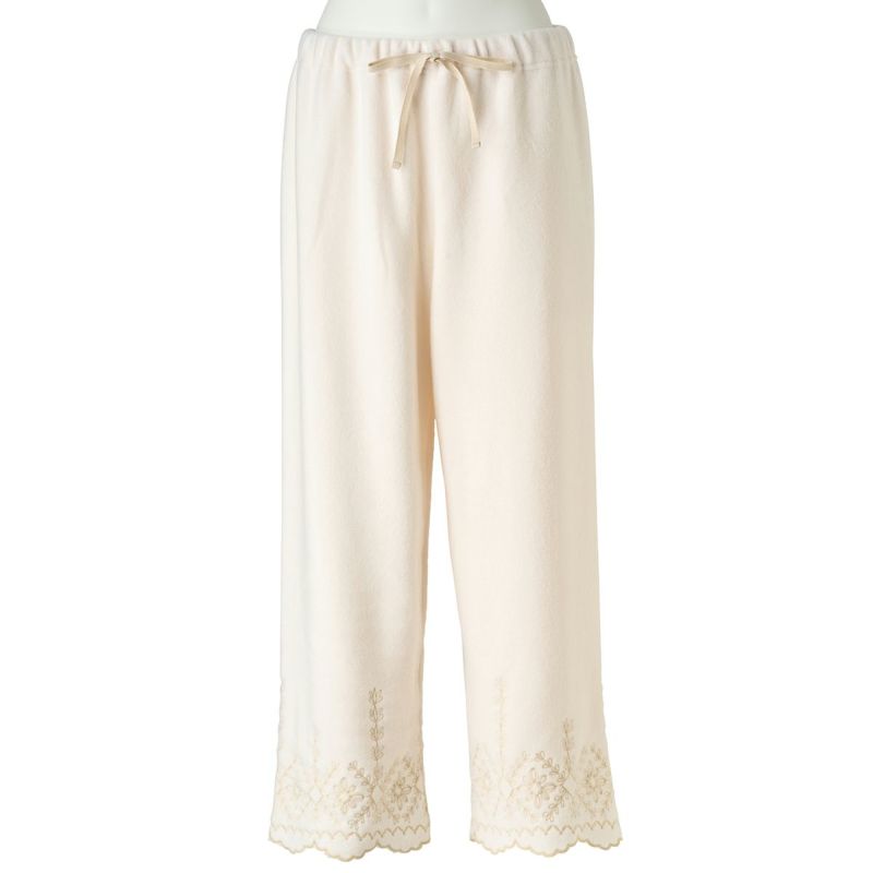 裾のステッチと刺しゅうがかわいいパンツ。ゆったりしたシルエットでリラックスして履ける。サイドの脇接ぎをなくし肌当たりをよくしたうえ、刺しゅうのつながりがきれいに見えるようこだわりました。