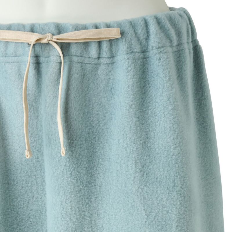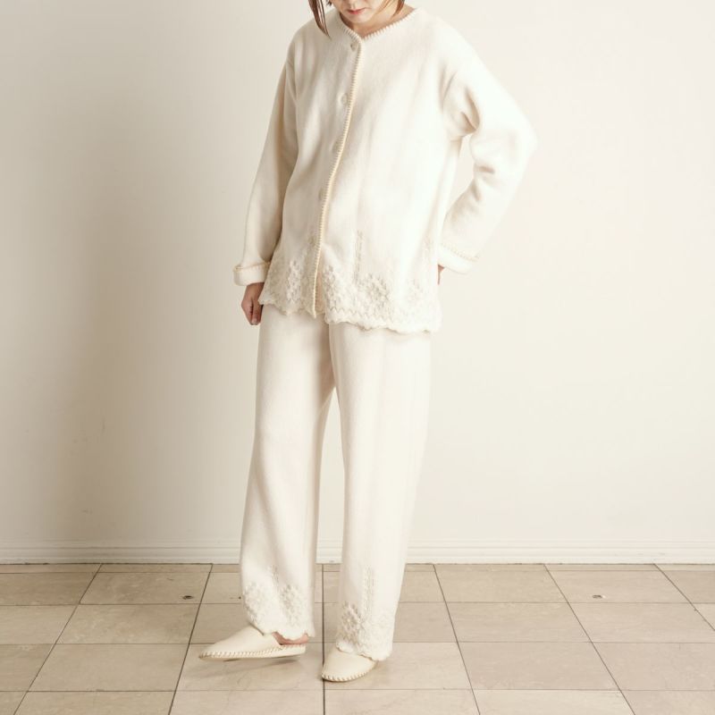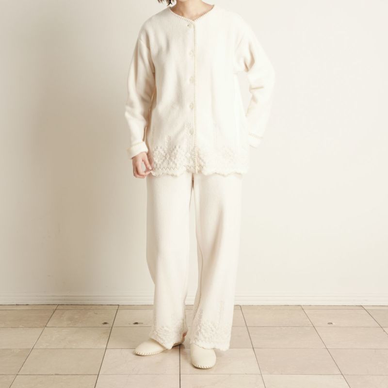 レース柄のような刺しゅうモチーフが素敵なフリースシリーズ。あたたかく軽く着やすい、キッドブルー冬の定番素材。レーヨン混のフリースはしなやかで滑らか。ソフトなあたかみのある印象のアイボリーとユーカリの2色展開。