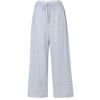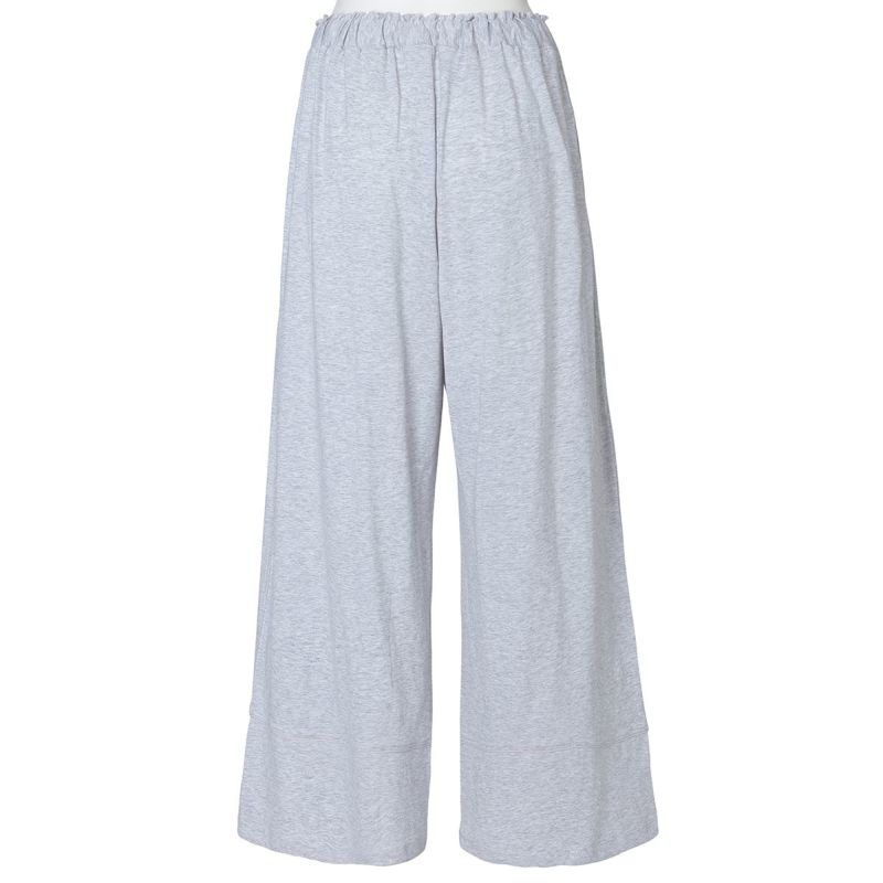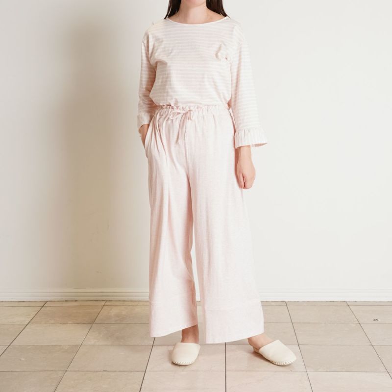 フルレングスボトムスは、ボリュームを抑えたセミワイドシルエットなので足捌きも良い◎切り替え部分のパイピングがデザインポイント。ほどよいハリ感があるのでお部屋着としてサマになる1枚です。