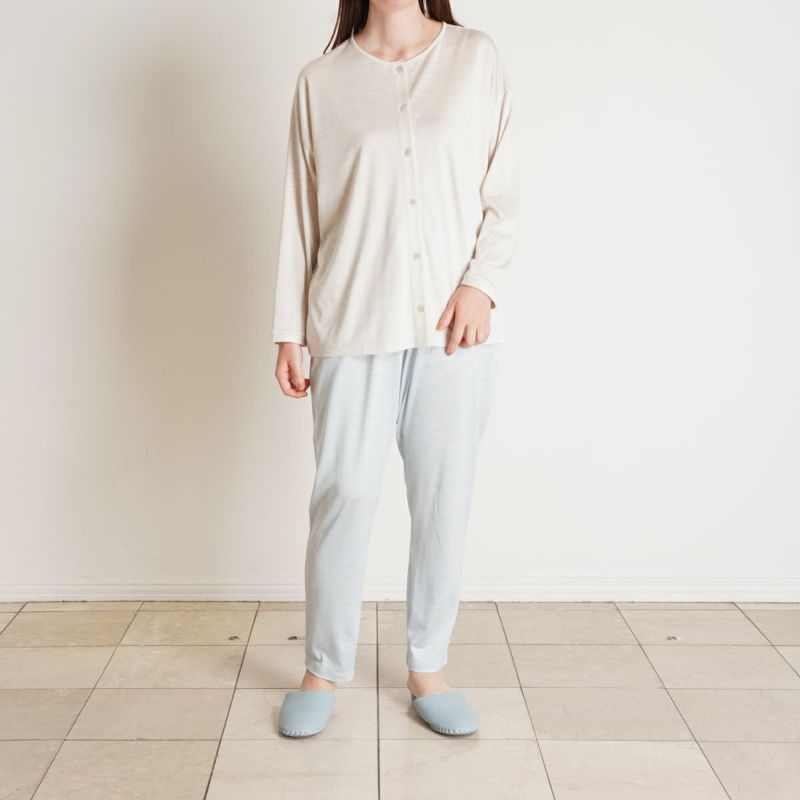 優美な光沢と滑らかな表面感、吸・放湿性に優れたシルク100%のリピーター多数の人気シリーズ。シレー加工による適度なハリと上品な光沢が特徴のリラクシングウェア。透けにくく、シワになりにくいのがうれしいポイントです。柔らかなトーンのサックスと、少し黄身がかったやさしいライトグレーの2色展開。