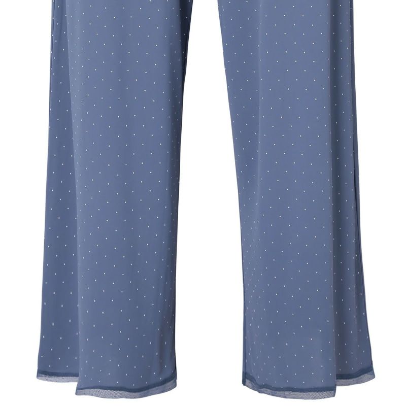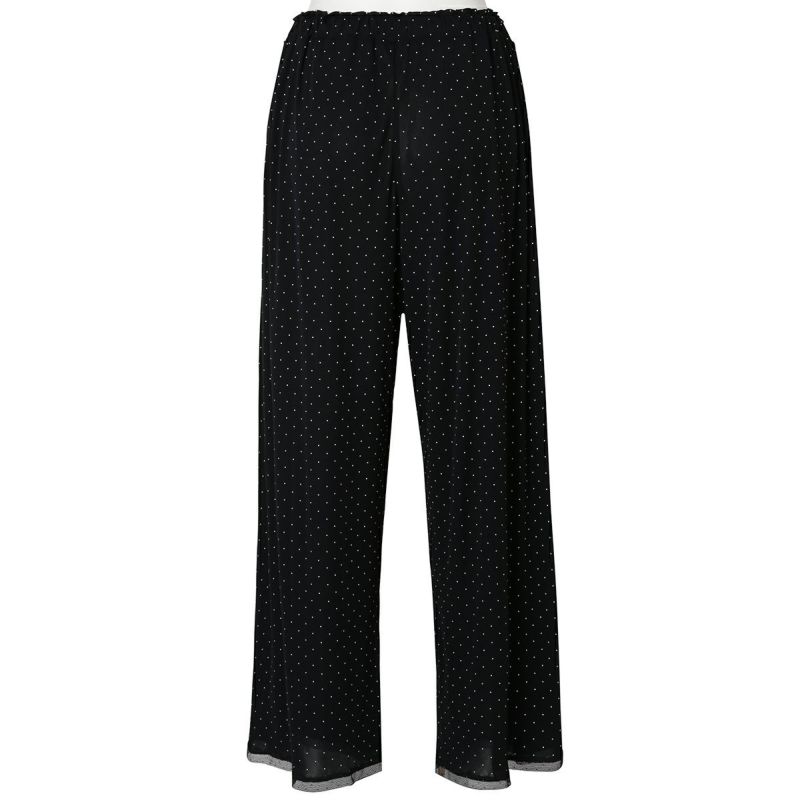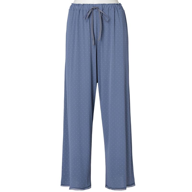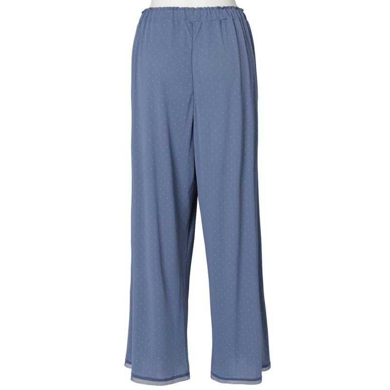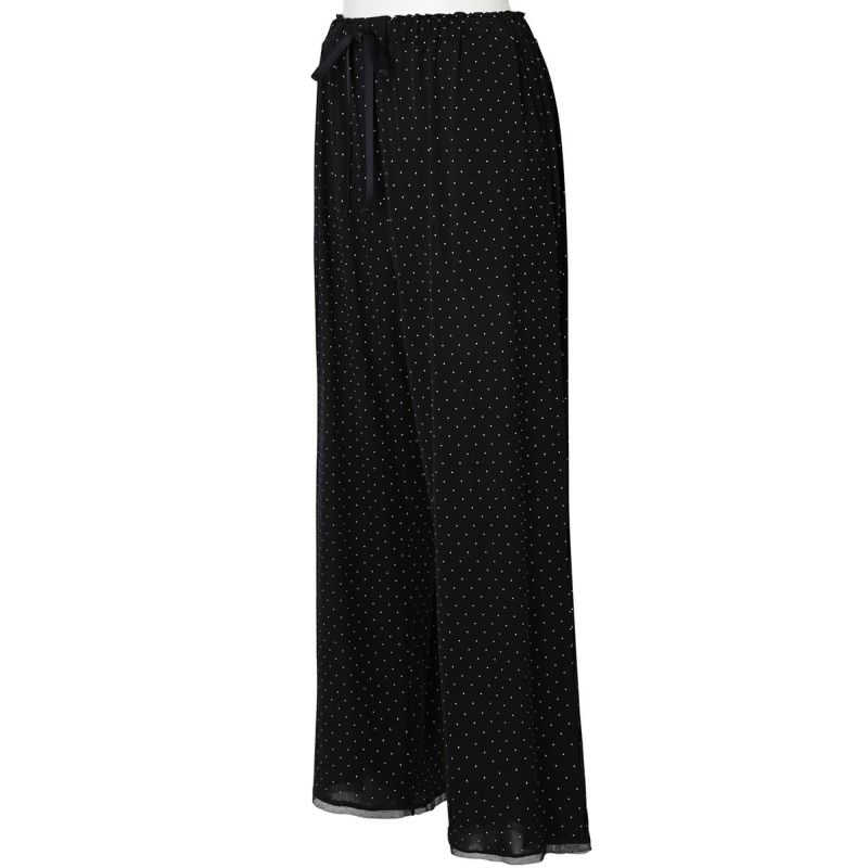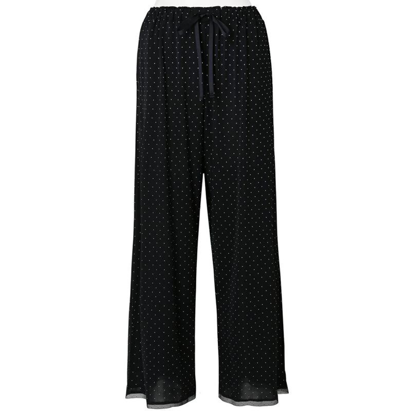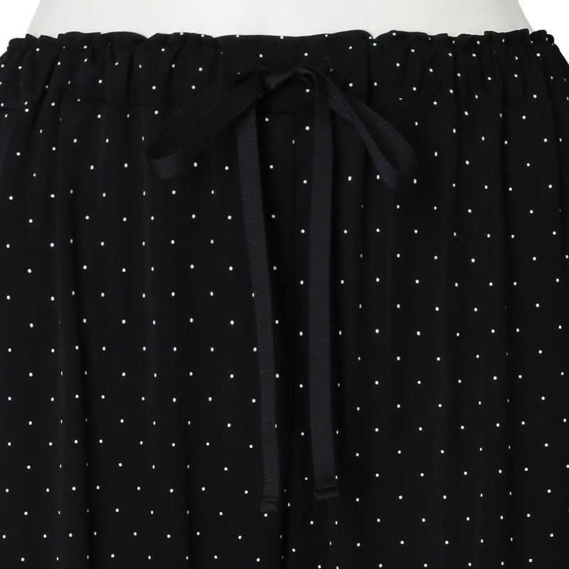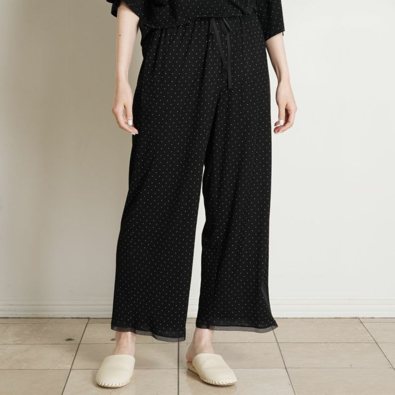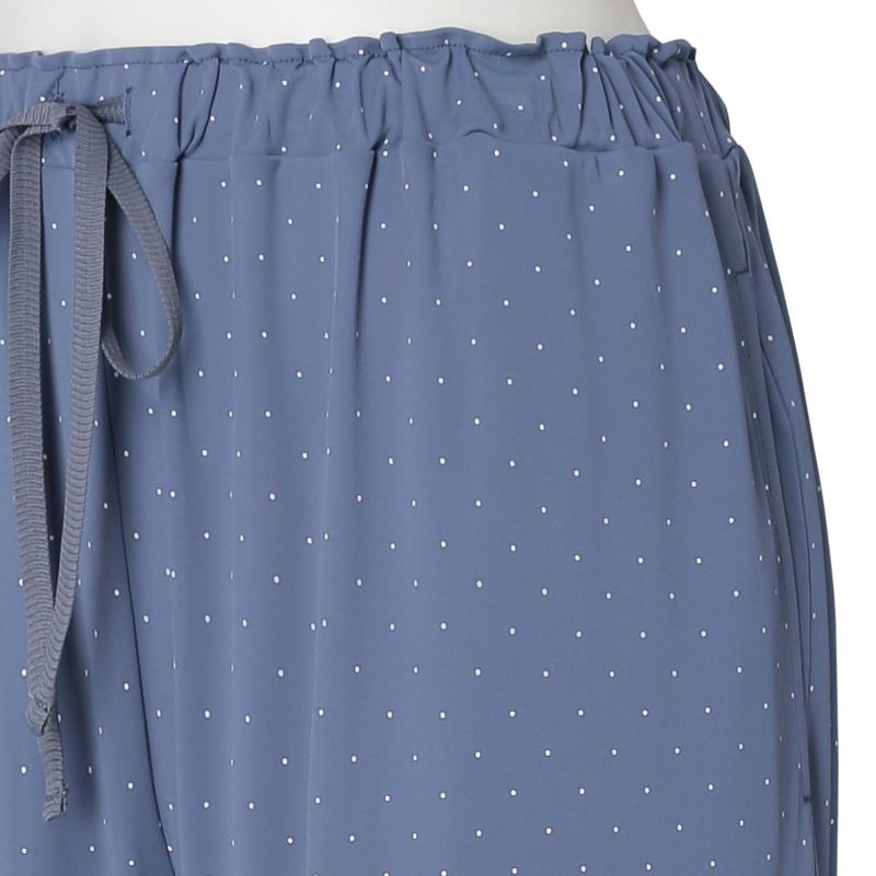 くるぶし丈ボトムスは、セミワイドシルエットで涼しくにサラッと着用していただけます。身生地の柄に合わせたドット柄の繊細なレースがデザインポイント◎便利なポケット付き。