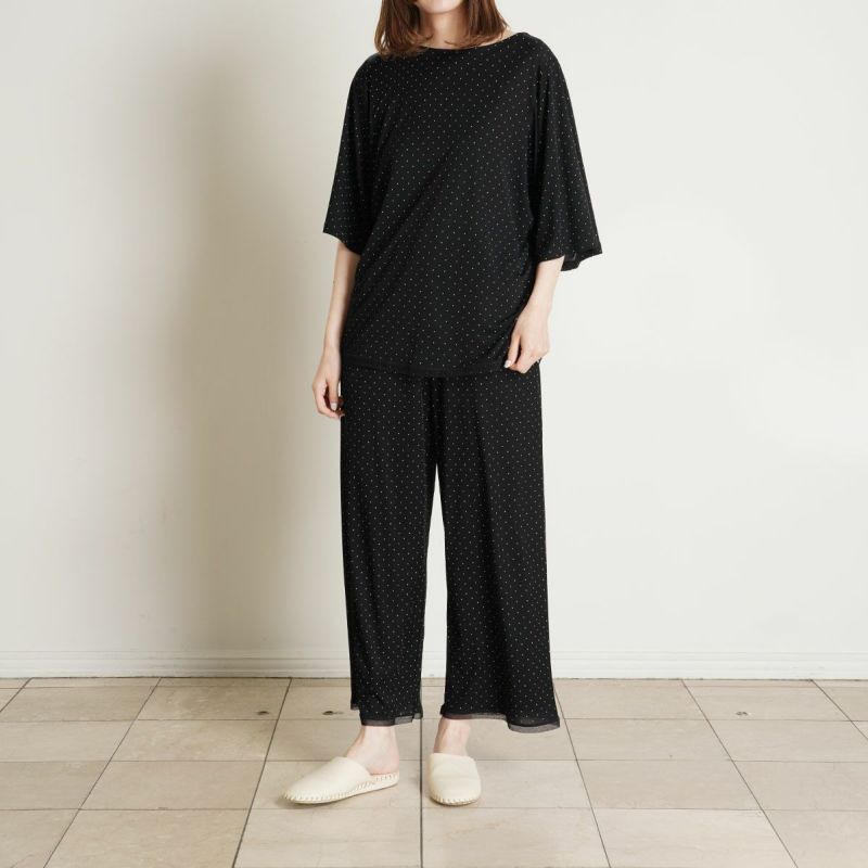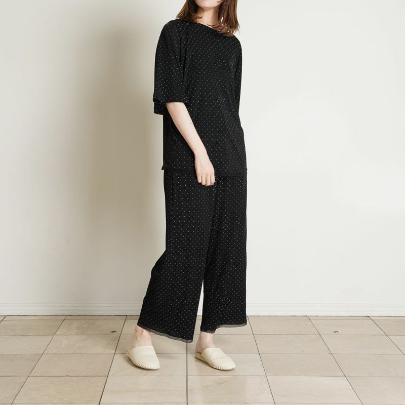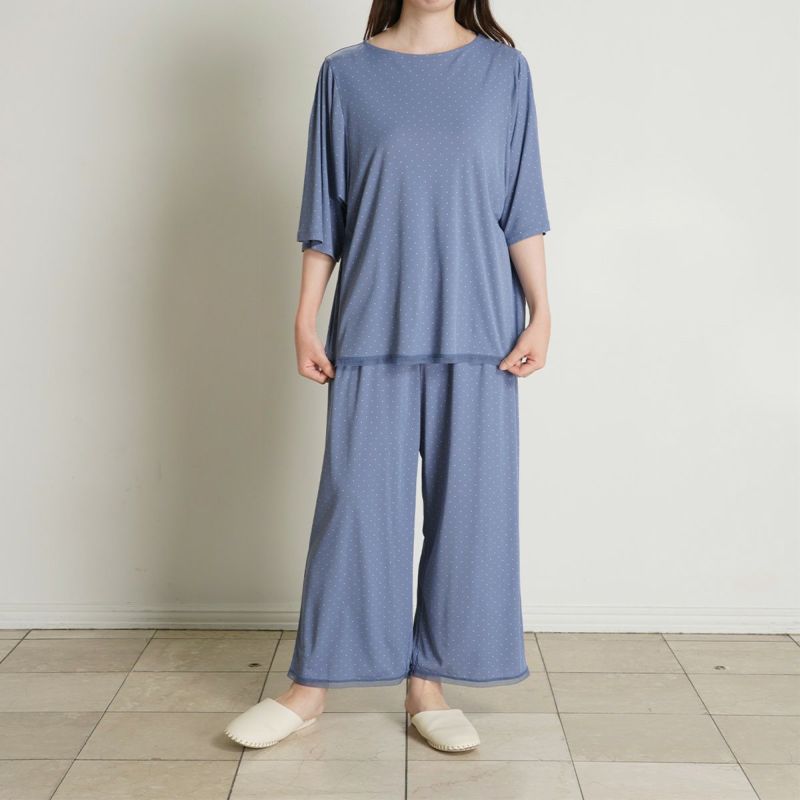 接触冷感のある、夏におすすめのベンベルグ素材。吸放湿性がありべたつきにくく蒸れにくい、サラッとした着用感が魅力です。細やかなドット柄と自然な落ち感が美しいラインを作り、上品な印象に。快適さと高級感を兼ね備えたこだわりのルームウェアシリーズ。