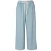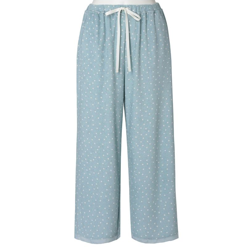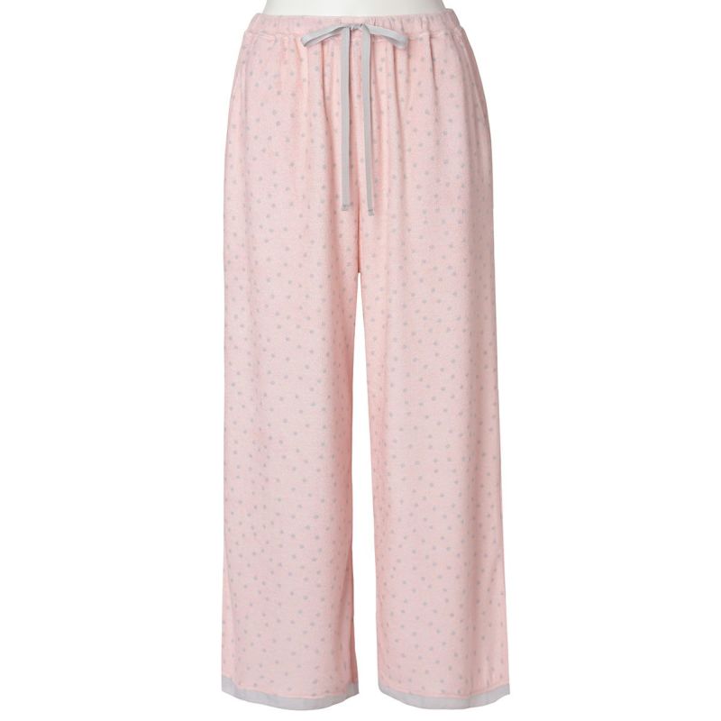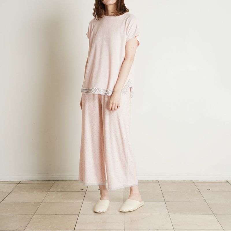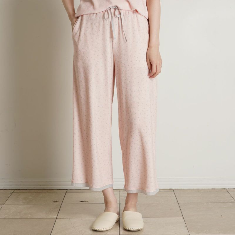 8分丈ボトムスは、どんなトップスにも合わせやすいシンプルなシルエット。きめ細かい生地で肌触り良く、透け感も気になりません。裾に施したピコが軽やかなアクセント。ルームウェアとしてはもちろん、ナイトウェアにもおすすめ。ポケット付き。