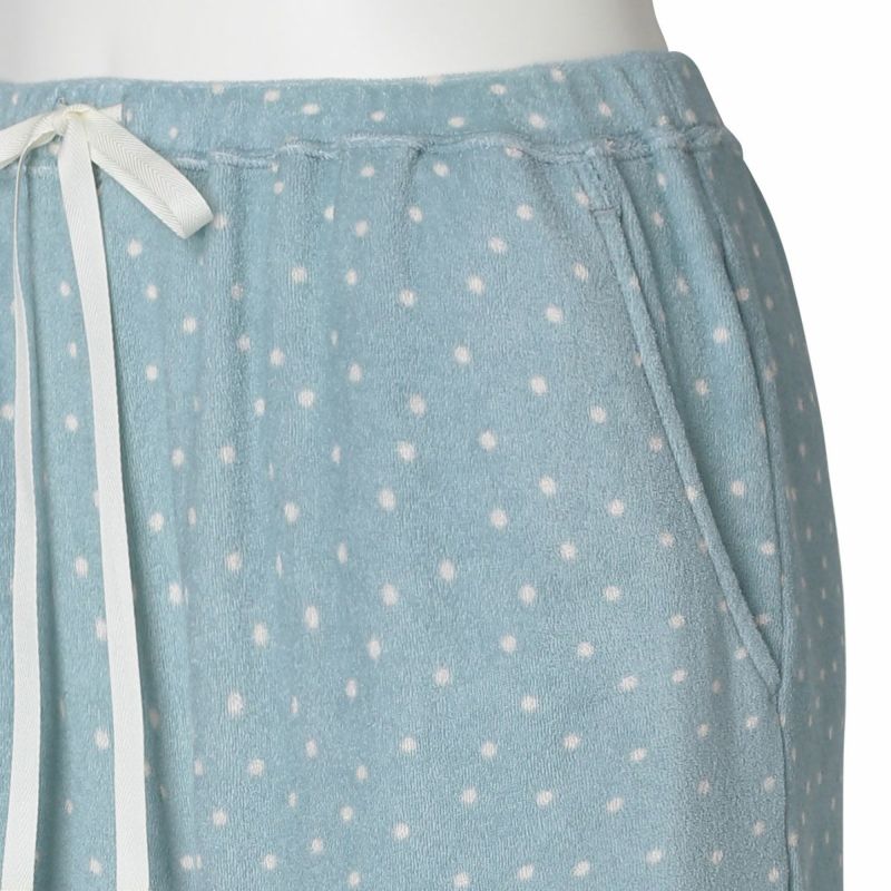 キッドブルーで人気の軽くて柔らかい夏向けパイル素材のドット柄ルームウェア。吸水性にも優れているので、汗をかきやすい季節やお風呂上がりにも快適に過ごせます。「25ガーゼパイル無地」とのクロスコーディネートがおすすめ。