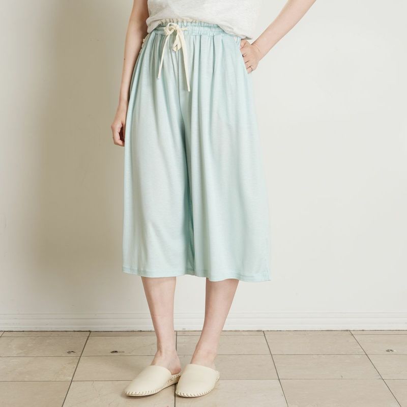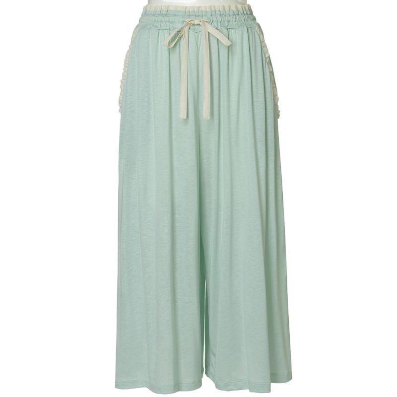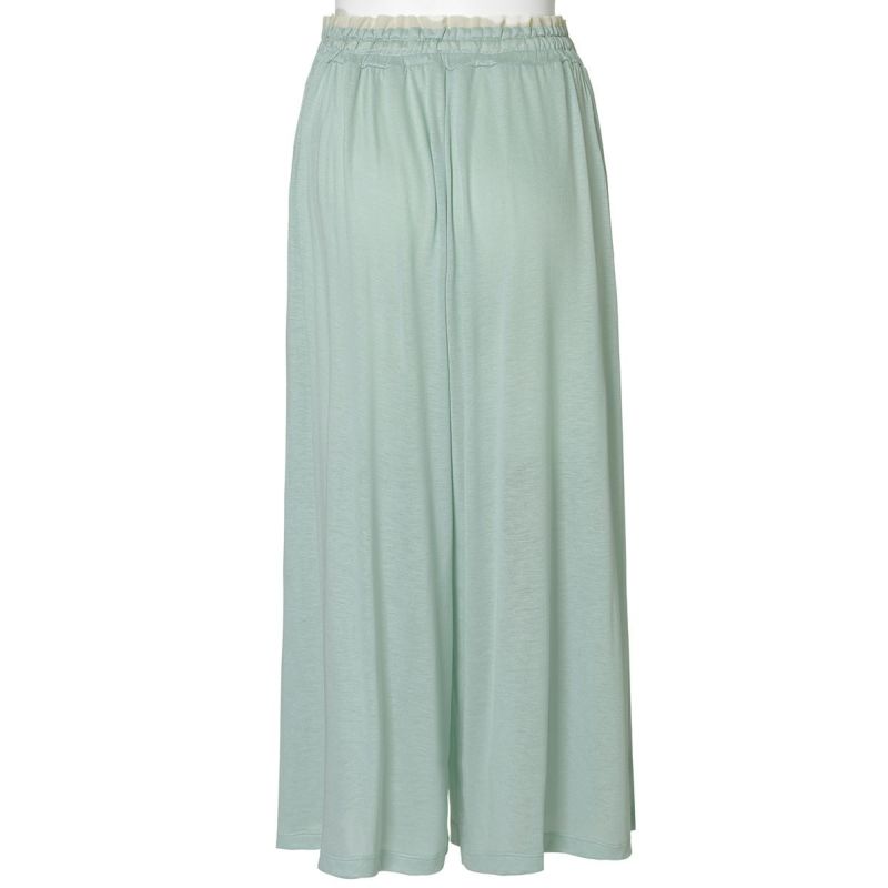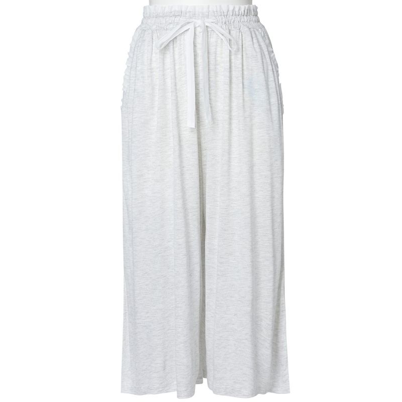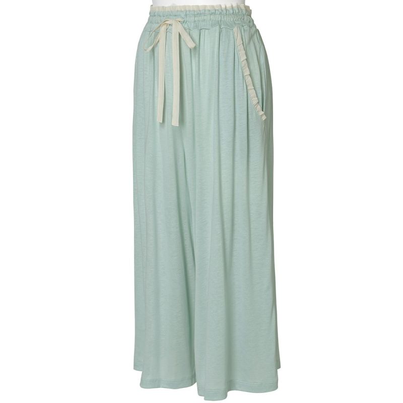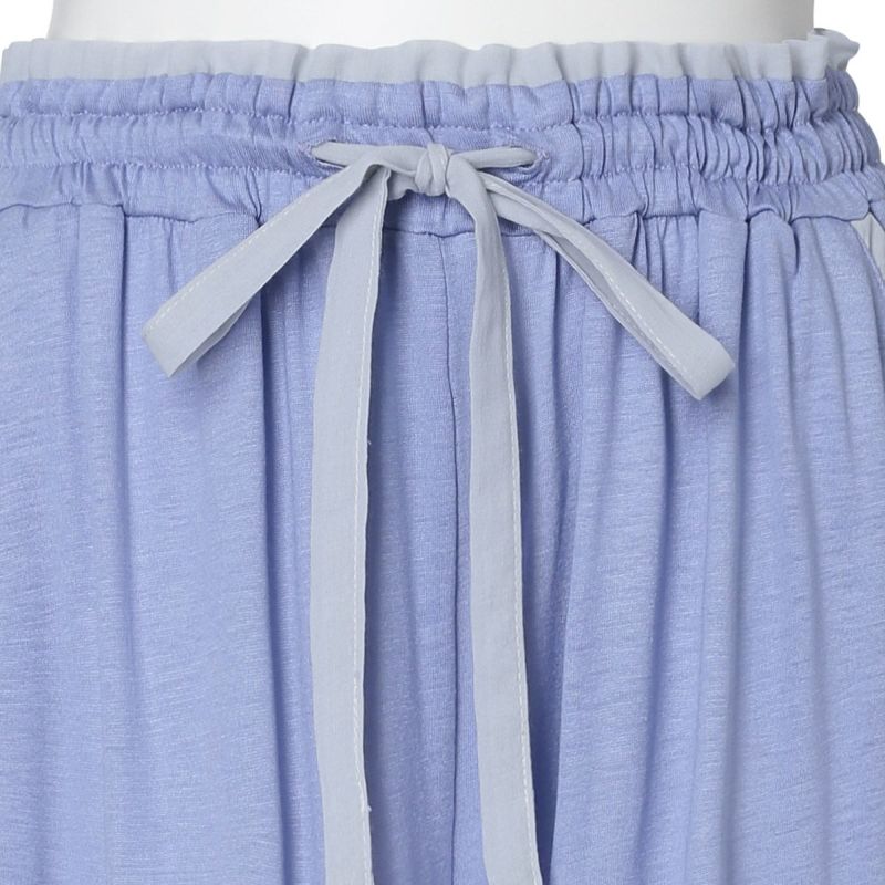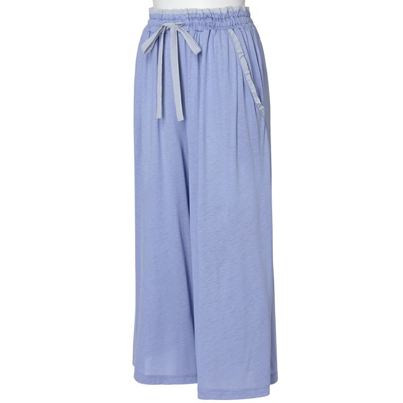 レーヨン素材ならではの自然な落ち感が美しい7分丈ボトムス。トップスINでも可愛らしく決まる、ウエストの配色デザインがポイント。ギャザーをたっぷり寄せ肌離れもよく快適な着用感のワイドボトム。ナイトタイムはもちろん、休日のリラックスタイムにもおすすめです。