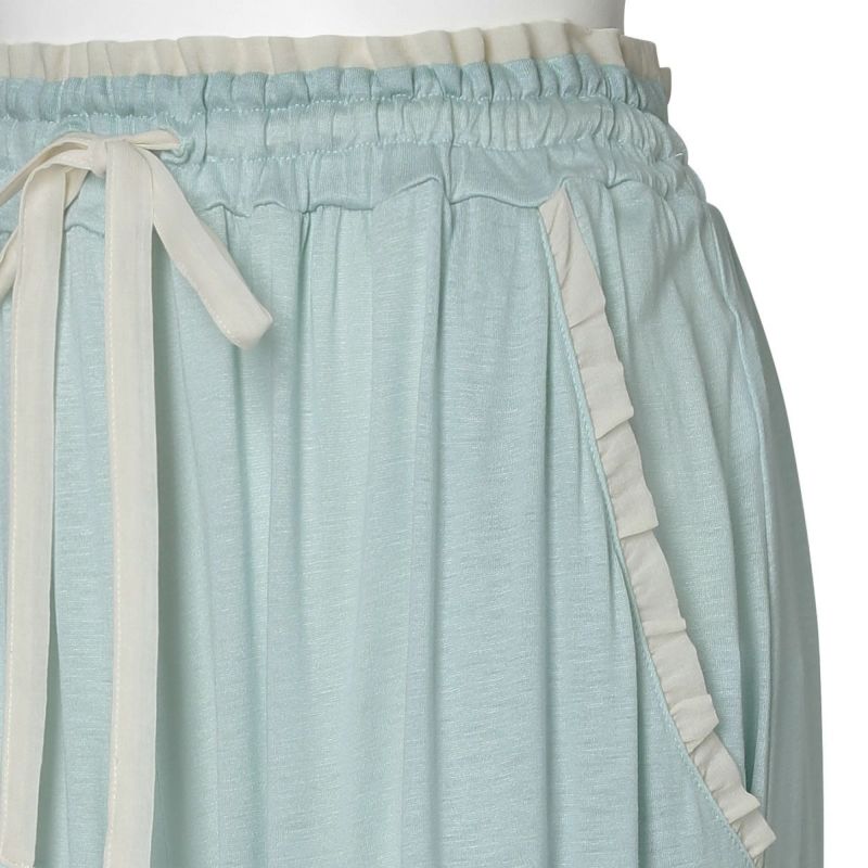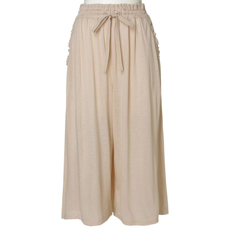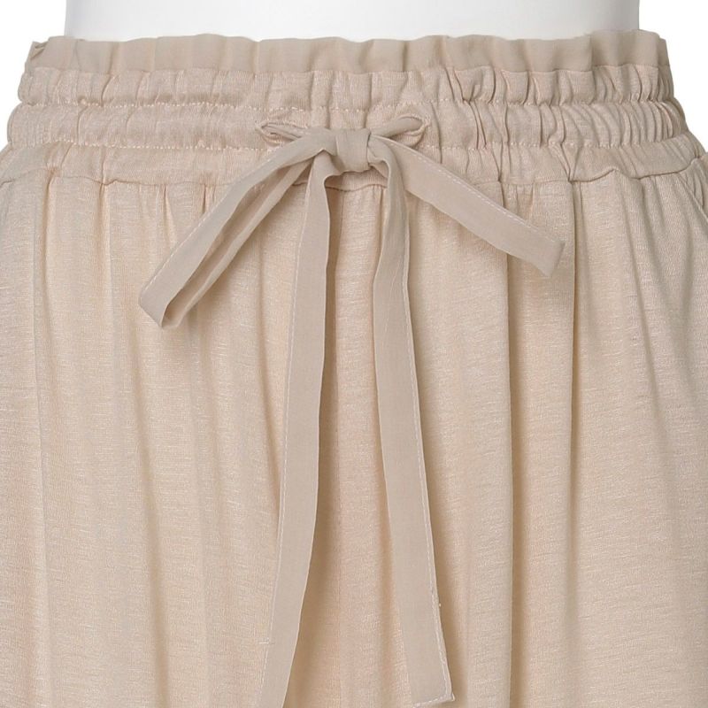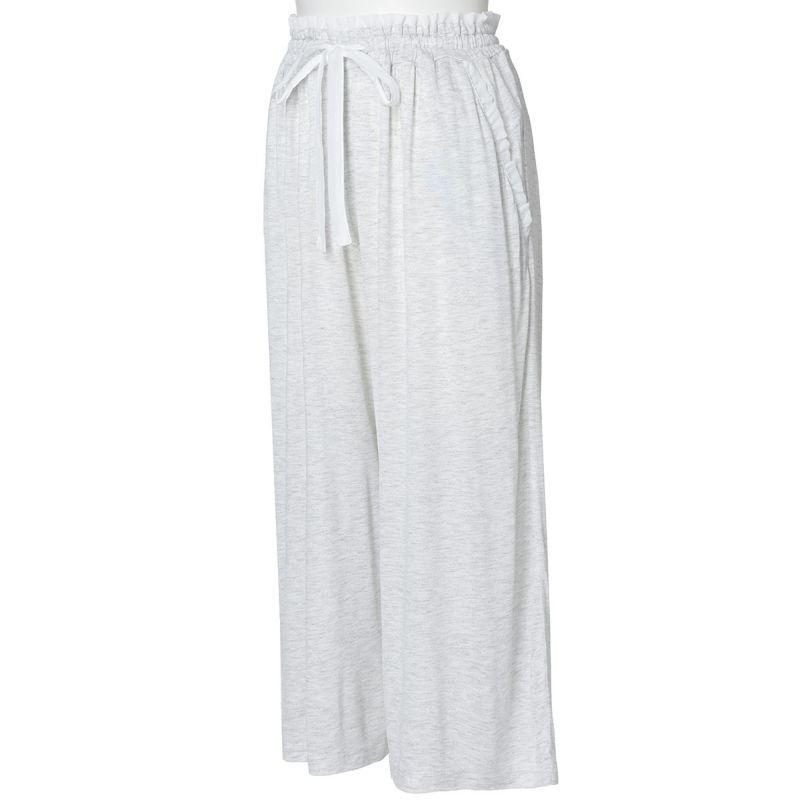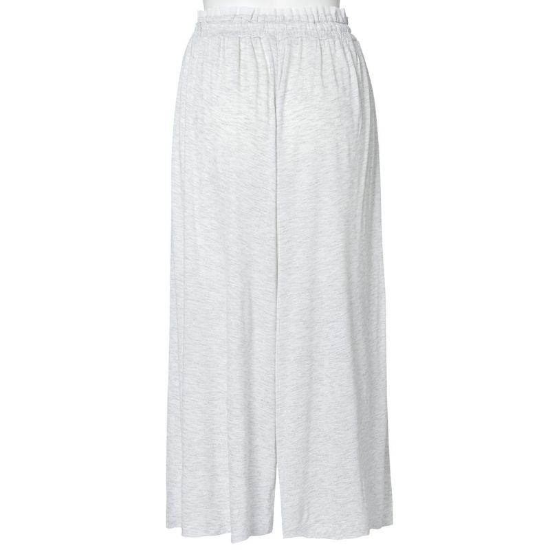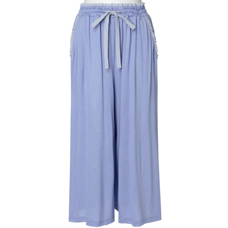 レーヨン素材ならではの自然な落ち感が美しい7分丈ボトムス。トップスINでも可愛らしく決まる、ウエストの配色デザインがポイント。ギャザーをたっぷり寄せ肌離れもよく快適な着用感のワイドボトム。ナイトタイムはもちろん、休日のリラックスタイムにもおすすめです。