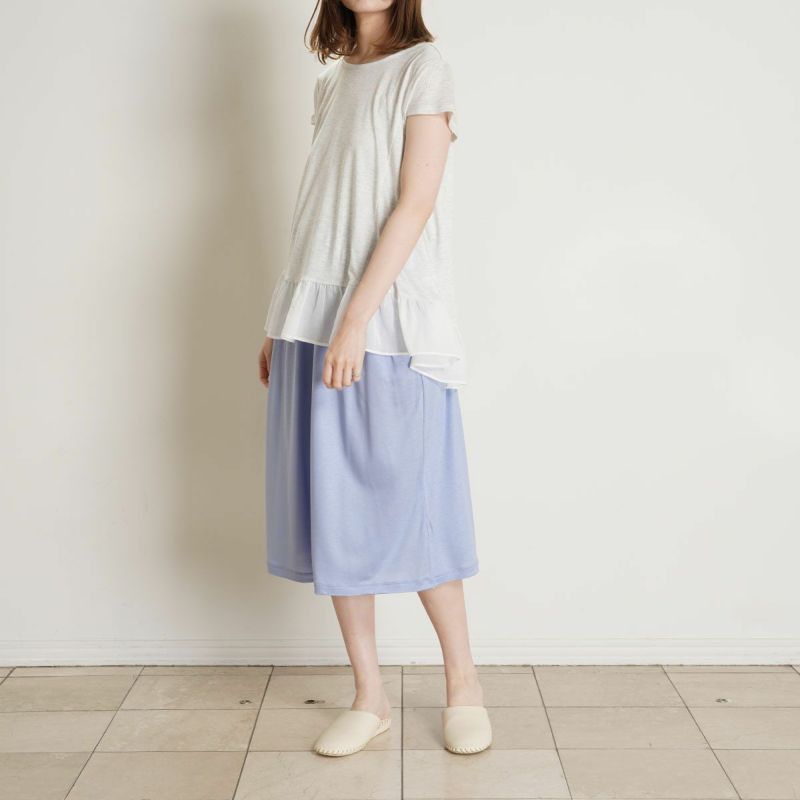 上品な光沢のレーヨン天竺素材。しっとりとした落ち感となめらかな肌触りで、着心地の良さが魅力です。別布のシフォンをフリルとして部分使いすることで、エアリー感のある可愛らしいデザインに仕上げました。きれいな色合いのピンク・ペパーミント・ブルーと限定店舗展開のライトグレイの4色展開。