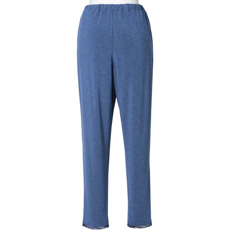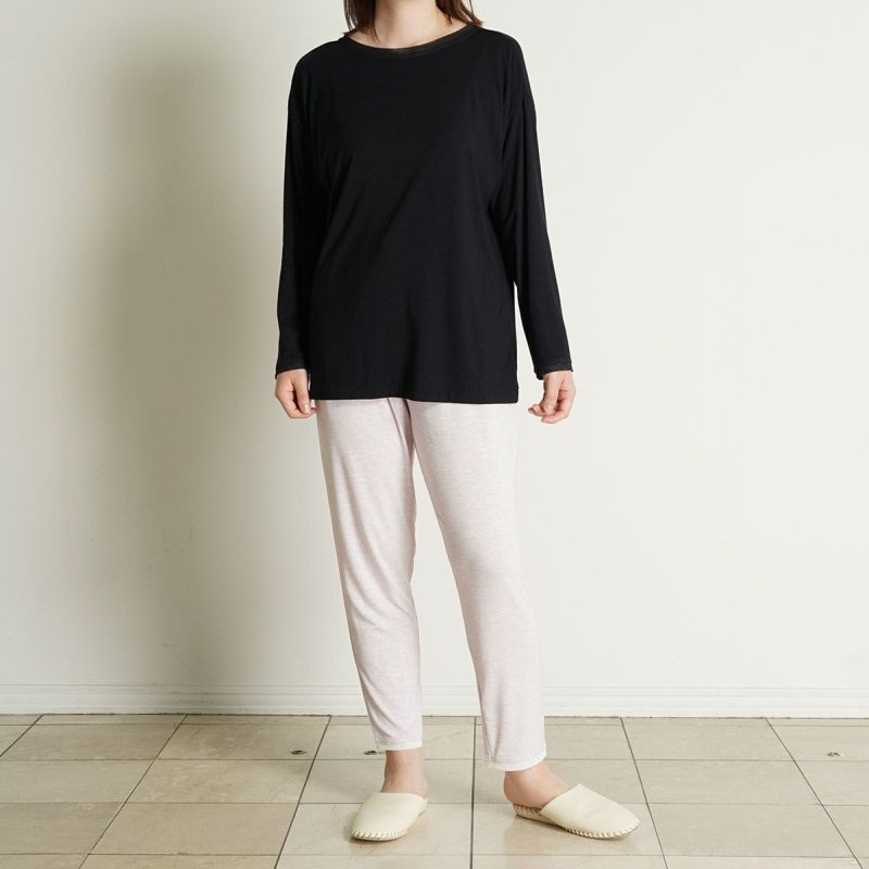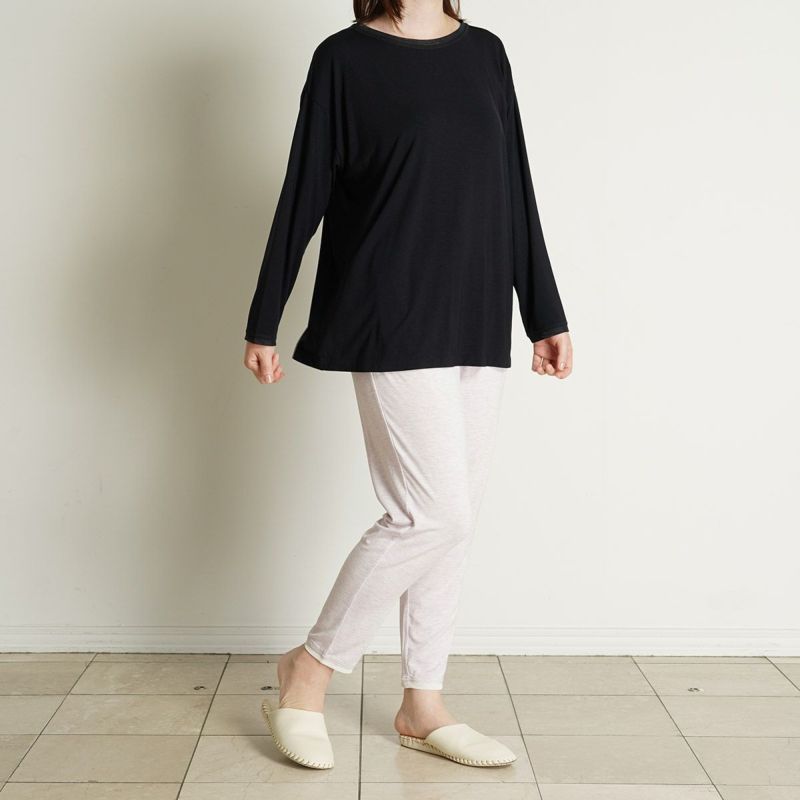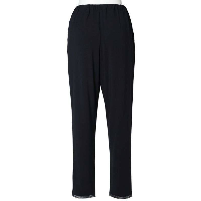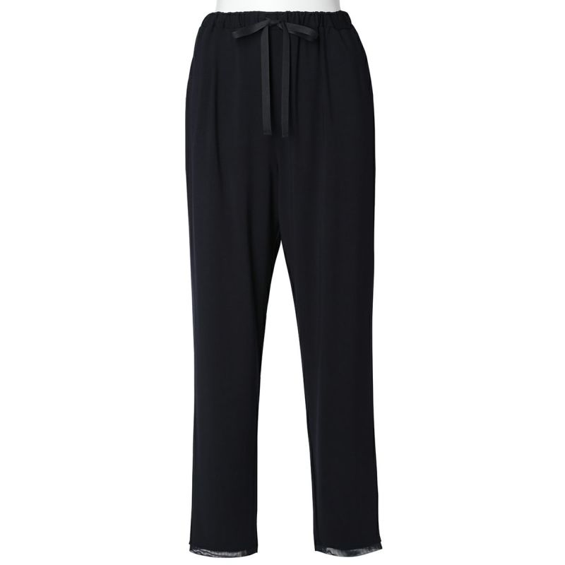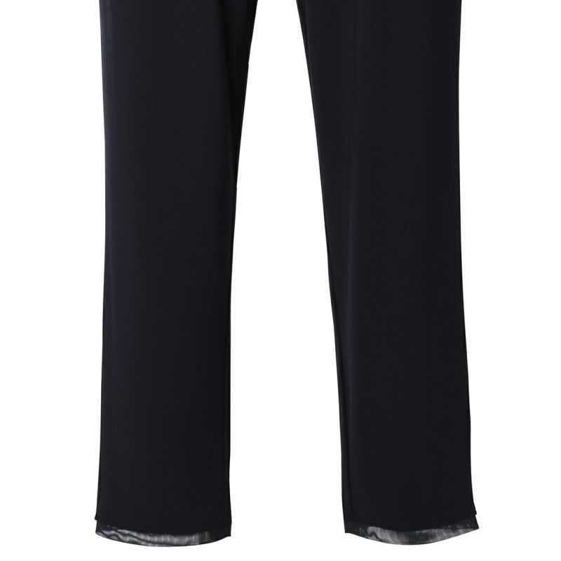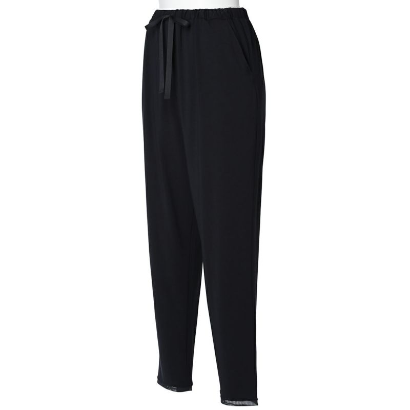 フルレングスボトムは裾に向かって絞ったデザインで、すっきり見えが叶うテーパードシルエット。ほどよい落ち感のあるなめらかな質感で上品さを演出しつつ体の動きにしなやかにフィットするストレッチ性が◎裾に施した透け感のあるパワーネットがデザインのアクセントに。同素材のトップス(KRCN513)とのコーディネートもおすすめです。