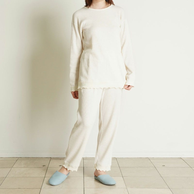 やわらかなワッフルニット素材で仕立てたシリーズ。杢糸をボーダー状に編みこむことで、奥行き感のある豊かな表情に仕上げました。端にあしらったフリルのようなリブメローが、上品なかわいらしさをプラス。凹凸あるワッフル地で空気を含むため、ふっくらやわらかいうえサラッとした肌触りで季節を問わず快適な着心地を叶えます。