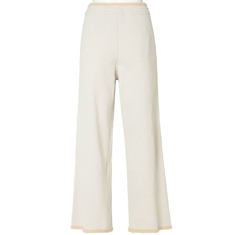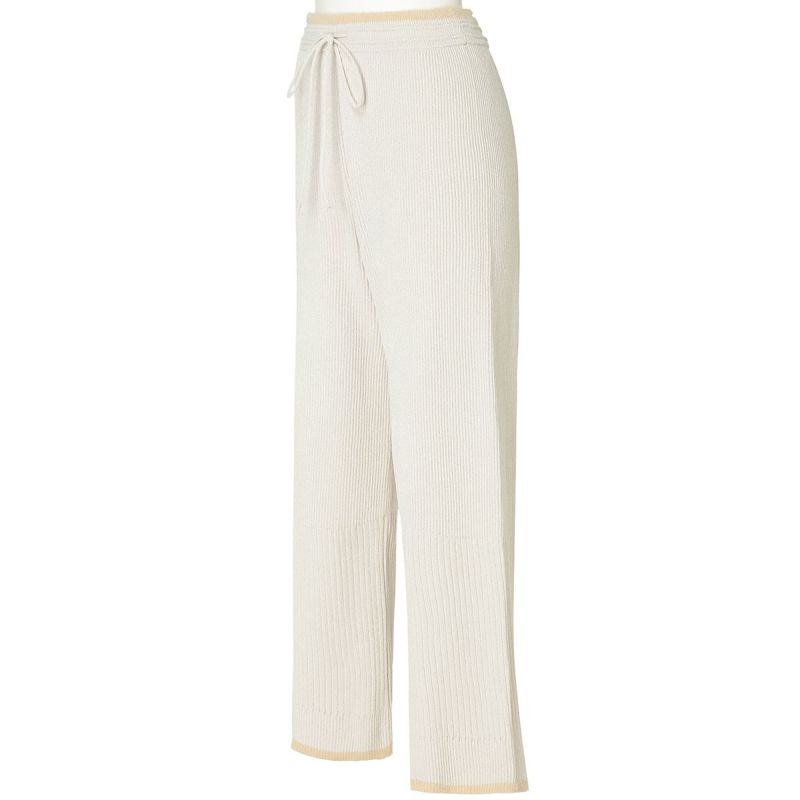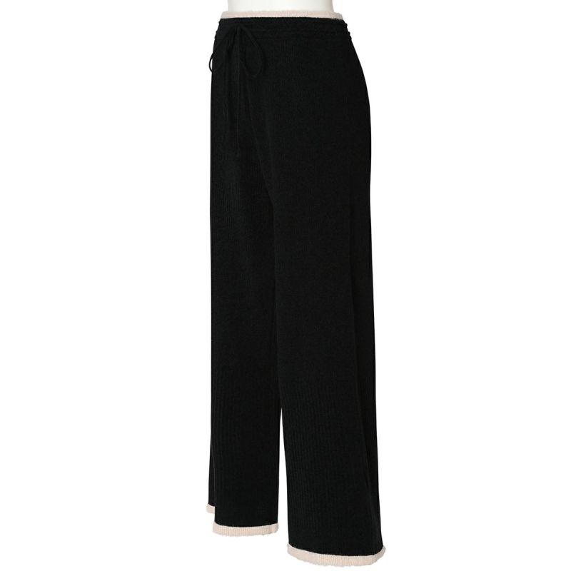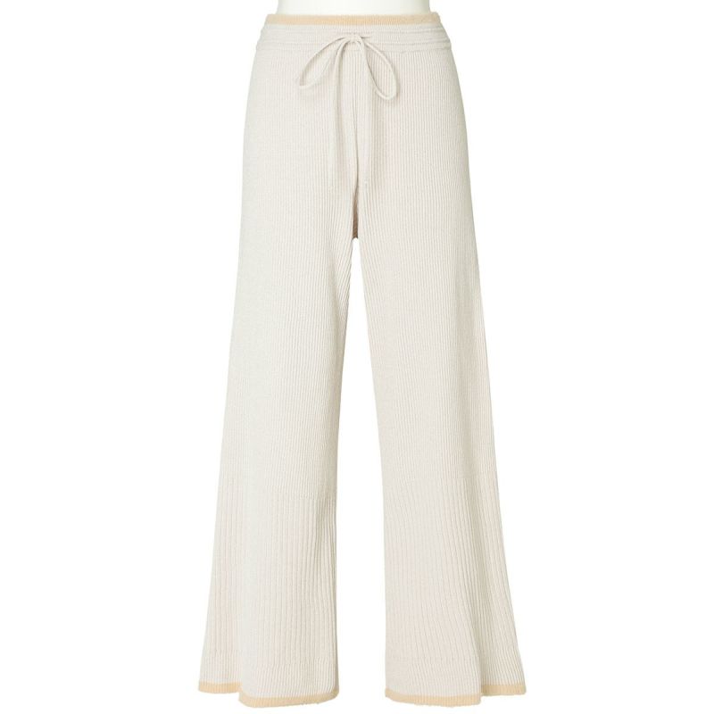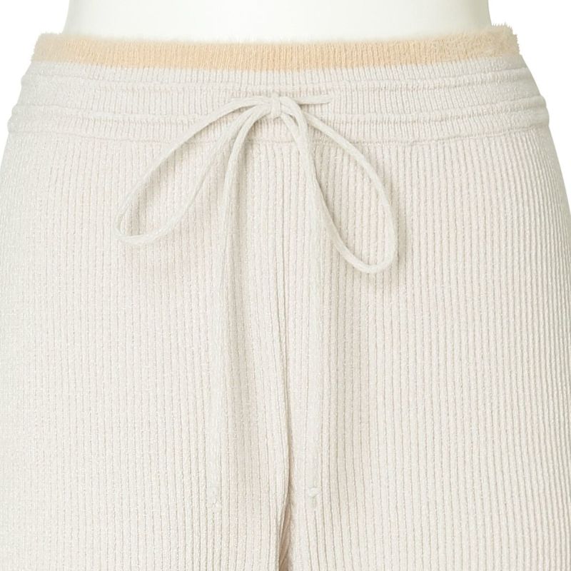 リラックス感がありながら上品な印象のワイドパンツ。様々なリブ編地を組み合わせ、こなれた印象に。ウエストにはふわふわの配色シャギーを施し華やかなポイントに。同シリーズのトップス(KRCO530、KRCN630)と合わせ、セットアップとしてもおすすめです。