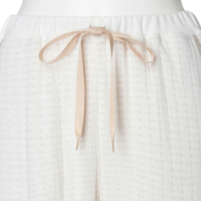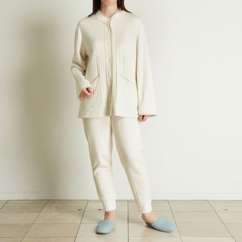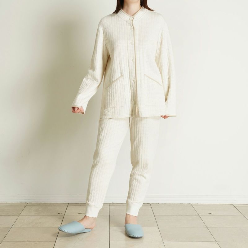 ほどよい厚みのキルト仕立ては、軽やかでありながらもあたたかく、季節の変わり目や薄手防寒にぴったり。生地の表側と肌側、中糸にも綿糸を使用したオールコットン。ナチュラルな優しい色味に裏側のボーダー柄がアクセント。接結部分からさりげなくのぞき、おしゃれな雰囲気を添えます。