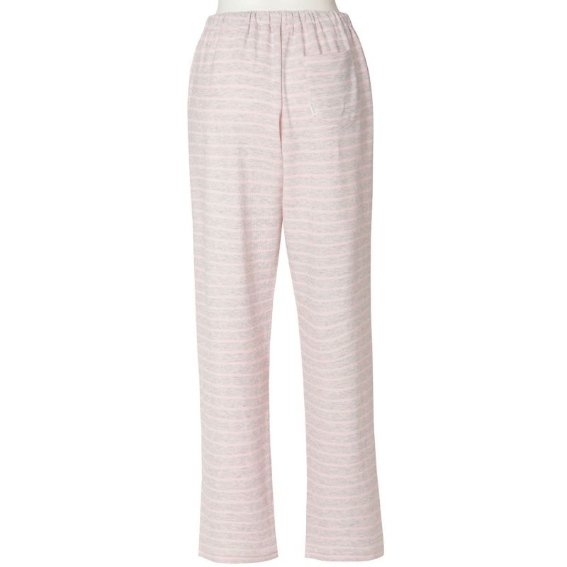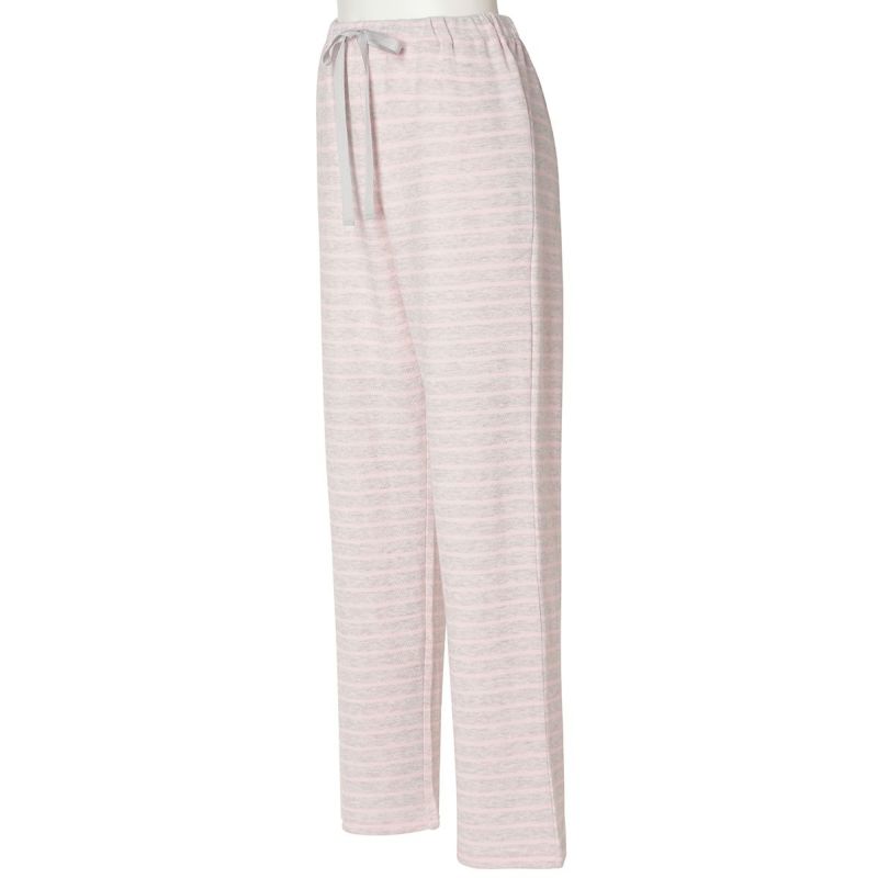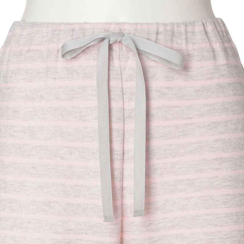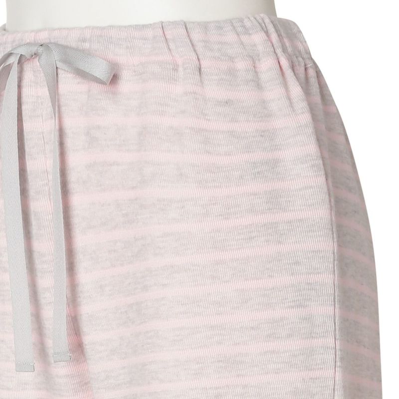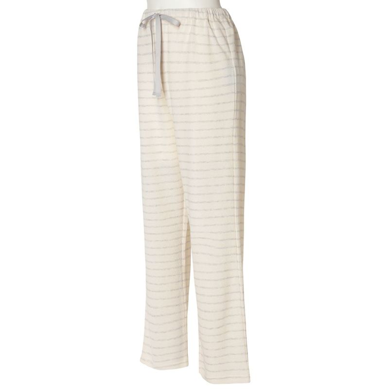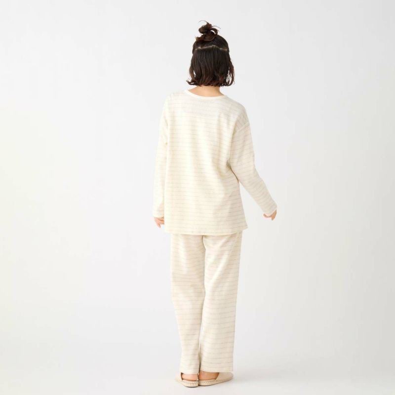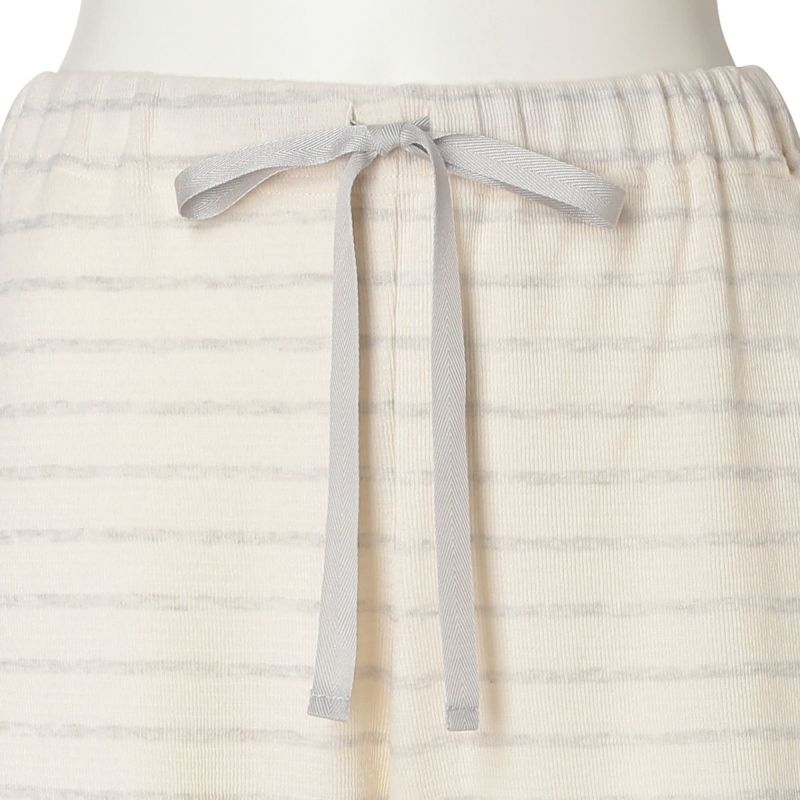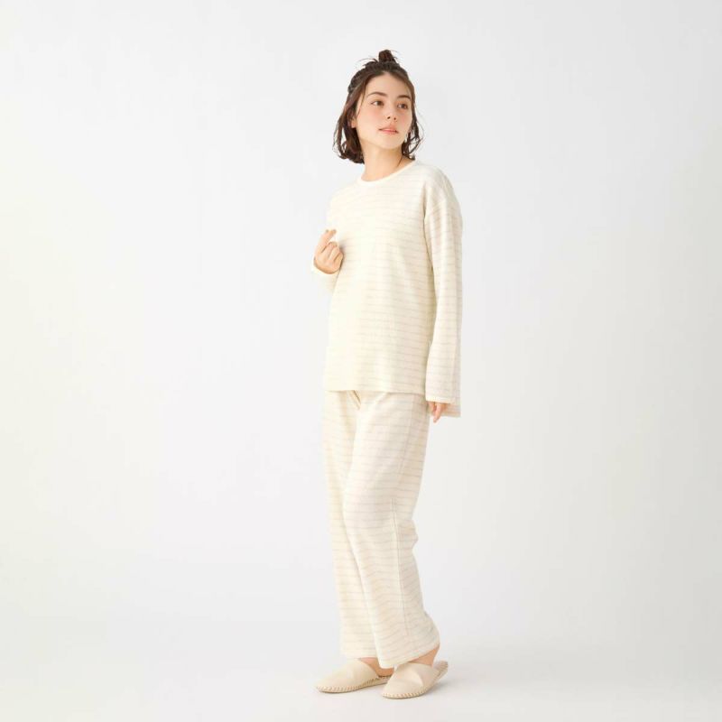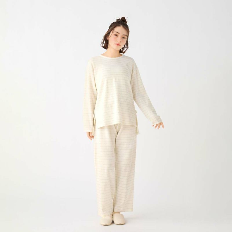 肌側がコットン100%のやさしい着心地のルームウエア。表はボーダー柄、裏は無地のダブルフェイス素材で、軽く柔らかな風合いが魅力です。ナチュラルな杢調の表情が心地よく、ロングシーズン活躍。リラックスタイムを心地よく過ごせるシリーズです。