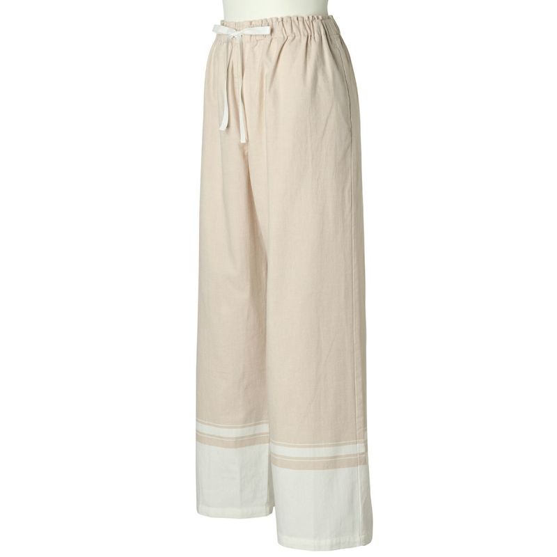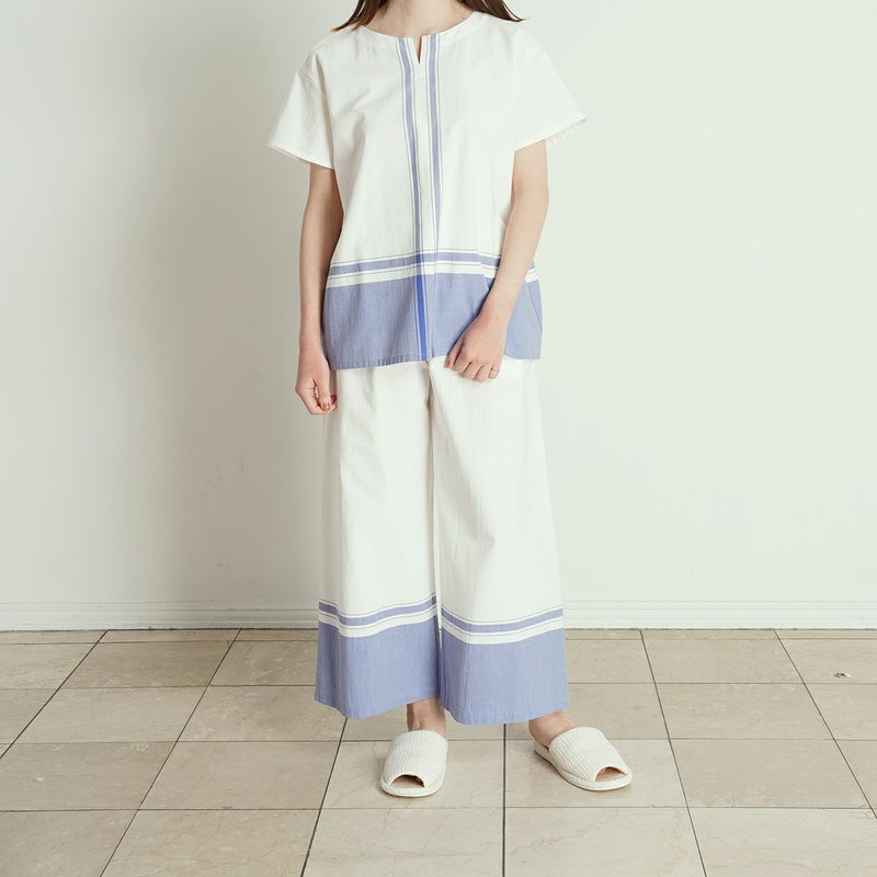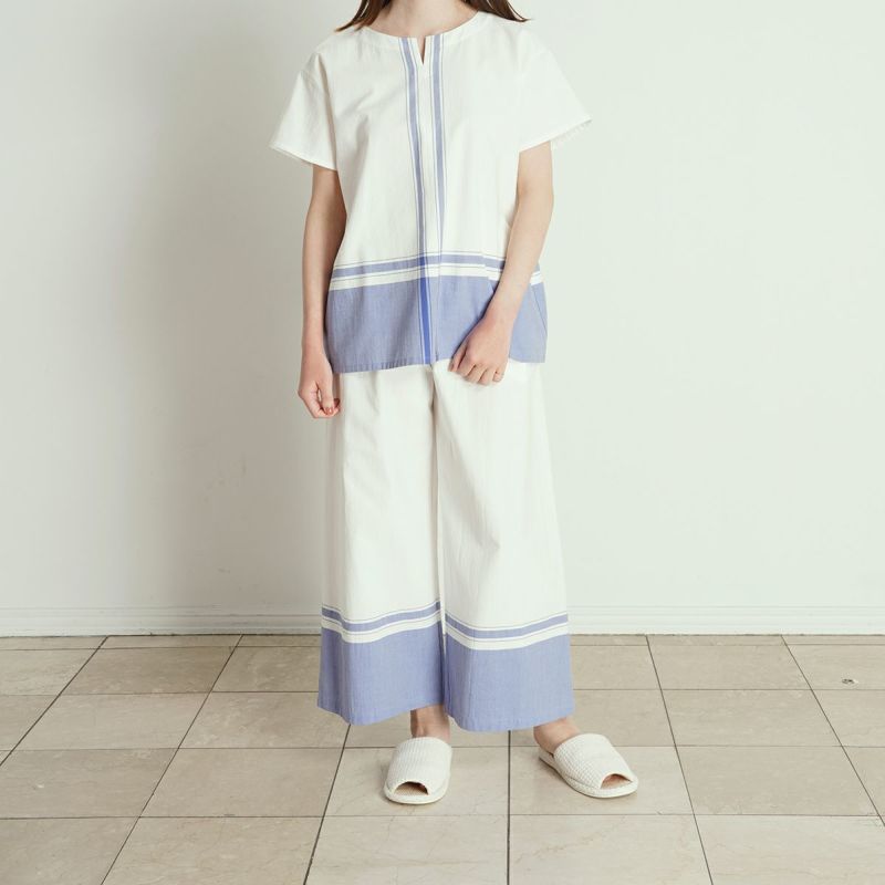 先染めのパネル柄を施したリラクシングウェアシリーズ。程よい厚みで透けにくい綾織り生地にワッシャー加工をし、しなやかさとナチュラル感のある素材。