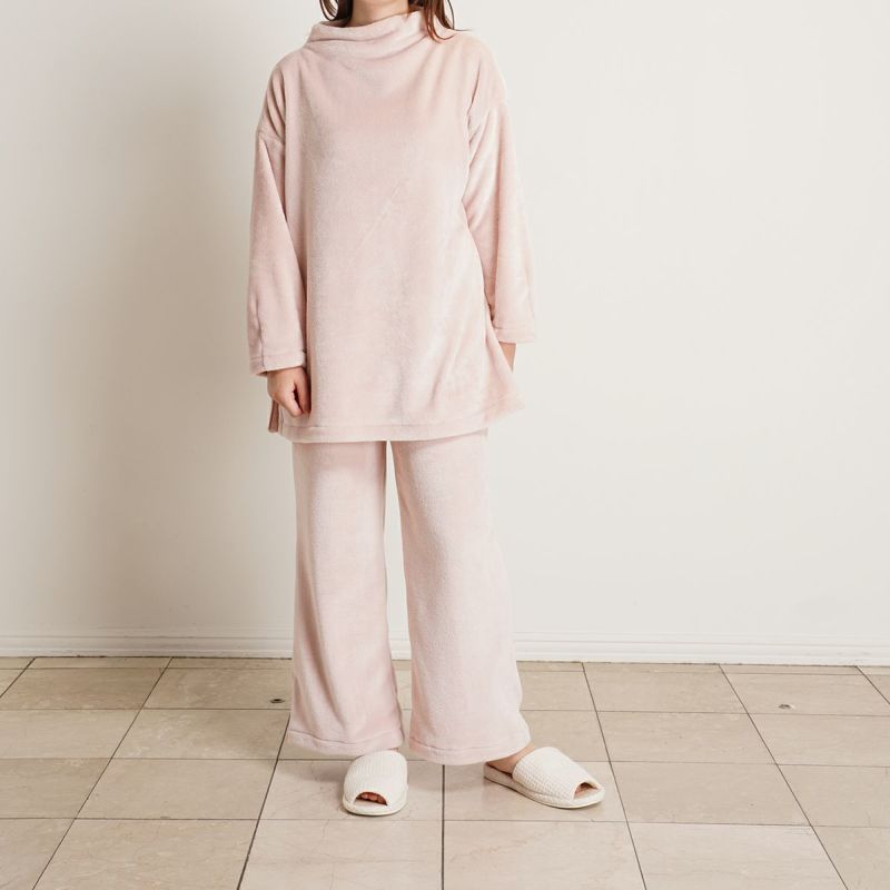 なめらかな肌触りのシャギー素材。ボリューミーな見た目ながら軽い着心地。シンプルなワンカラーの無地デザイン。