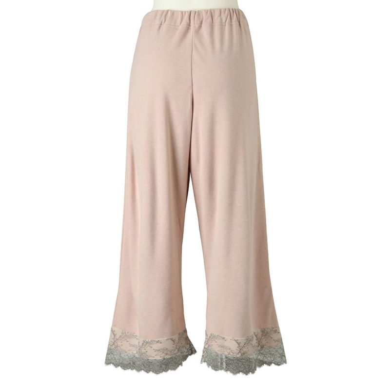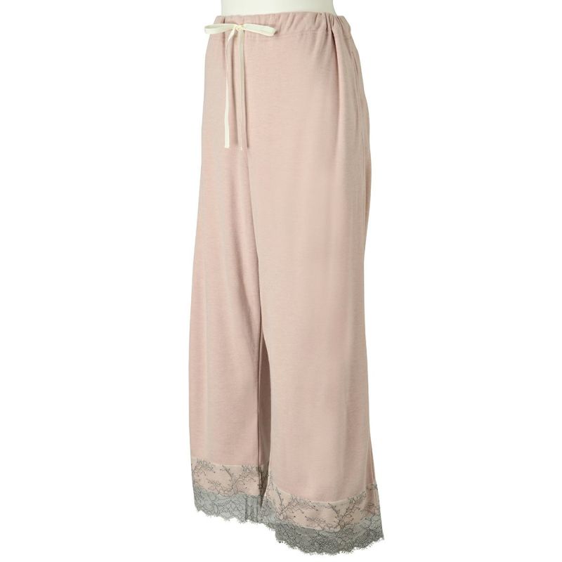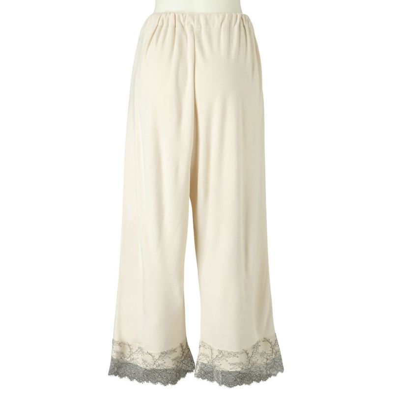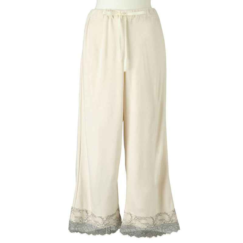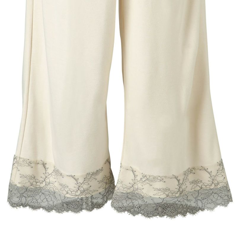 くるぶし丈ボトムスは、裾に重ねづけしたレース使いがデザインポイント。落ち感のあるストレートシルエットでリラックスタイムにおすすめ。
