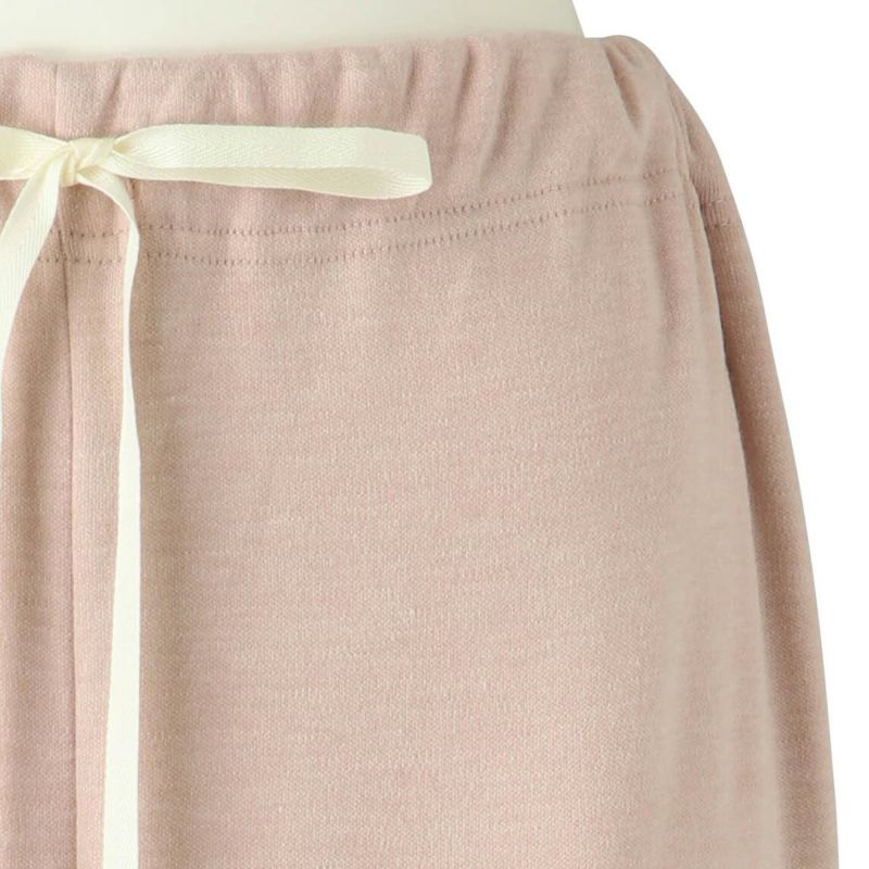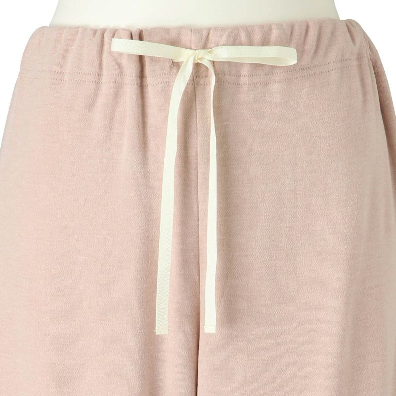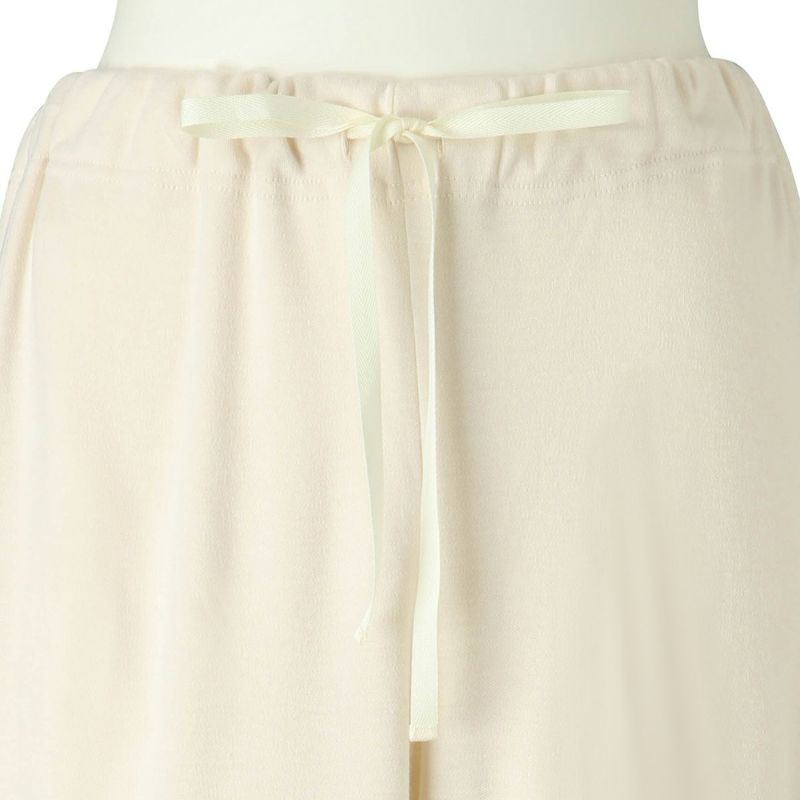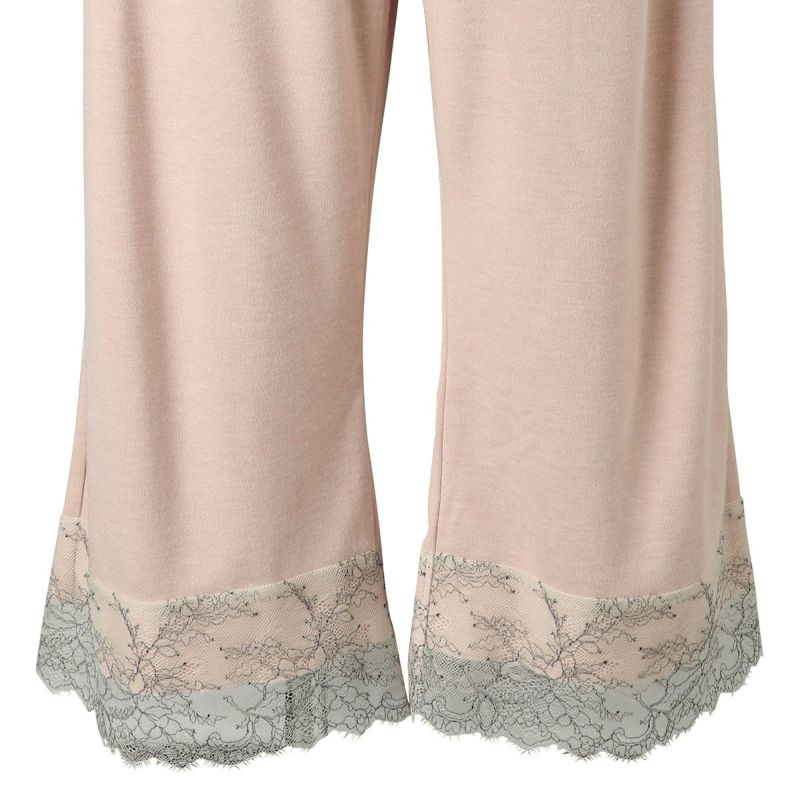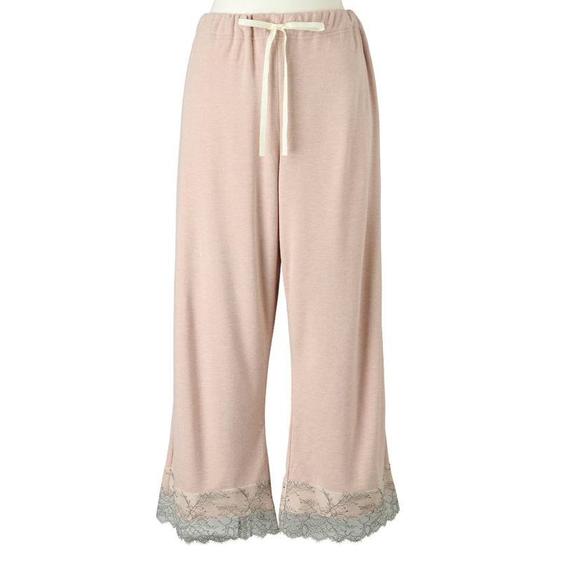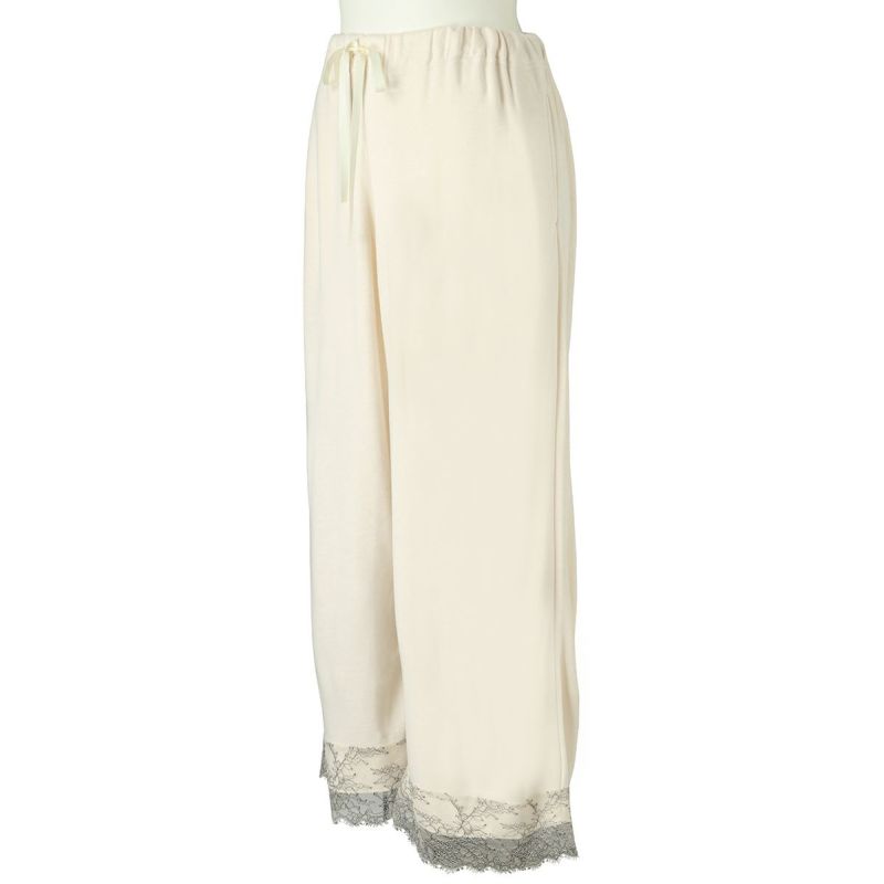 くるぶし丈ボトムスは、裾に重ねづけしたレース使いがデザインポイント。落ち感のあるストレートシルエットでリラックスタイムにおすすめ。