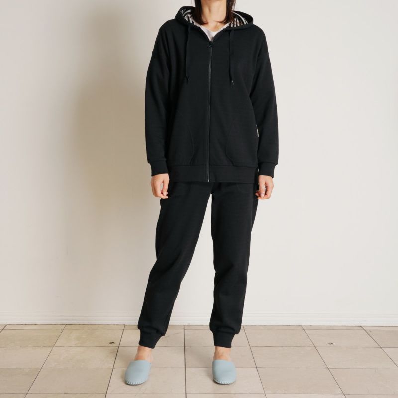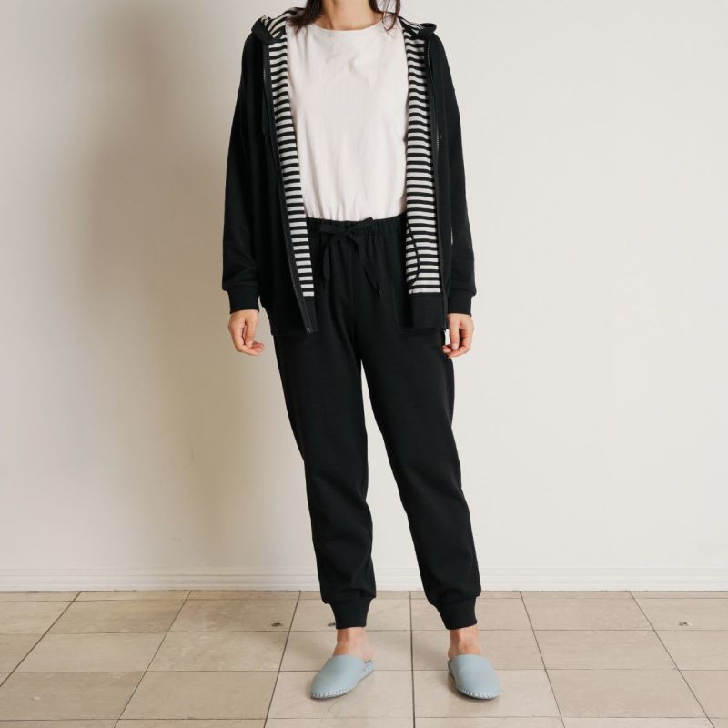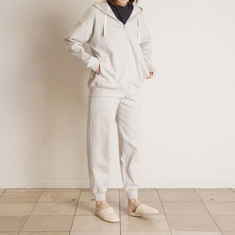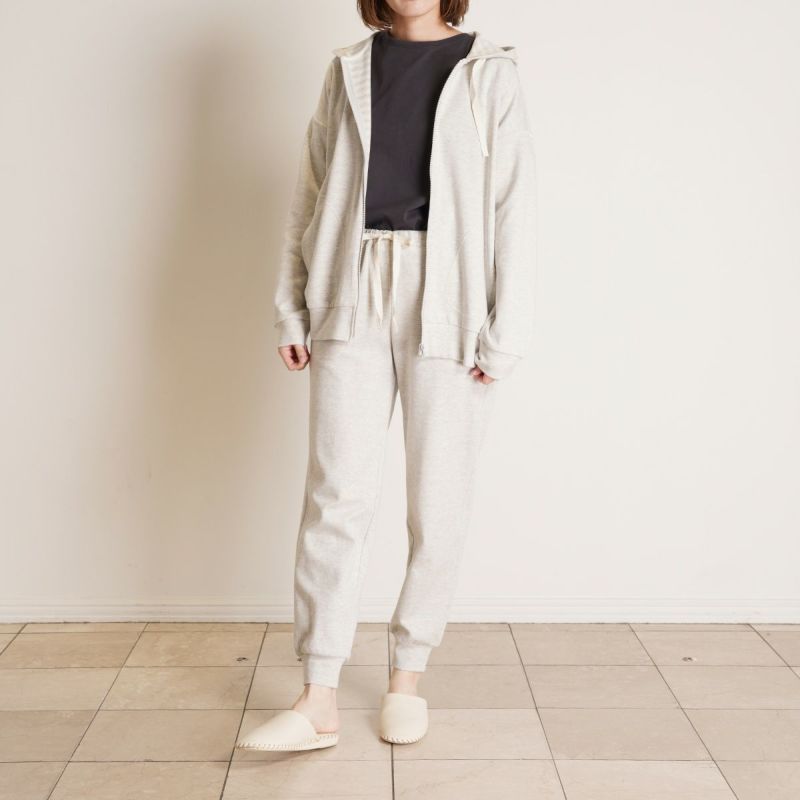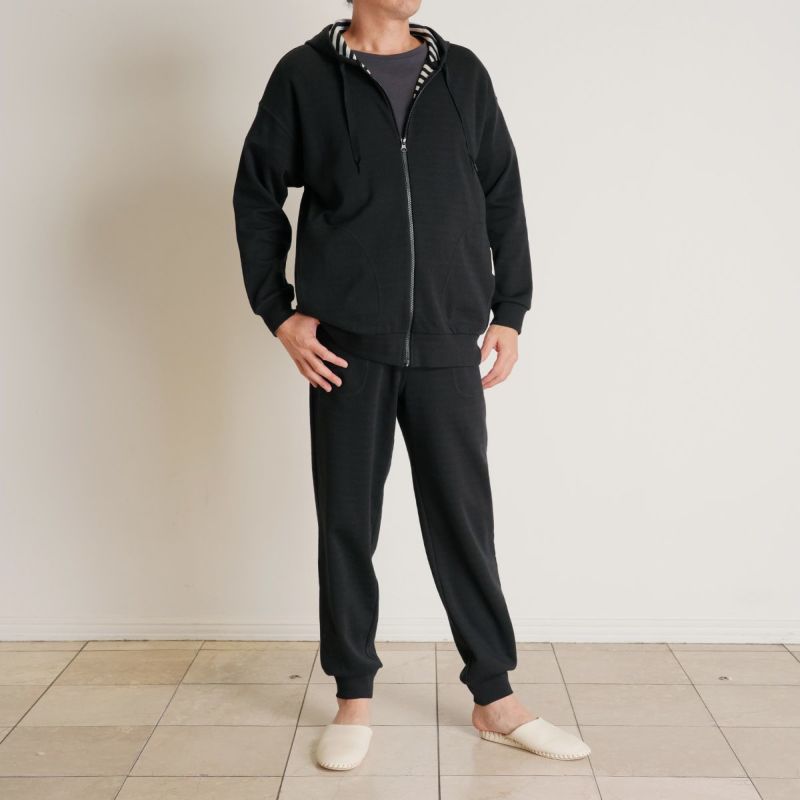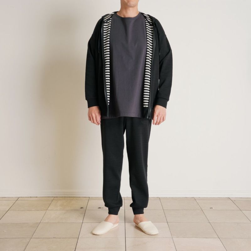 肌にあたる部分はコットンの新素材のダンボールニットシリーズ。二枚の生地を中糸で繋いだ二層構造にし中空構造のため見た目よりも軽く、適度なハリ感と着心地の良さが特徴です。ベーシックで着まわしやすいデザインとブラックとグレーのどんなアイテムともあわせやすい色展開。