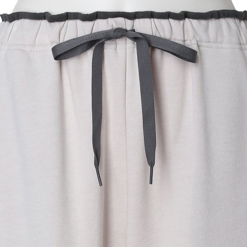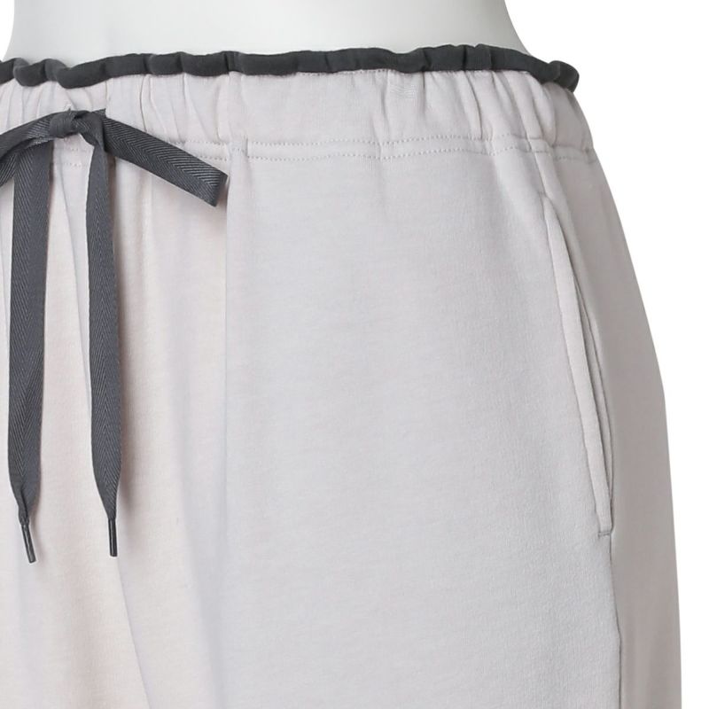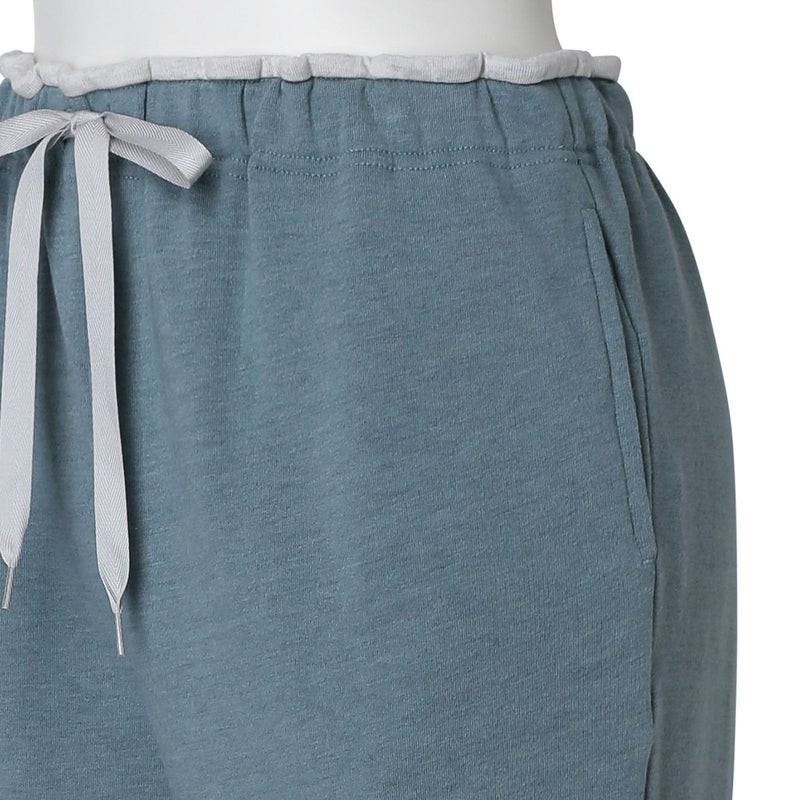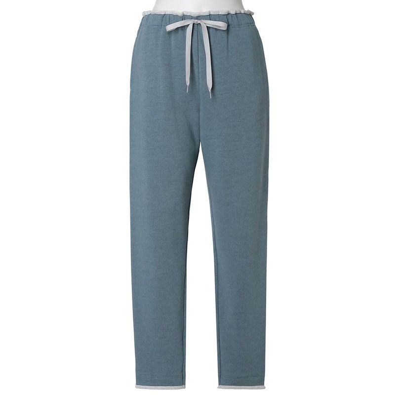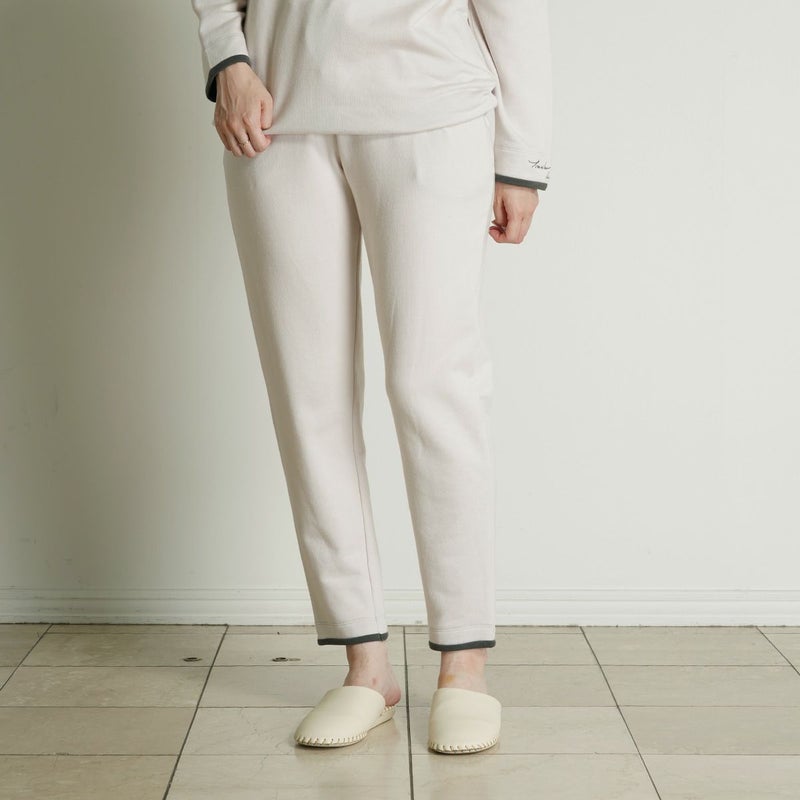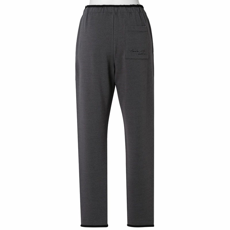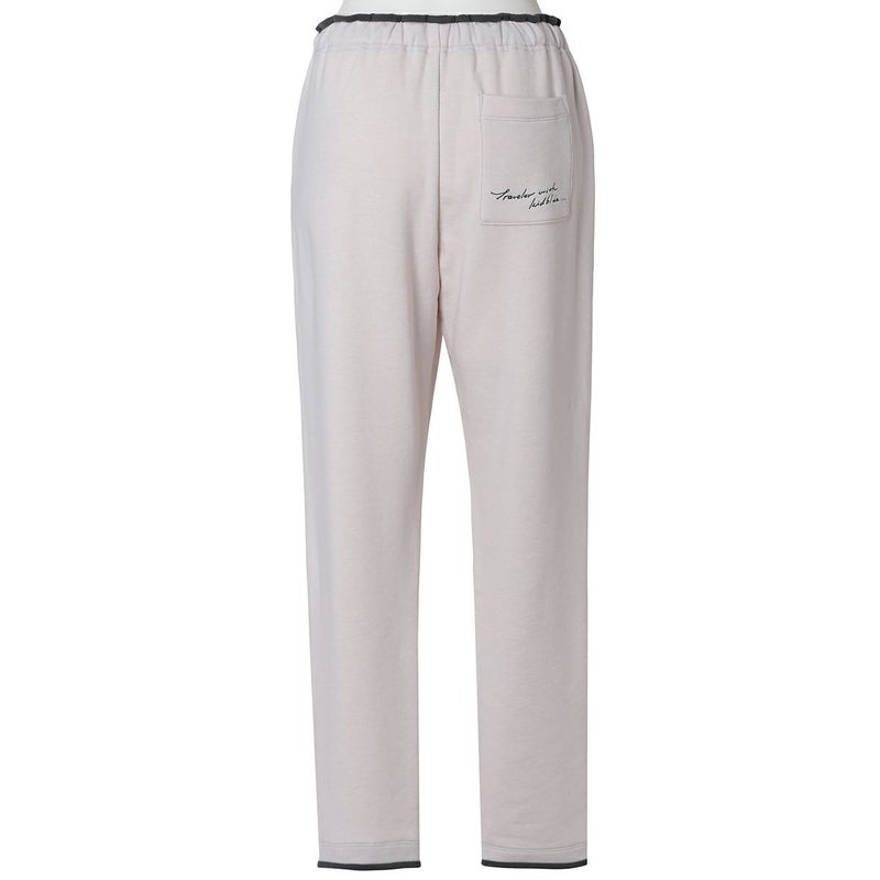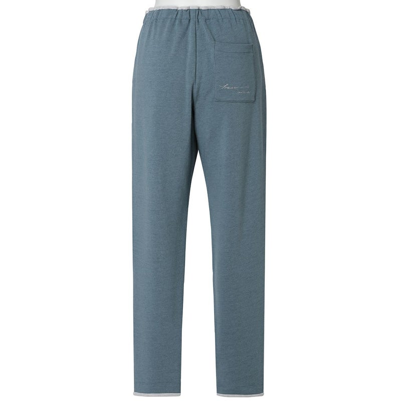 シンプルデザインの中にも、裾口やウエストに別布でさりげなく施した切替や、ポケットの「Traveler with kidblue」の刺しゅうがアクセントになったボトムス。