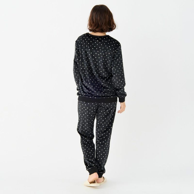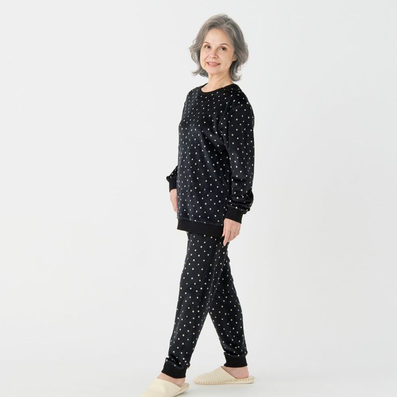 キッドブルーの冬の人気素材、ストレッチシャギーシリーズがドット柄で登場。滑らかで柔らかく着心地の良さが魅力。縦横に伸びるストレッチの効いた伸縮性の良さも特徴です。身生地にランダムドットを施したオリジナル素材。