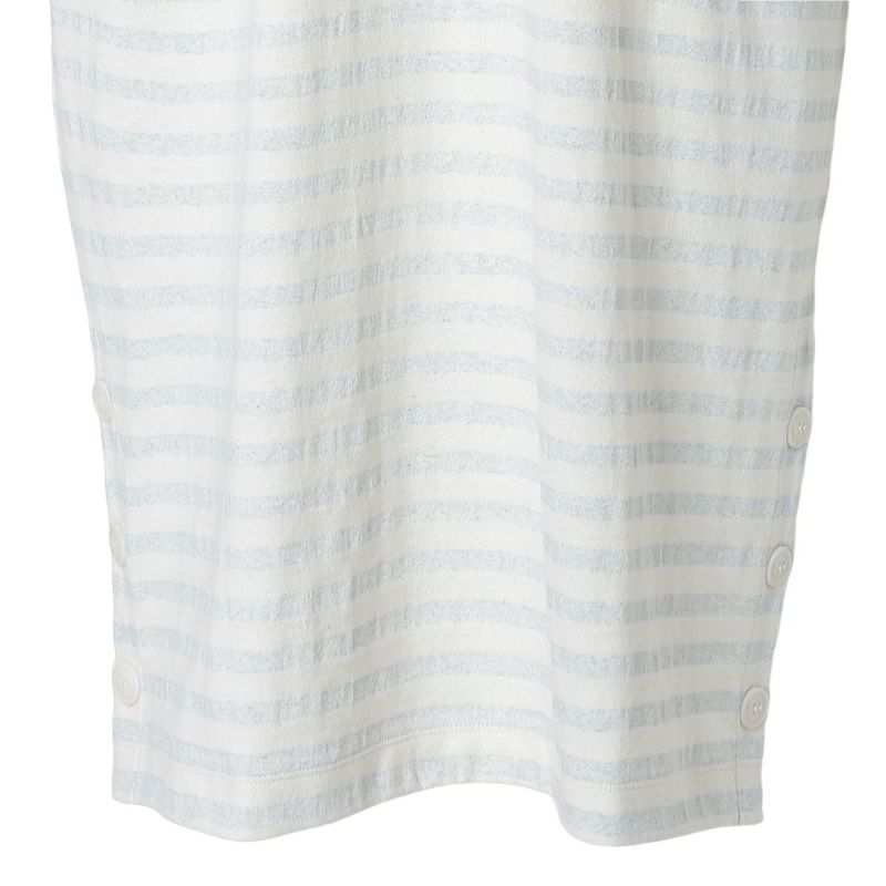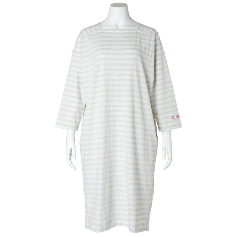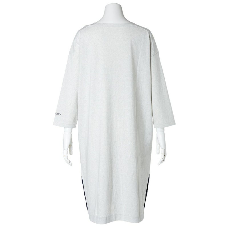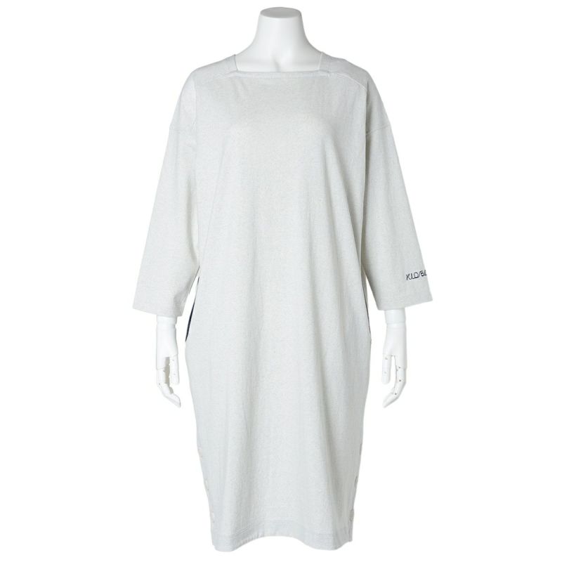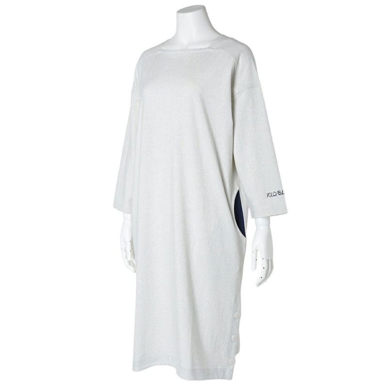 脇ボタンあきの裾にスリットがポイントのワンピース。ポケットには配色布が施されたワンピース。袖は絶妙な丈感の9分袖で、1枚でもすっきりと着用いただけます。