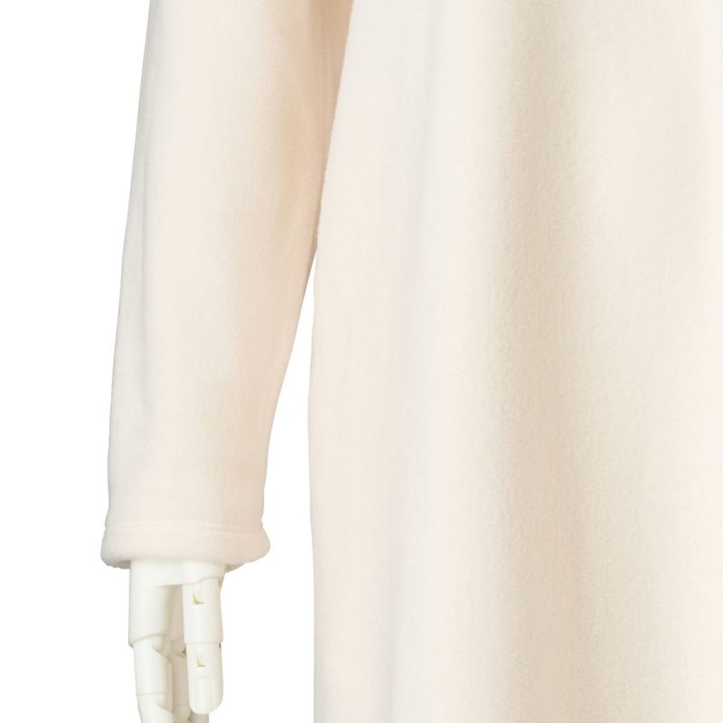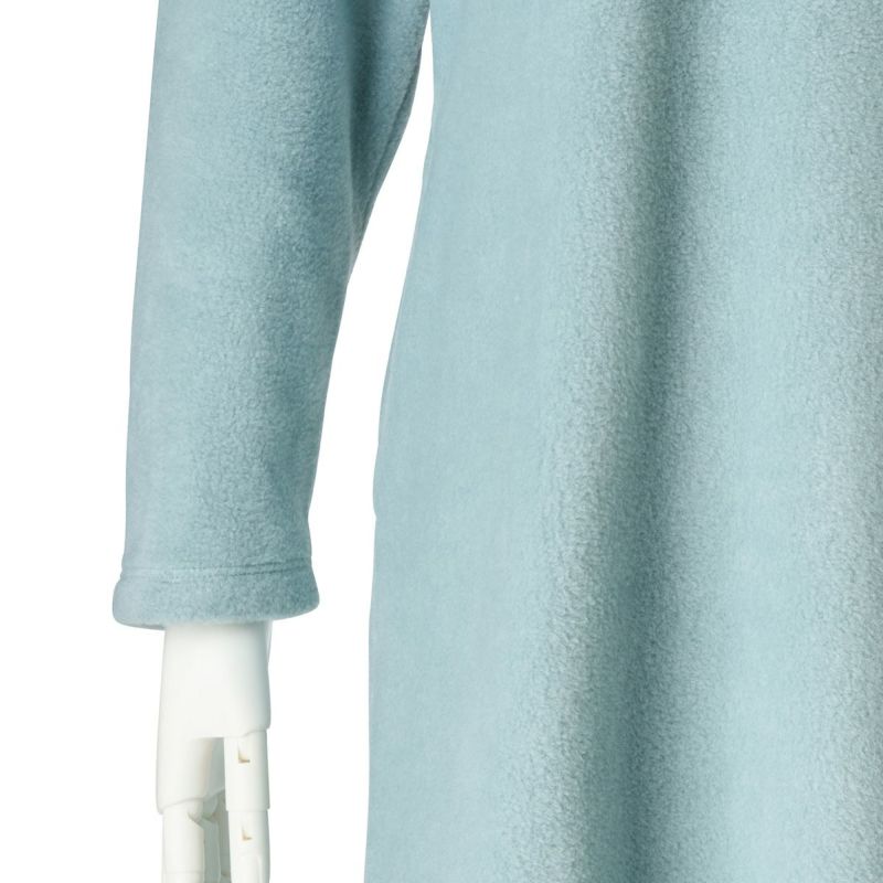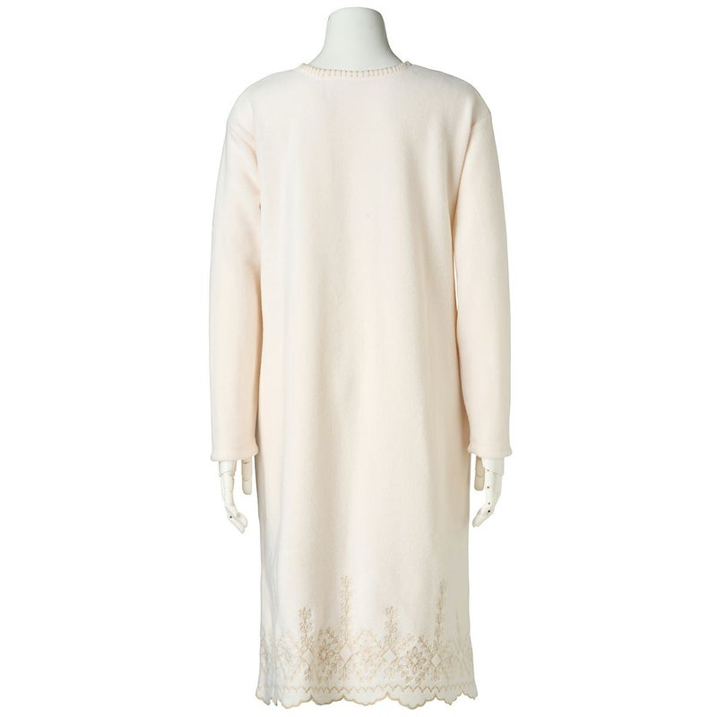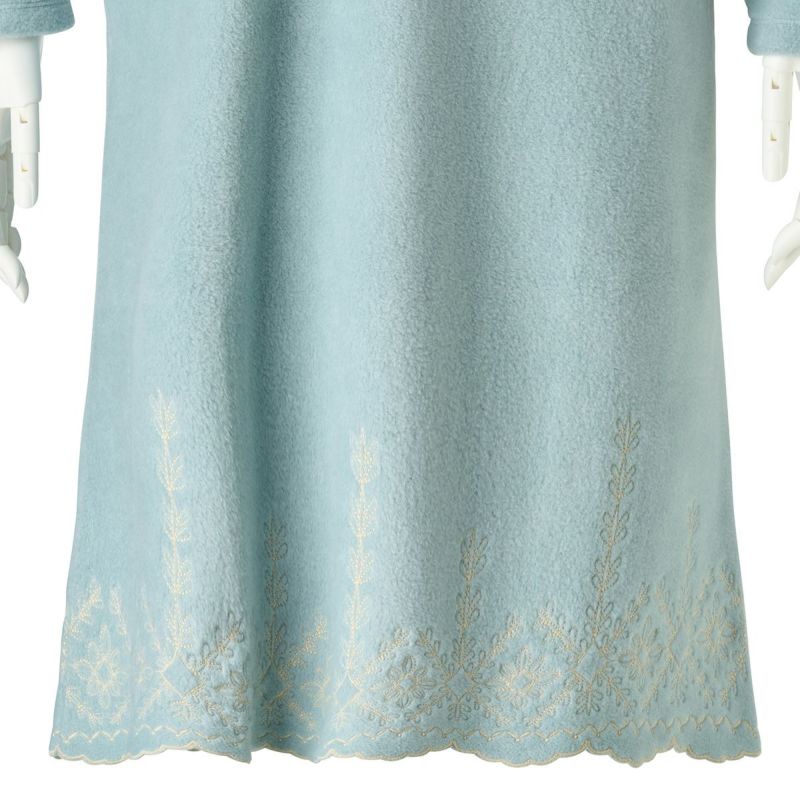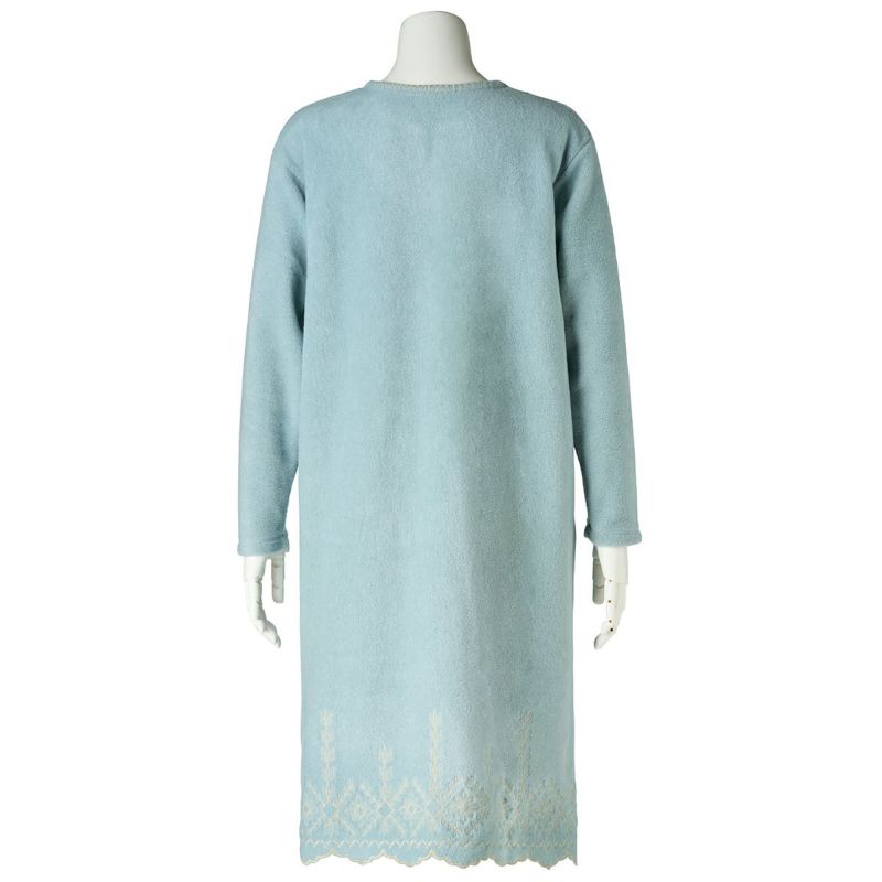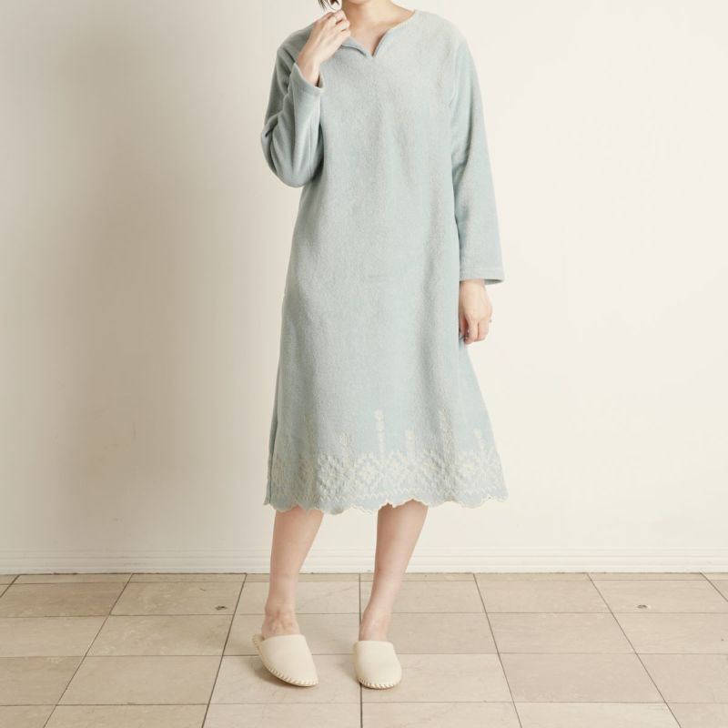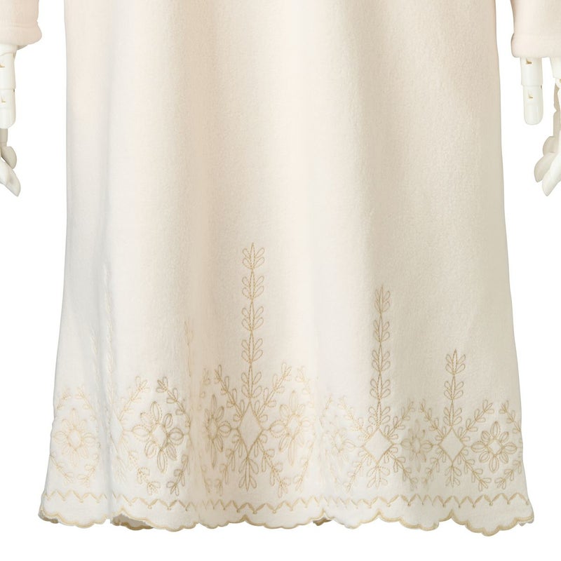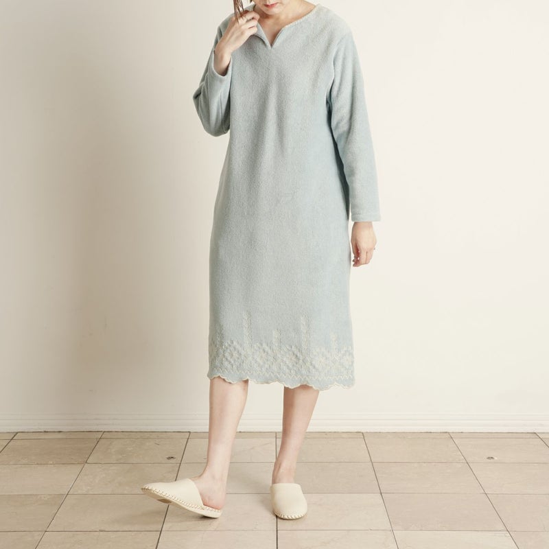 レース柄のような刺しゅうモチーフが素敵なフリースシリーズ。あたたかく軽く着やすい、キッドブルー冬の定番素材。レーヨン混のフリースはしなやかで滑らか。ソフトなあたかみのある印象のアイボリーとユーカリの2色展開。