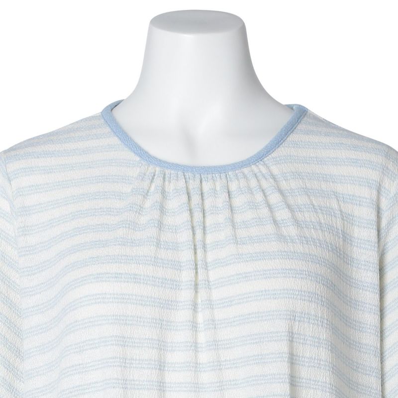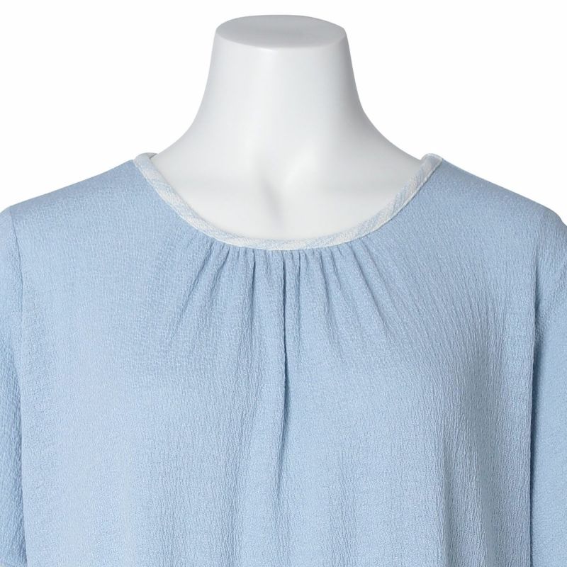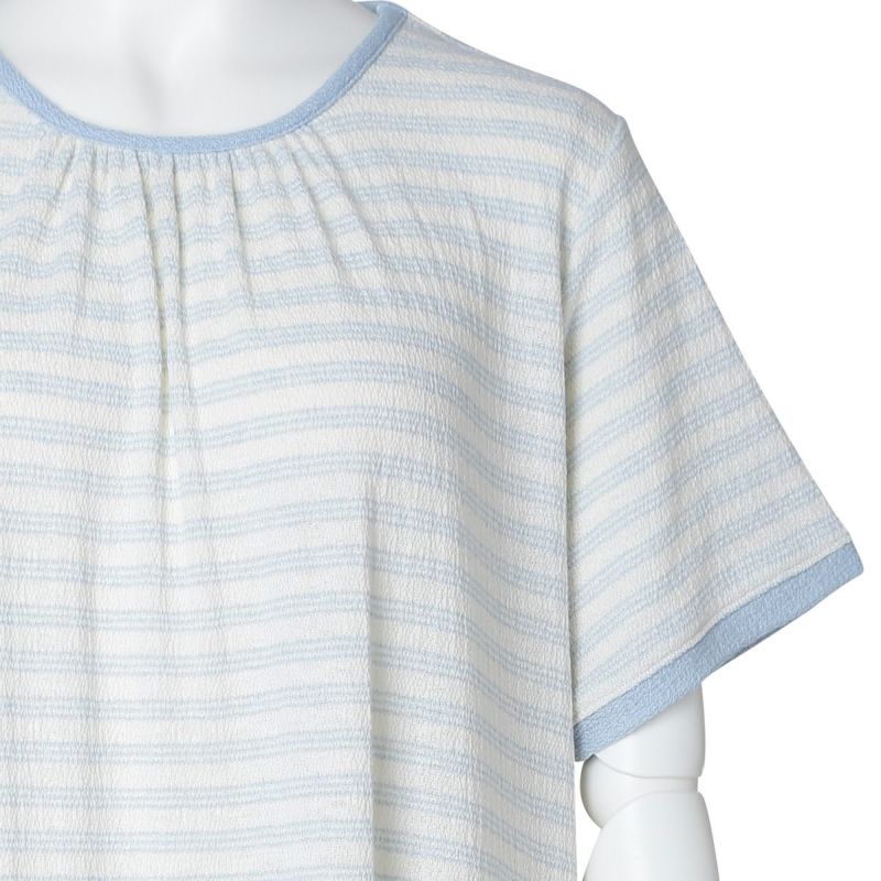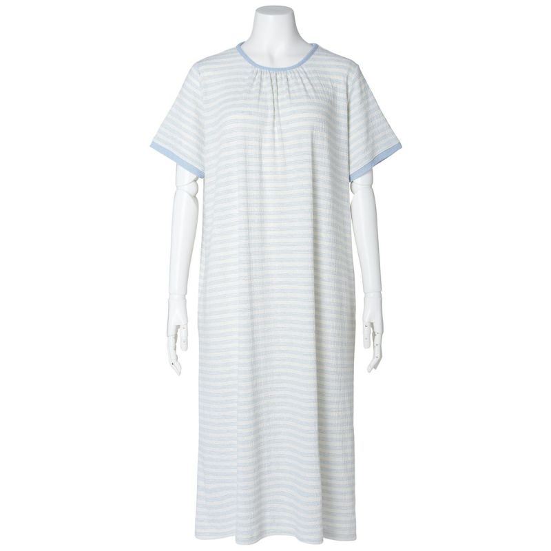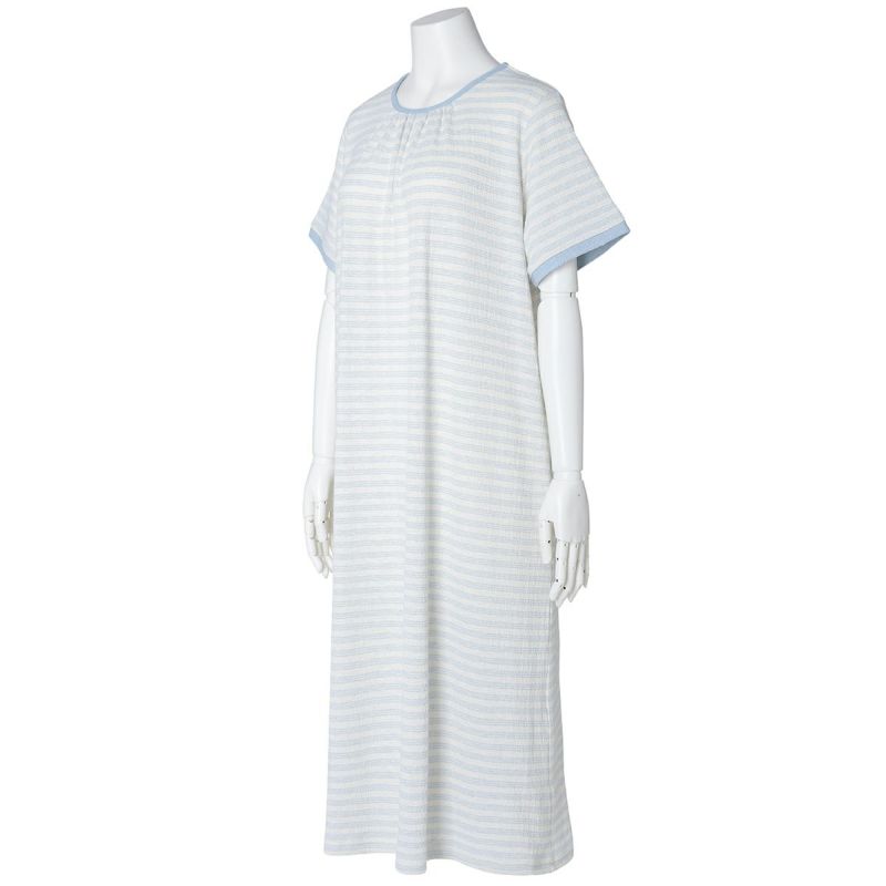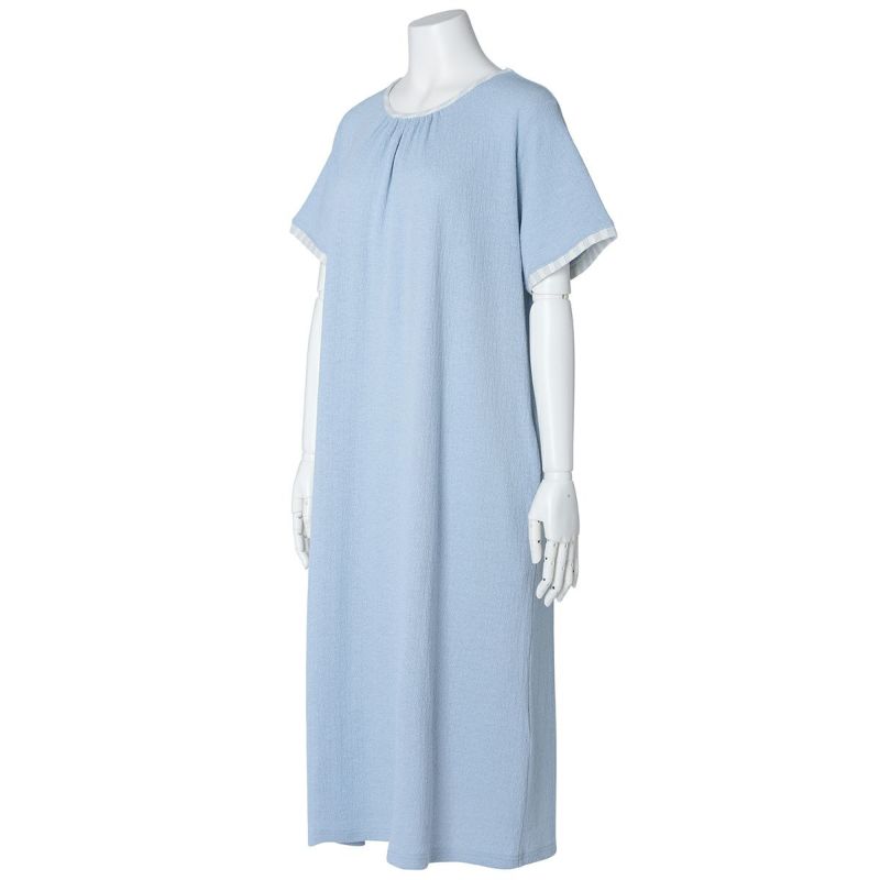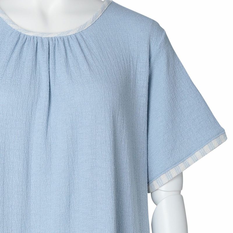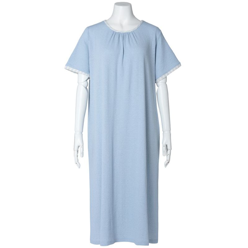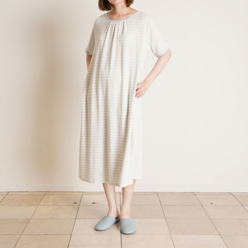 半袖ワンピースは、胸元に寄せたギャザーがデザインポイント◎一枚でさらりと着用でき、お部屋着はもちろんナイトウエアにもおすすめ。適度な伸度があり締め付け感がないので夏のおうち時間を快適に過ごすことができます。