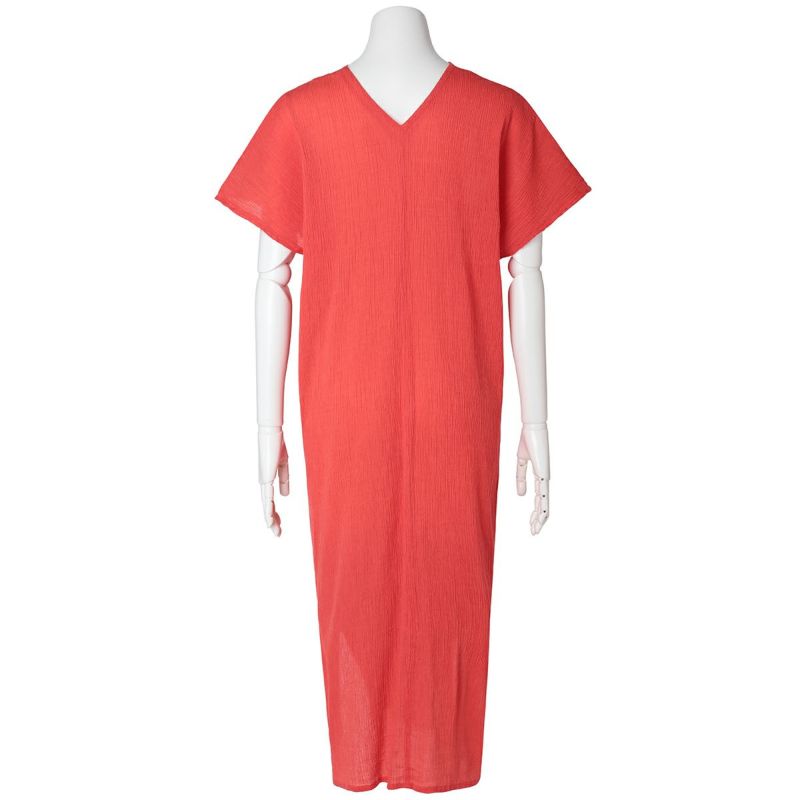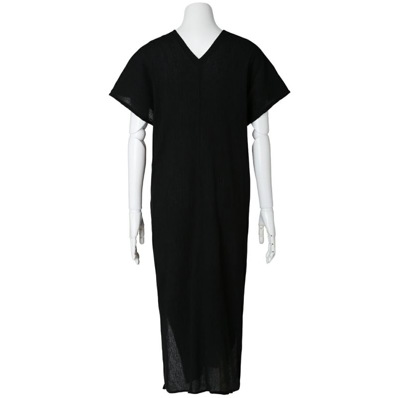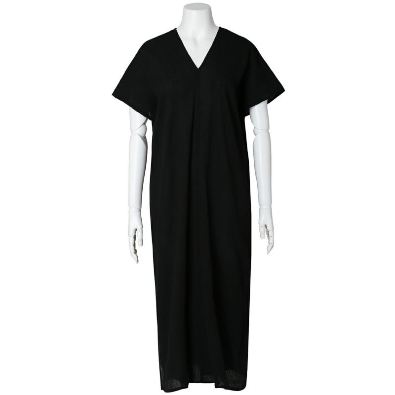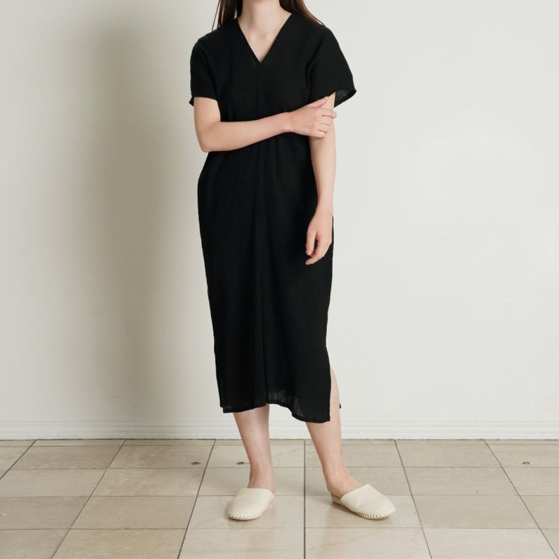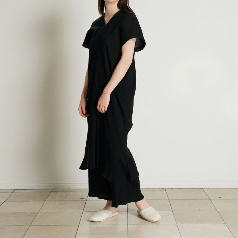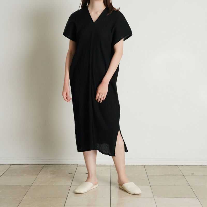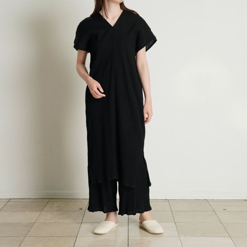 シンプルなシルエットでVネックがすっきり見せるワンピース。かぶって楽に着用できる。身頃から続く袖で縫い目をなくしよりリラクシーに。1枚での着用はもちろん同素材のボトム(KRBP573)と合わせワンマイルや旅行にもおすすめ。