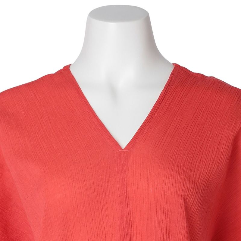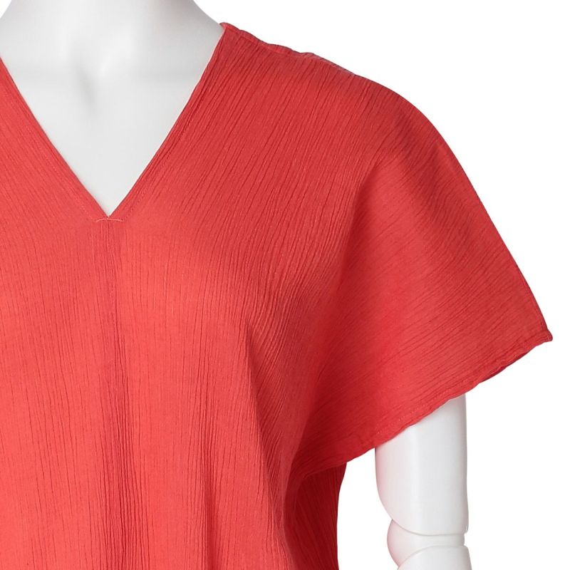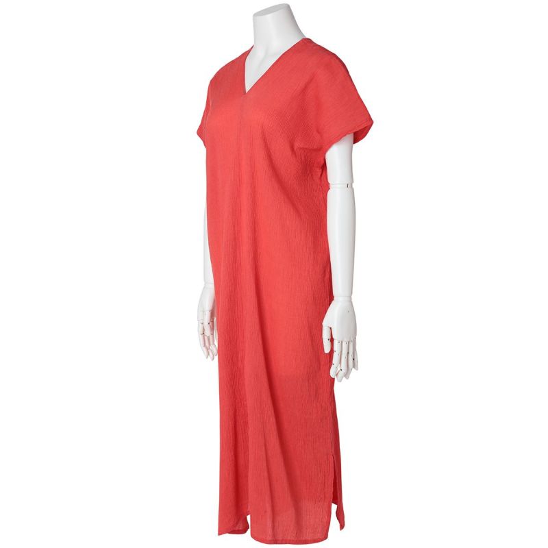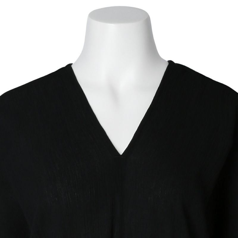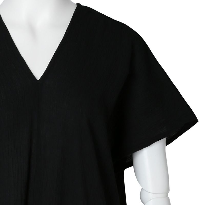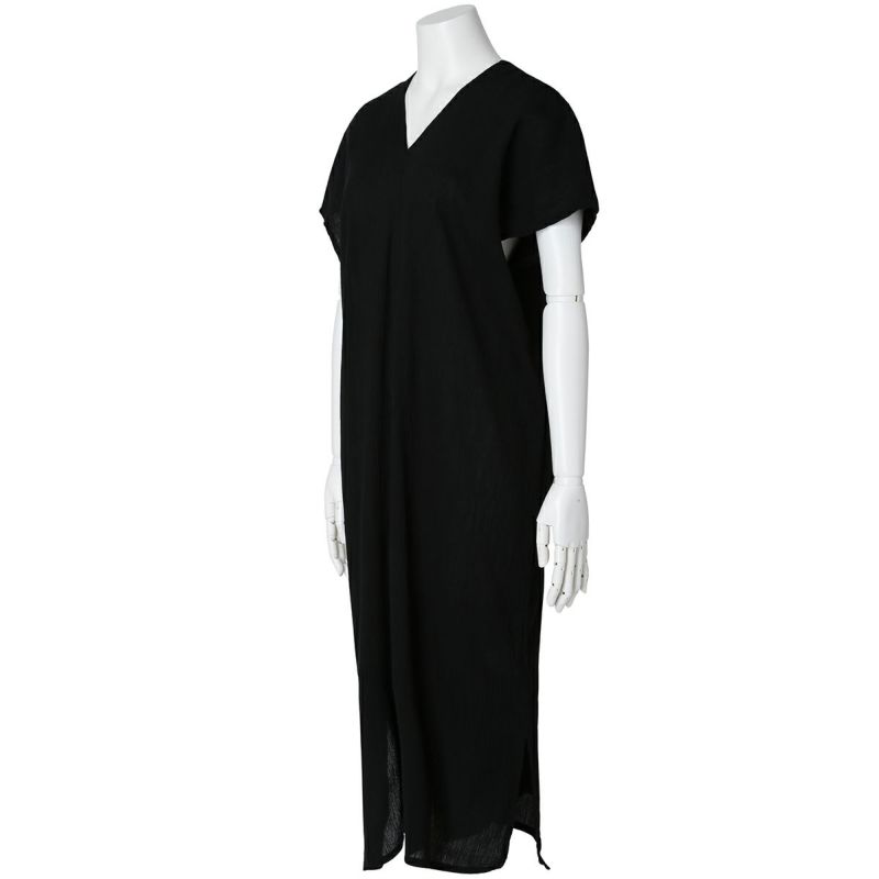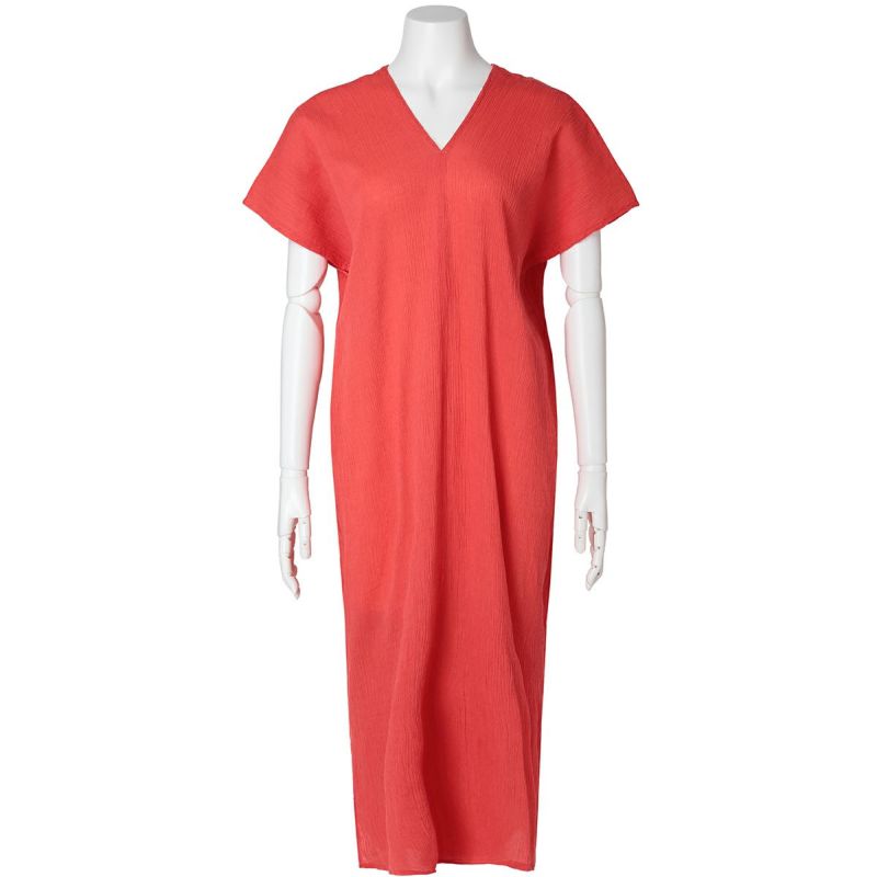 シンプルなシルエットでVネックがすっきり見せるワンピース。かぶって楽に着用できる。身頃から続く袖で縫い目をなくしよりリラクシーに。1枚での着用はもちろん同素材のボトム(KRBP573)と合わせワンマイルや旅行にもおすすめ。