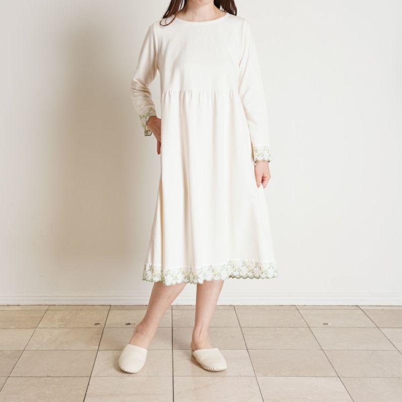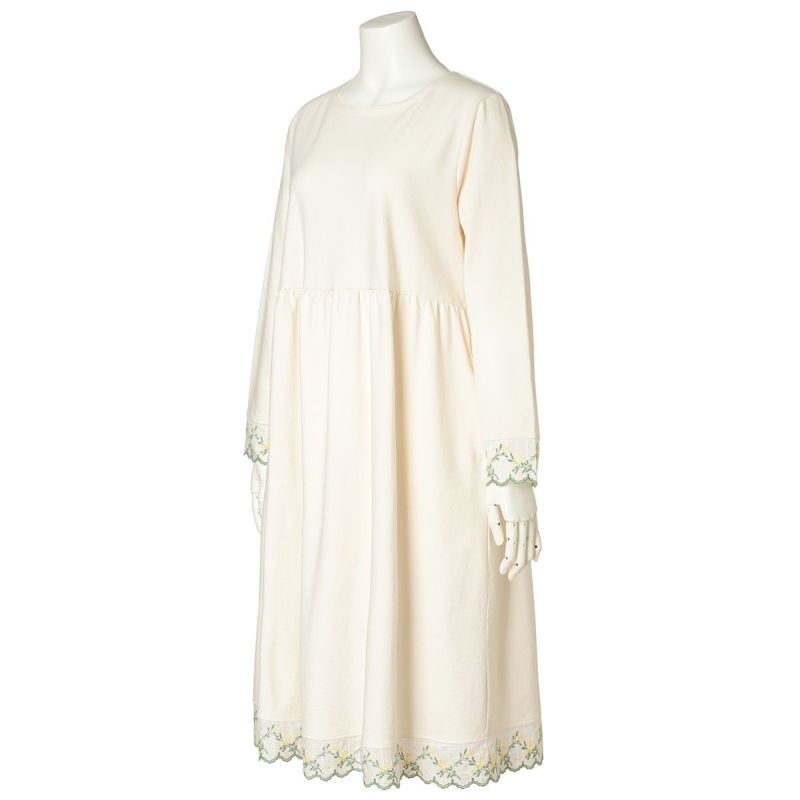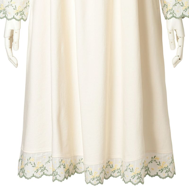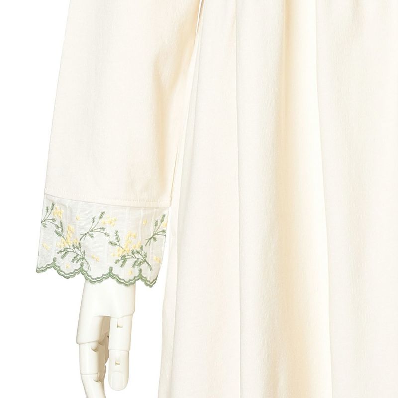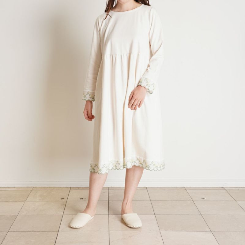 袖や裾にあしらったミモザエンブレースが華やかさを添える長袖ワンピース。リラックス感を大切にしたややゆったりとしたシルエット。体のラインを拾いにくいハイウエストのギャザー切り替えで、気になる部分をカバーできる人気のデザイン。
