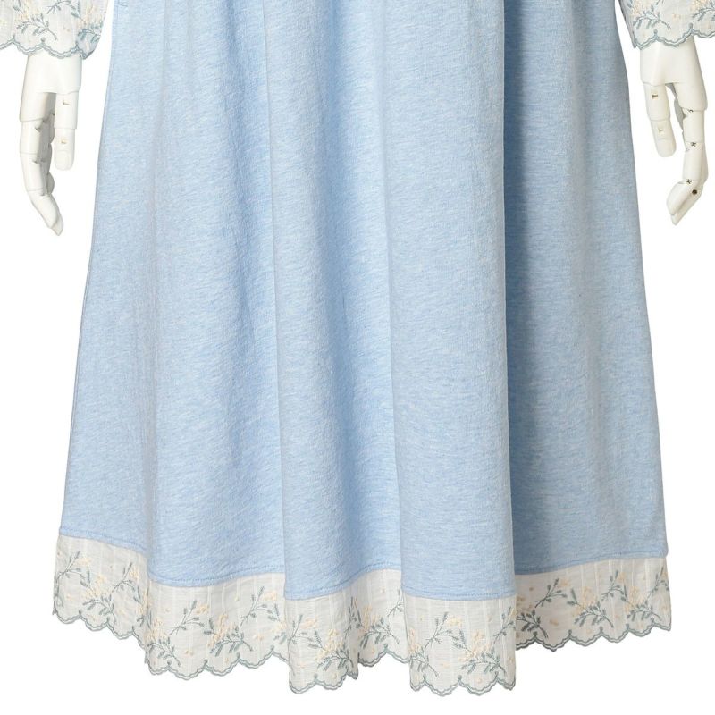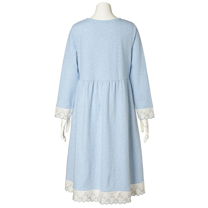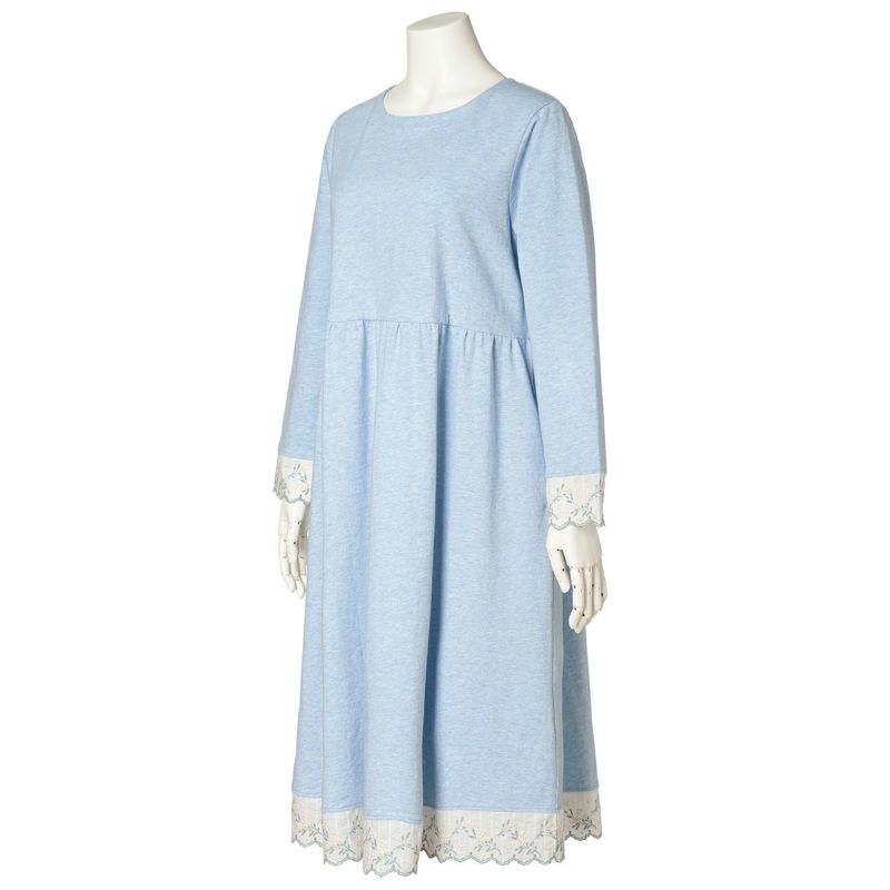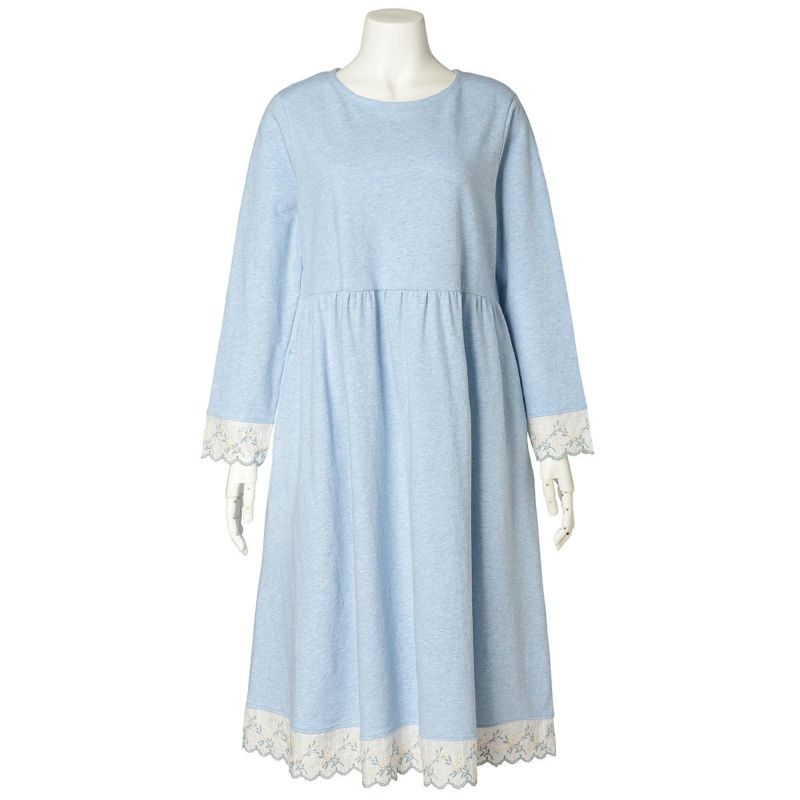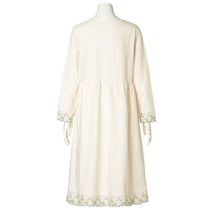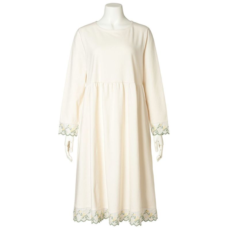 袖や裾にあしらったミモザエンブレースが華やかさを添える長袖ワンピース。リラックス感を大切にしたややゆったりとしたシルエット。体のラインを拾いにくいハイウエストのギャザー切り替えで、気になる部分をカバーできる人気のデザイン。