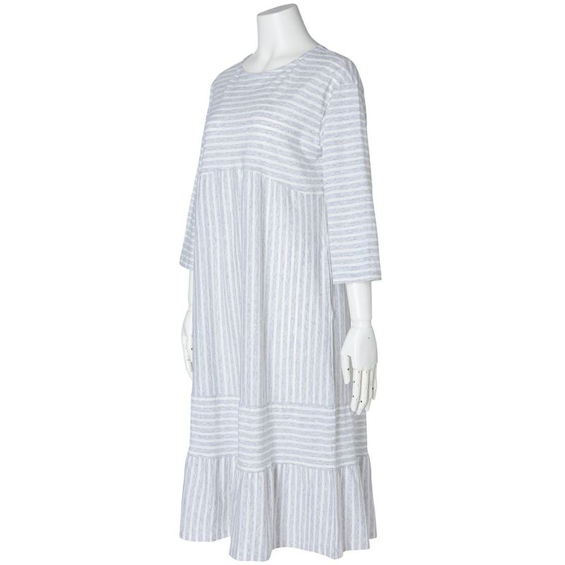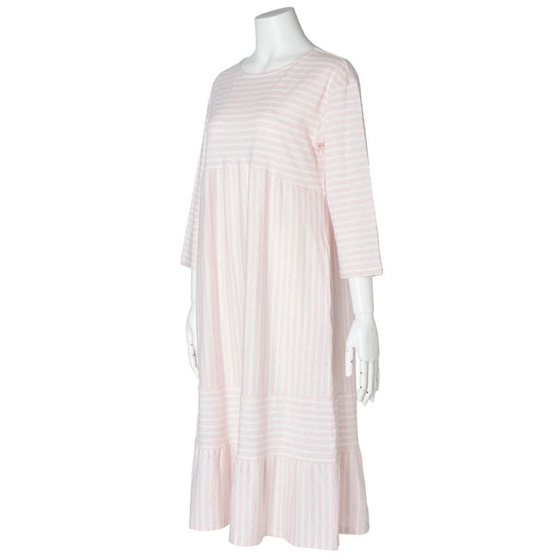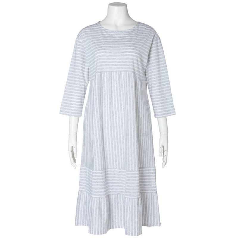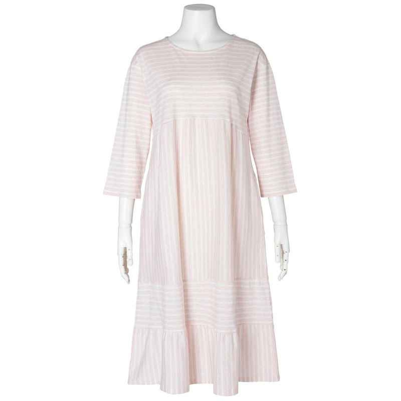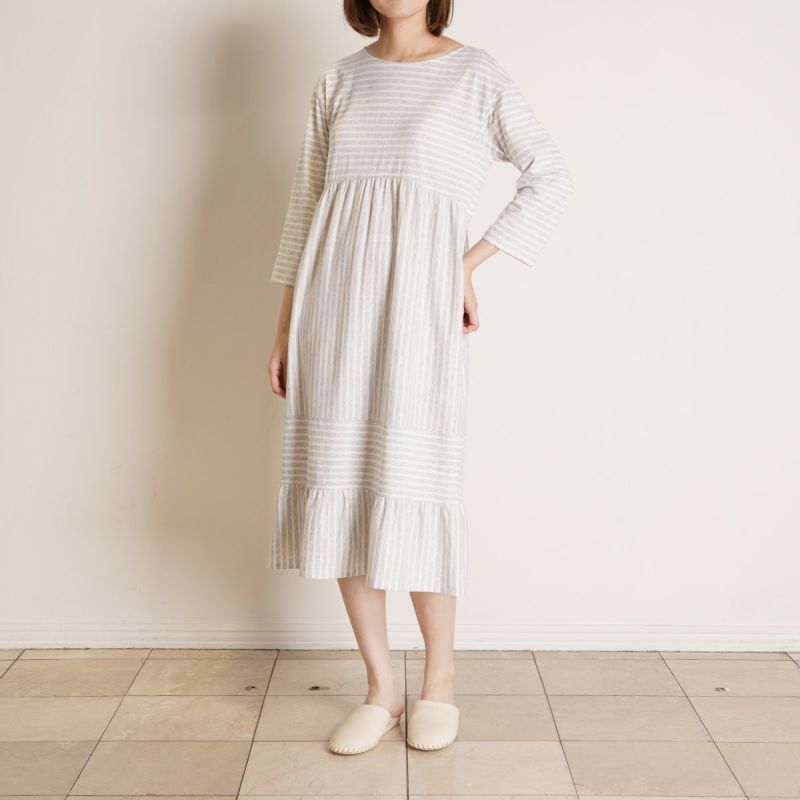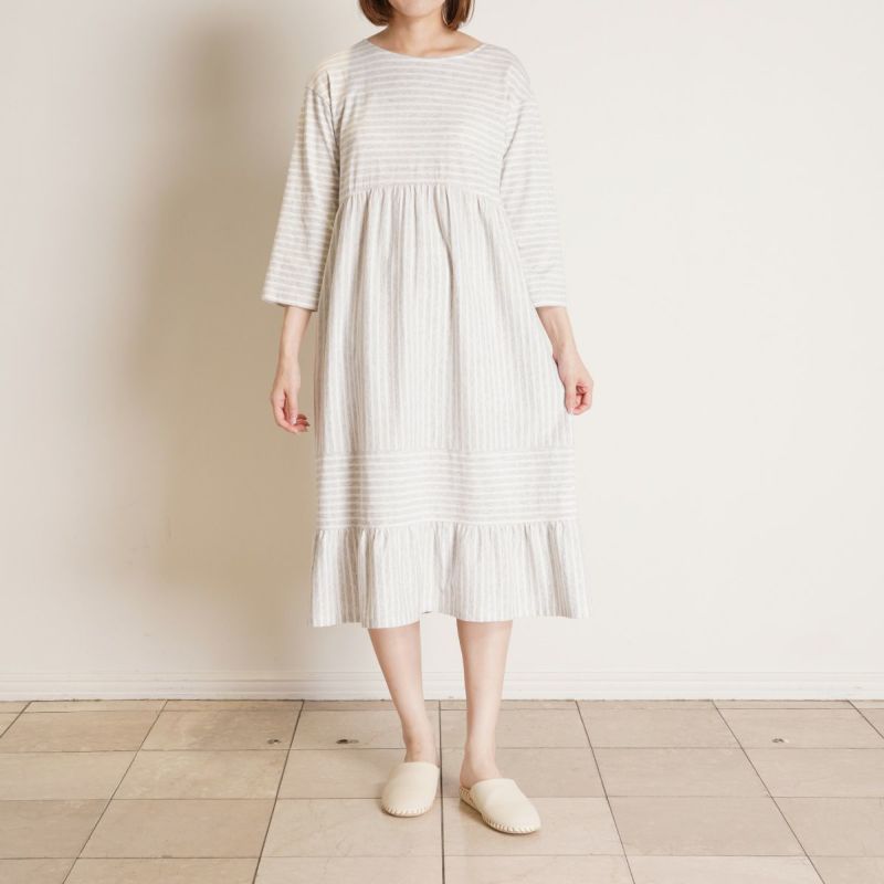 8分袖ワンピースは、女性らしいAラインシルエット×ドロップショルダー。生地のタテヨコ方向を変えたこだわりのデザインで、おうち時間が楽しくなるような主役級の1枚です。スパッツやレギンス・ソックスを合わせて着こなしても◎