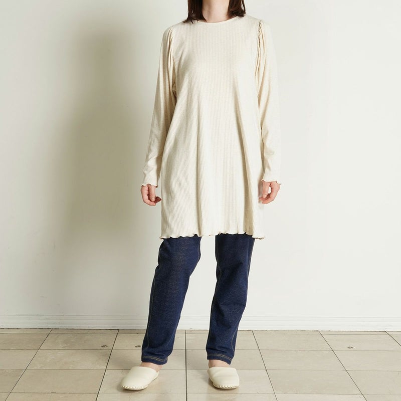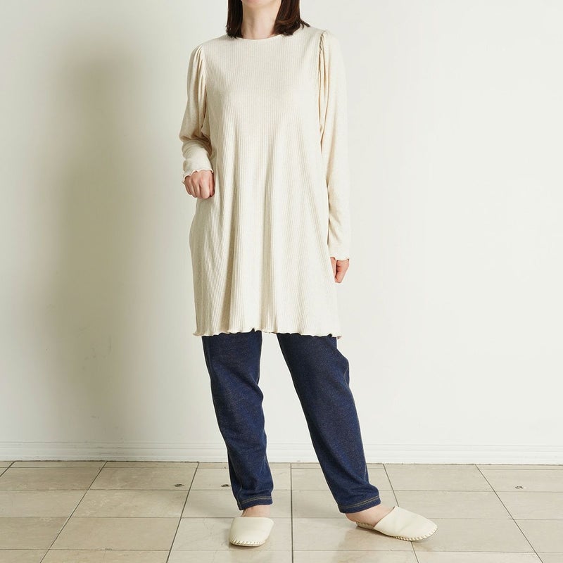 ギャザーを入れたドルマンスリーブが大人のリラックス感あふれるチュニック。裾やメロウ始末を施した袖口が、シンプルな中にも女性らしさプラス。身頃はワイドリブでソフトな着心地。コーディネートも楽しめるアイテムです。